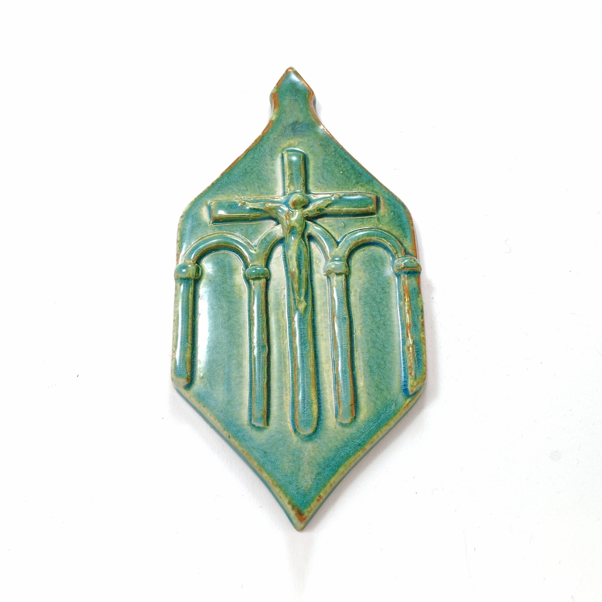 Angelo verde rame formella realizzato e dipinto a mano in maiolica di Faenza. Dimensioni: 22 x 11 cm