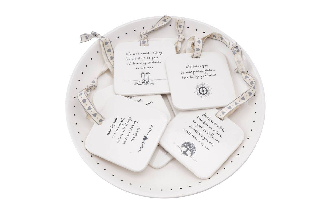 Presentiamo il nostro piatto rotondo in ceramica con 12 appendini assortiti: la perfetta combinazione di funzionalità e stile per l’arredamento della tua casa. Il set comprende 4 stelle, 4 cuori e 4 casette, ognuno decorato con una delicata illustrazione e uno slogan speciale. Gli slogan sono: Shine Bright, Reach For The Stars, Never Lose Your Sparkle, Dream Big, A Sister Is A Friend For Life, You Are My Sunshine, You're A Whole Lot Of Lovely, Best Friends Forever, Home Is Where The Heart Is, Home Sweet Home, This Is Our Happy Place, Love Makes A House A Home. Realizzati in ceramica di alta qualità, sia il piatto che gli appendini sono resistenti e durevoli per garantire lunga vita al prodotto. La palette di colori neutri si integra facilmente con ogni stile di arredamento, rendendolo un’aggiunta armoniosa per la tua casa. Dimensioni prodotto: Altezza 9,5 cm, Larghezza 6,5 cm, Profondità 0,5 cm. Design da Cornwall, collezione Send With Love by CGB Giftware | Codice articolo: GB01450