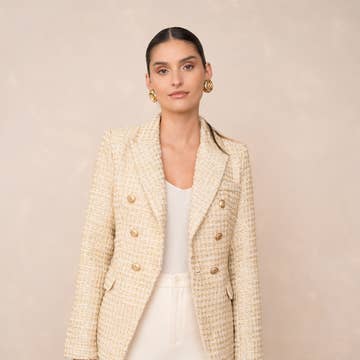 Un capo straordinario da qualsiasi angolazione. Questo blazer con ritagli ha dettagli in oro ed è realizzato in lino strutturato con una silhouette classica da blazer. Revers a dente Ritagli anteriori e posteriori Tasche Foderato Tessuto dall'India A causa della natura di questo tessuto, ci sarà un aspetto testurizzato, piccoli noduli che possono sembrare imperfezioni del filo ma sono semplicemente il modo in cui è stata creata la trama del lino.
