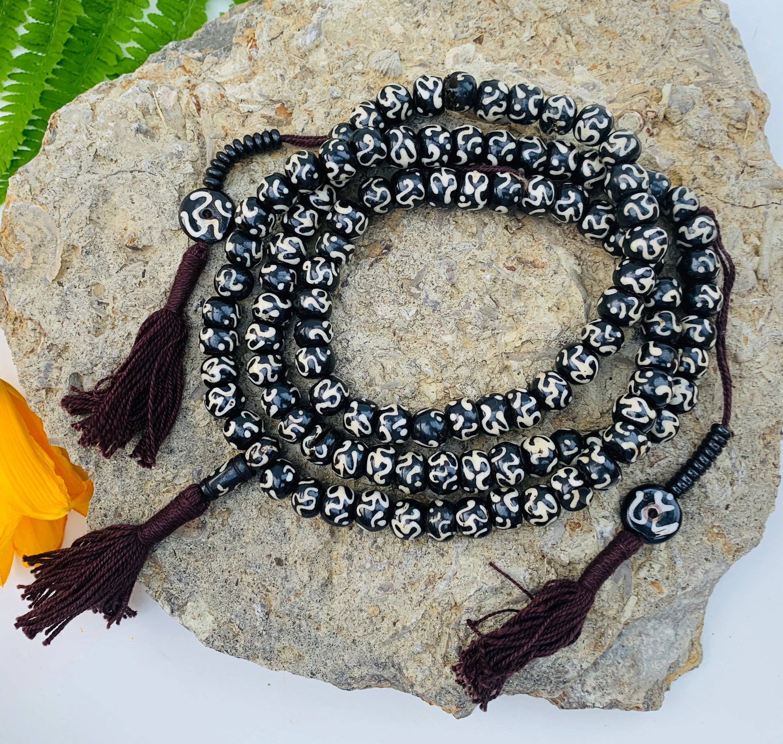 Un mala veramente intenzionale: perline di semi di Bodhi da 46" con tre accenti in conchiglia incisi con l'Om, un cordoncino regolabile rosso e oro e una scatola di legno per la conservazione, realizzato per una pratica significativa. Ottima qualità!!