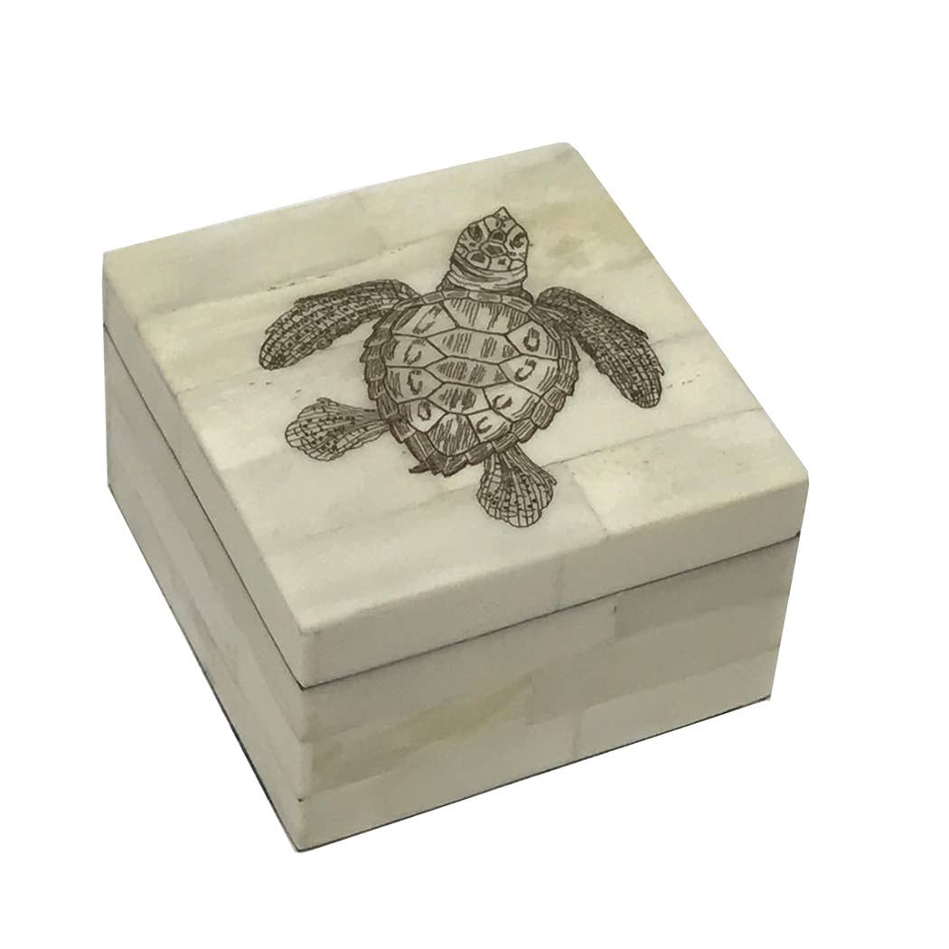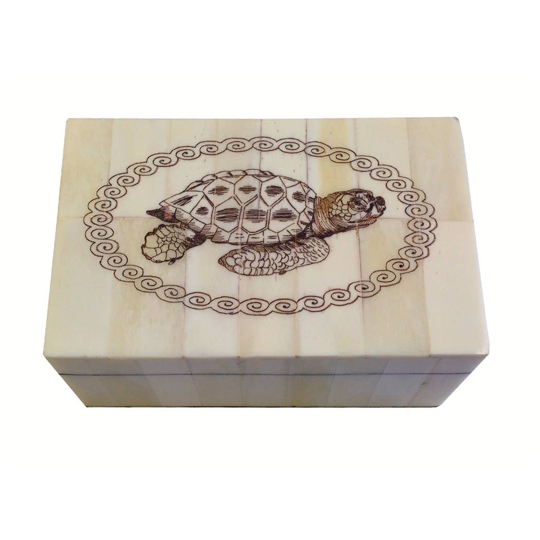 Scatola in osso scrimshaw vintage con tartaruga marina e coperchio rimovibile, 5-1/4” all'ingrosso