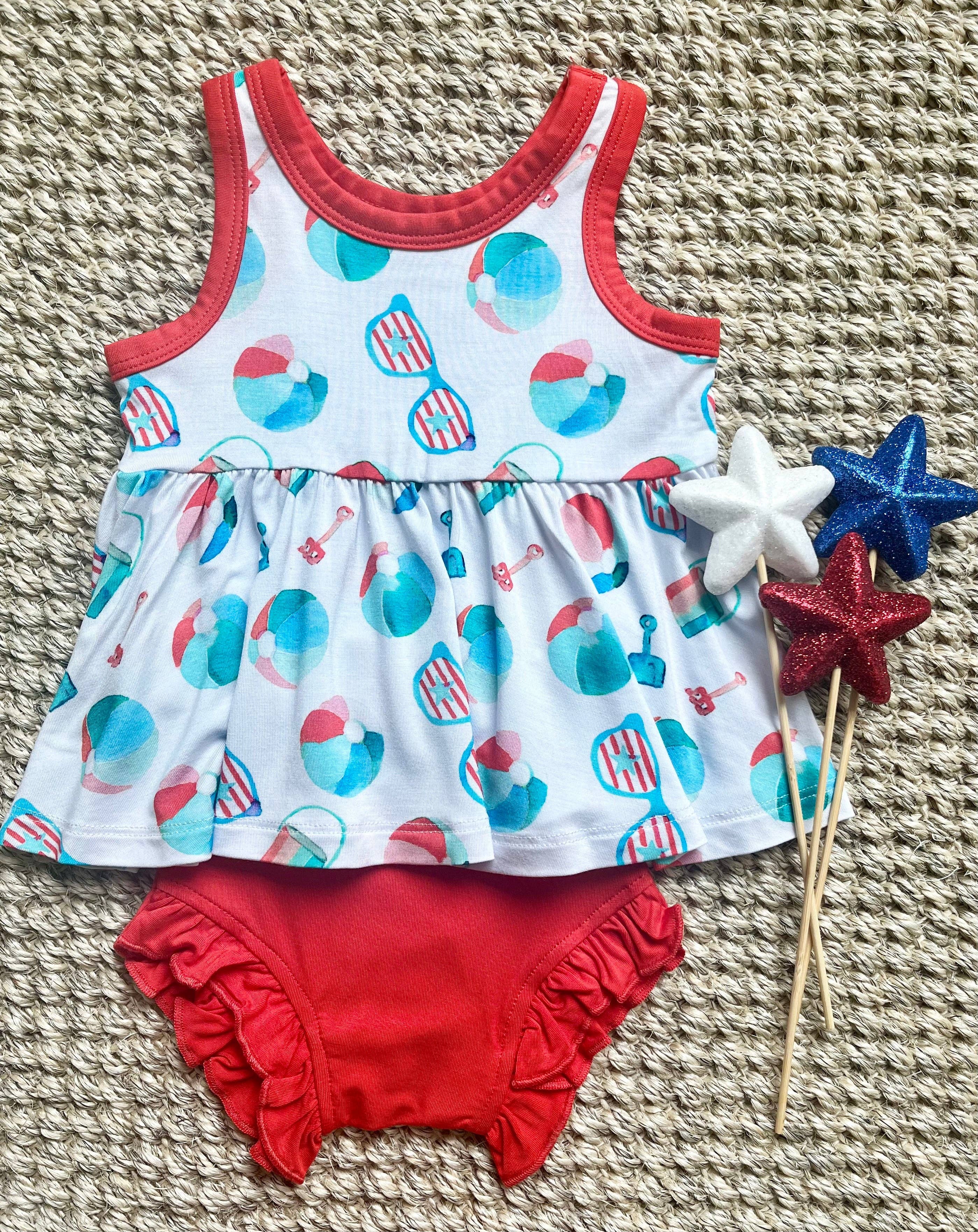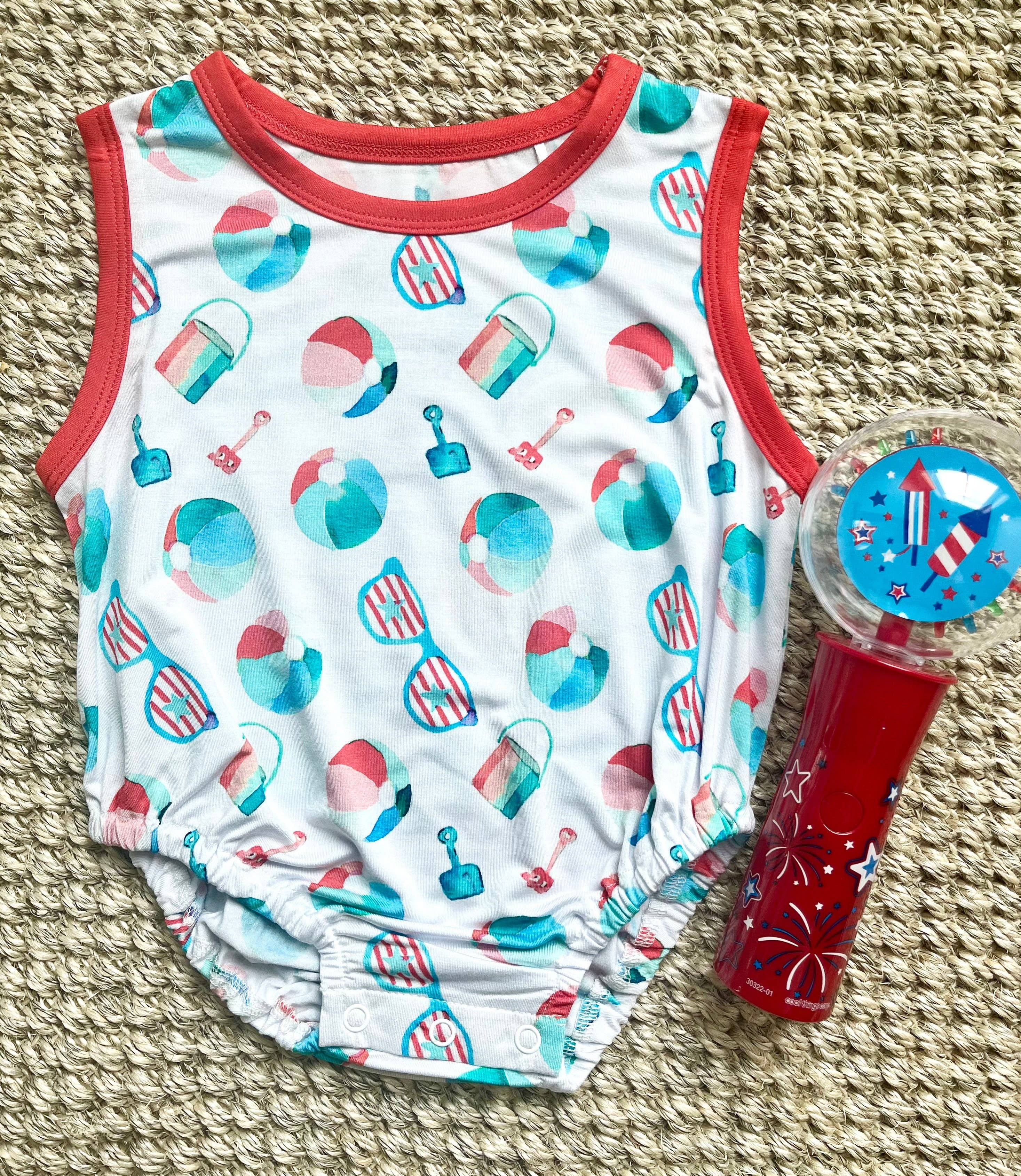 * Disegno ad acquerello Patriotic Beach Toys * Realizzato in tessuto morbido ed elastico 95% viscosa di bambù, 5% spandex * Senza tag per pelli delicate * Progettato per essere carino e comodo da indossare tutti i giorni