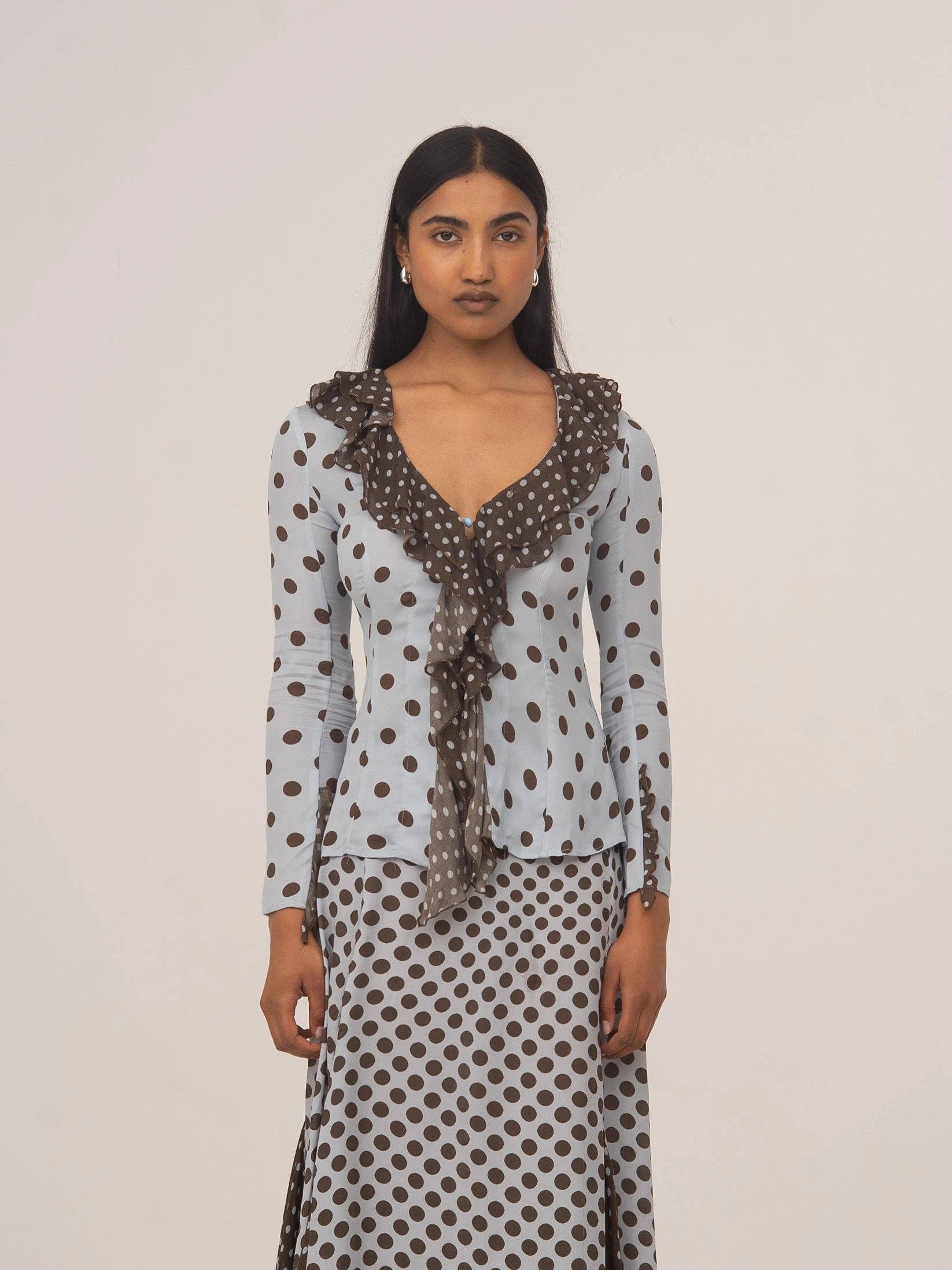 Midi polka dot skirt with a low waist and wide flare, an elegant and feminine design with a retro chic touch. Crafted with a flattering contrasting polka dot print, it stands out for its triangular side slits that add movement and originality. The side closure with an invisible zipper ensures a perfect fit, while its fluid drape flatters the silhouette. Perfect for pairing with light blouses or fitted tops, this midi polka dot skirt is ideal for special occasions, dinners, or daytime looks with a sophisticated air.