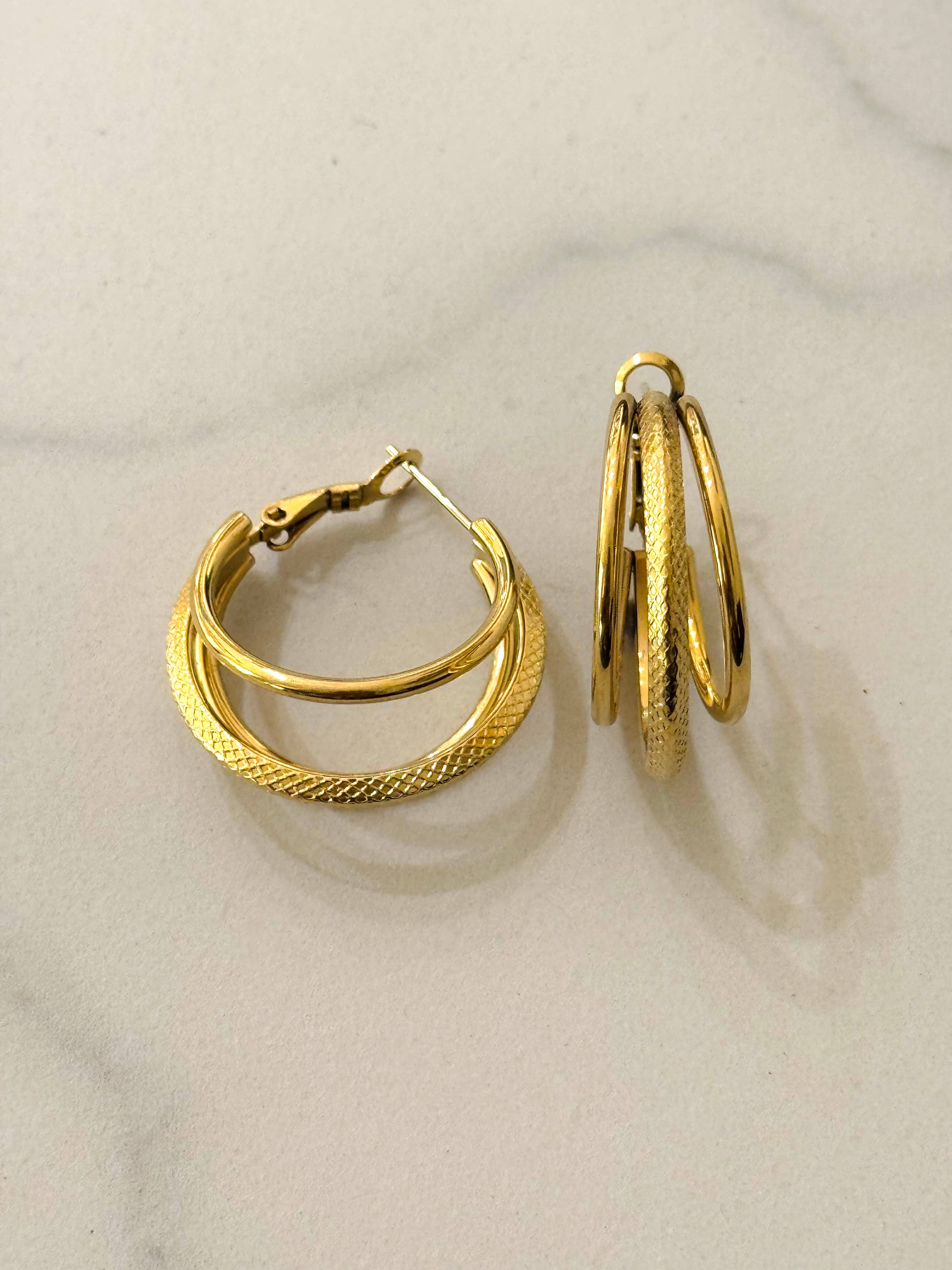 CASSETTE - Triple Line Hoop Earrings Color : Gold Material : Stainless Steel ( 14k Gold Plated ) WATERPROOF Diameter: 25mm Nickel & Lead Free ( HYPOALLERGENIC) The Cassette Jewellery Collection is crafted from premium stainless steel, finished with a high-quality 14k gold plating. Thanks to the advanced production techniques and carefully selected materials, each piece is designed for durability and can be safely worn in water—whether in the shower or at the sea—without risk of discoloration or tarnishing. All items are nickel- and lead-free, ensuring they are hypoallergenic and safe for everyday wear, even on sensitive skin. Enjoy :) PBEL