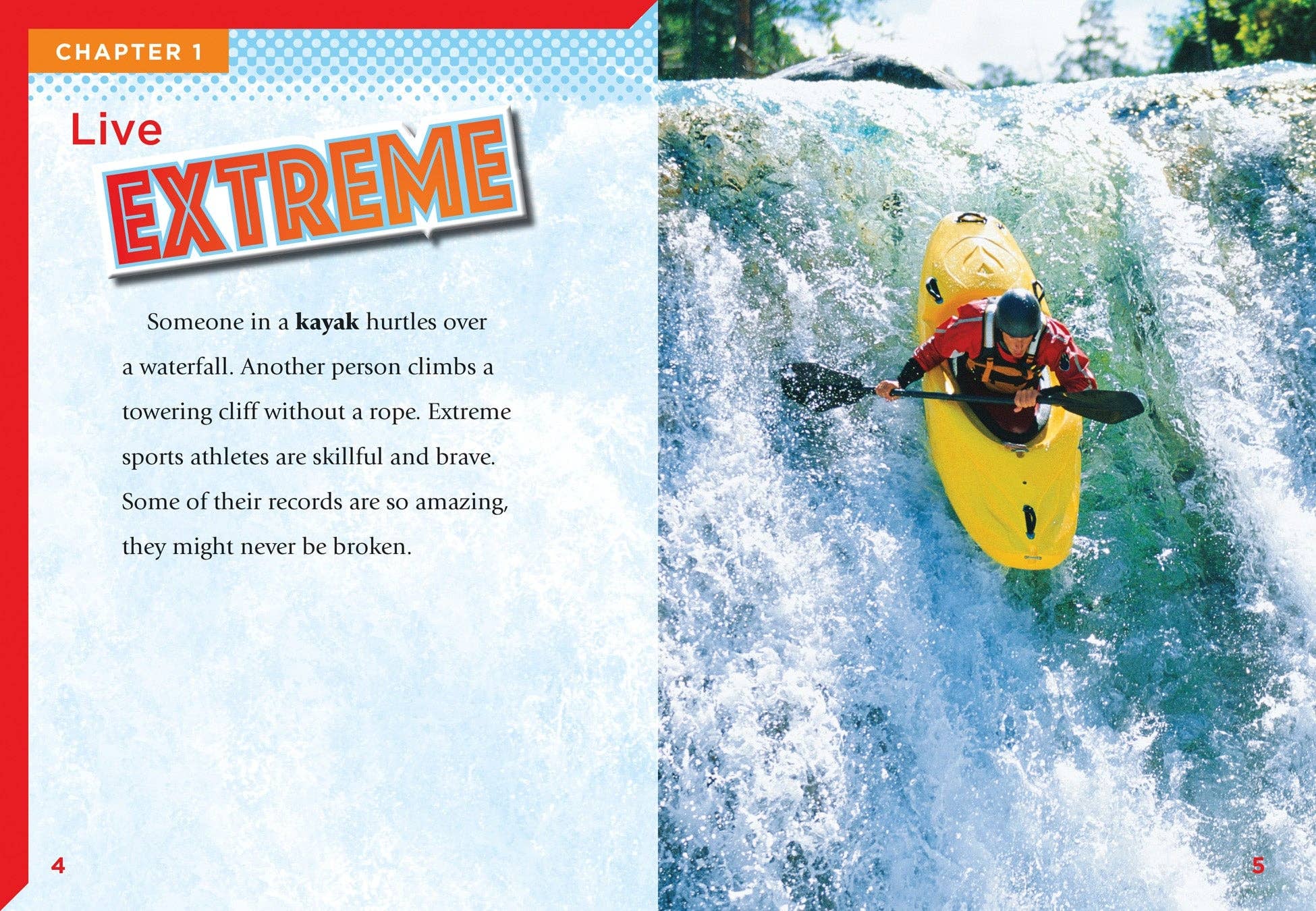 Get your heart pumping with the extreme sport of white-water kayaking. Struggling and reluctant readers will discover the skills and equipment needed to paddle through rough rapids. Includes a table of contents, glossary with pronunciations, further resources, and an index. Part of the Extreme Sports series Would you have the guts to surf a huge wave or parachute off a cliff? Extreme sports are full of thrills, adventures, and no shortage of dangers. Struggling and reluctant readers get detailed knowledge of the skills and equipment needed to succeed at these sports. Action-packed photography, leveled text, and infographics galore make for high-interest pleasure reading. Ages 8 - 12 Nonfiction, 32 pages, 2024 ISBN 9781623108885<