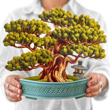 Wisdom Bonsai (8 Cards with envelope, notecard). Includes: pop up plant, matching note card and vibrant mailing envelope Measures approx 10" high by 11" across Samples available to purchase Bringing well wishes of harmony and balance, this whimsical miniature tree rests in a traditional "ceramic" vessel and comes with a small pagoda to decorate your tree. Perfect for Father's Day!