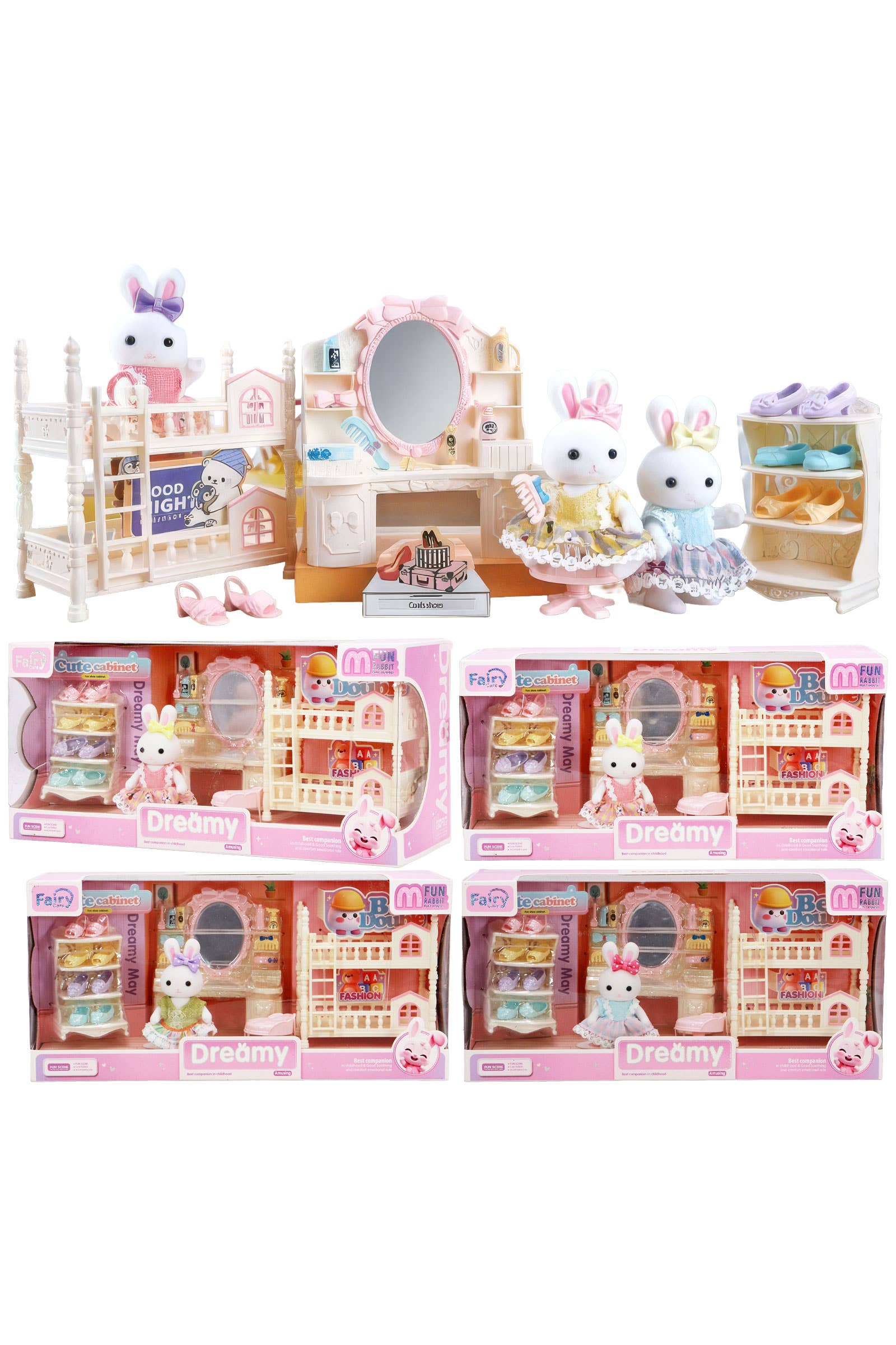 Dreamy Mini Bunny Rabbit Dress Girl Pretend Play House -Box Dimensions: 10" * 5.75" * 3" -Assorted Design (4 - Random Assortments of Bedroom, Living Room, Kitchen, Dress Room) -100% Plastic -CA Prop 65 Advisory -Packaging Details: Packed individually in carton casing. Any items that arrive with imperfect packaging i.e dented box cannot be filed as defective so long as the item itself is intact.