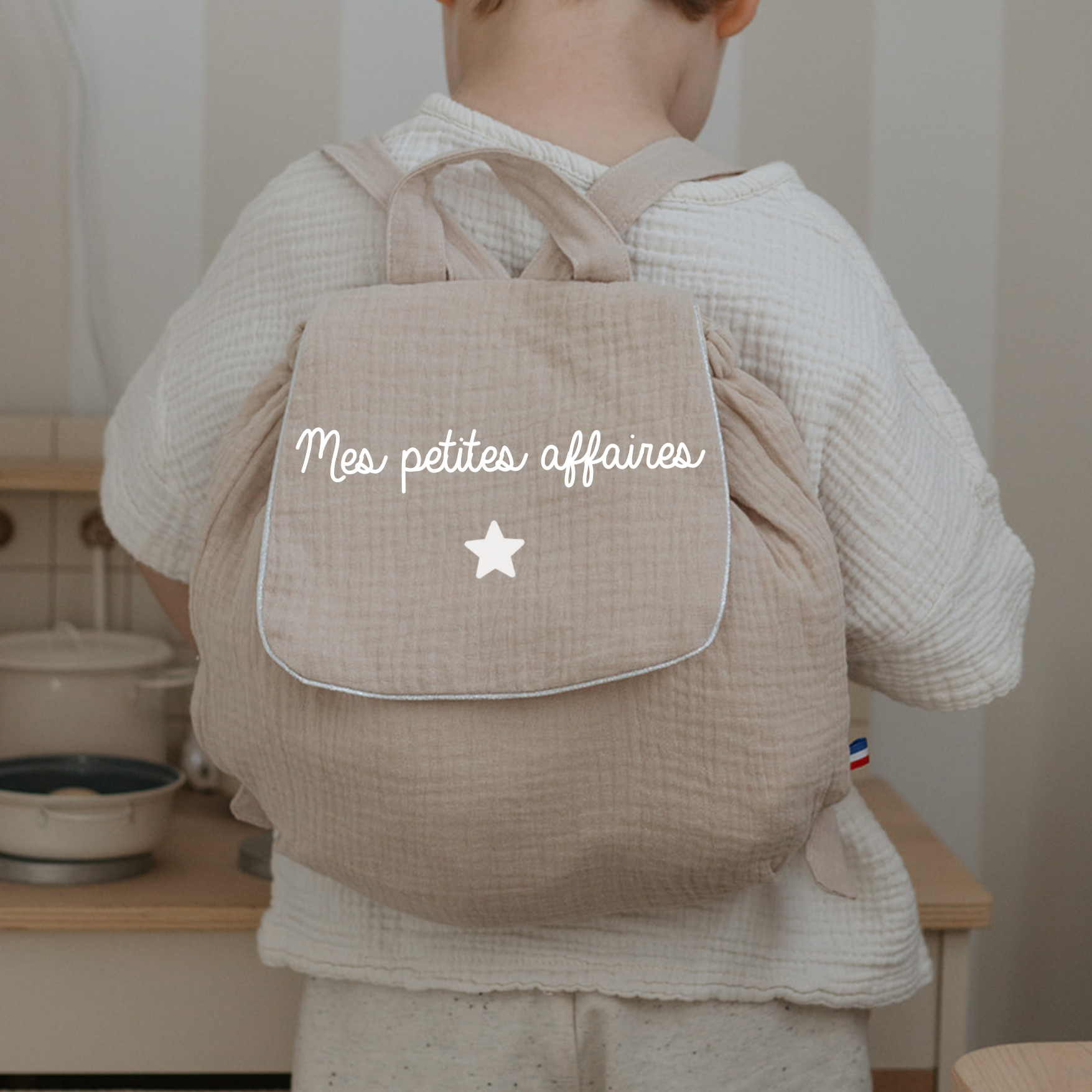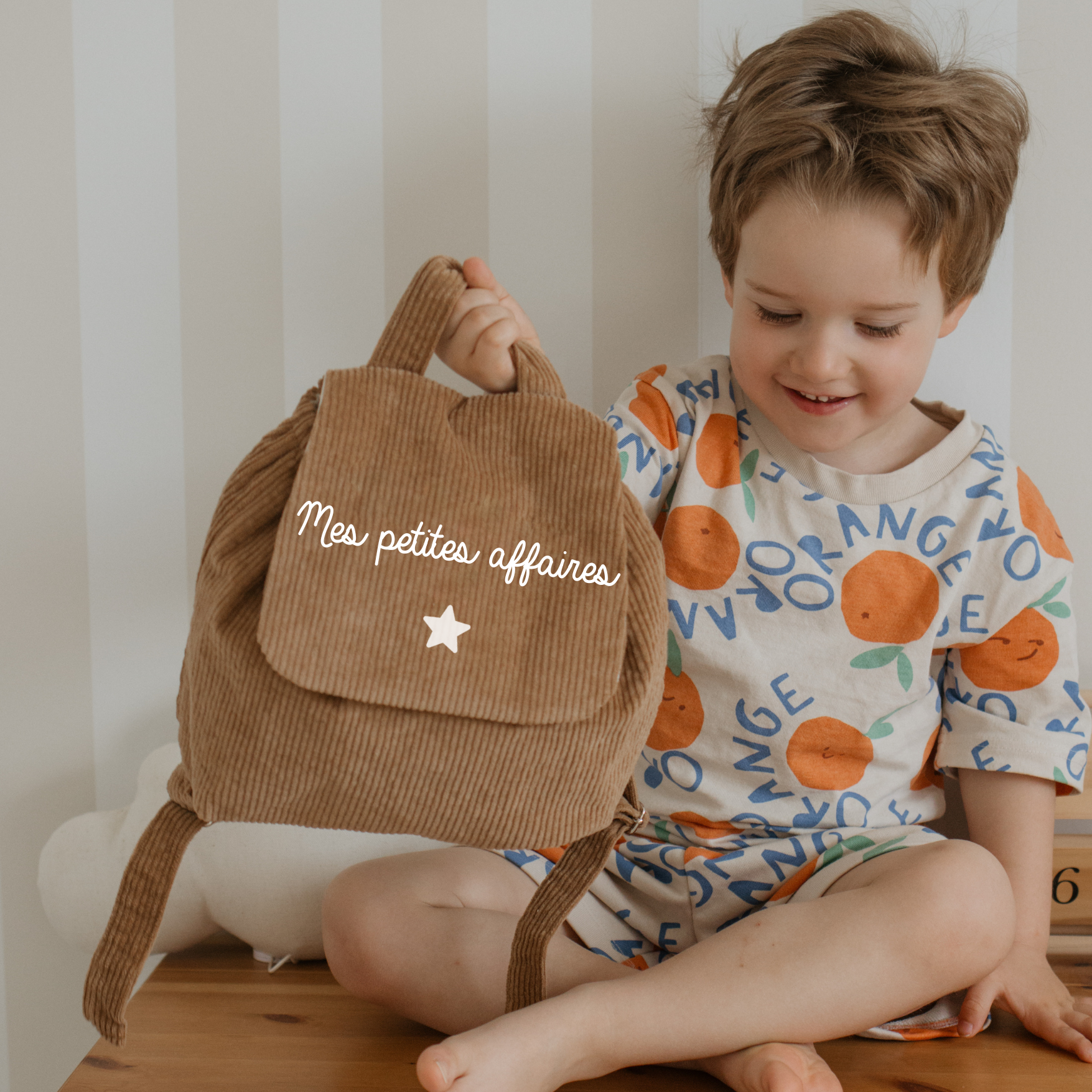 A very pretty khaki corduroy backpack, specially designed for young children. Light, practical, and very soft, it is perfect for accompanying little ones to daycare, preschool, or on their small outings. This bag is fully customizable: you can have the child's name, a short phrase, a sweet word, or any other message of your choice inscribed on it. Several fonts are available, as well as three flex colors to choose from: white, silver, or gold. It is equipped with adjustable straps to fit the child's size and a Velcro opening that is easy to handle. Entirely made in France, this backpack is also machine washable for everyday use without hassle. 📏 Dimensions: 29 x 28 cm 🎒 Ideal for slipping in a comforter, snack, and little treasures of the day!