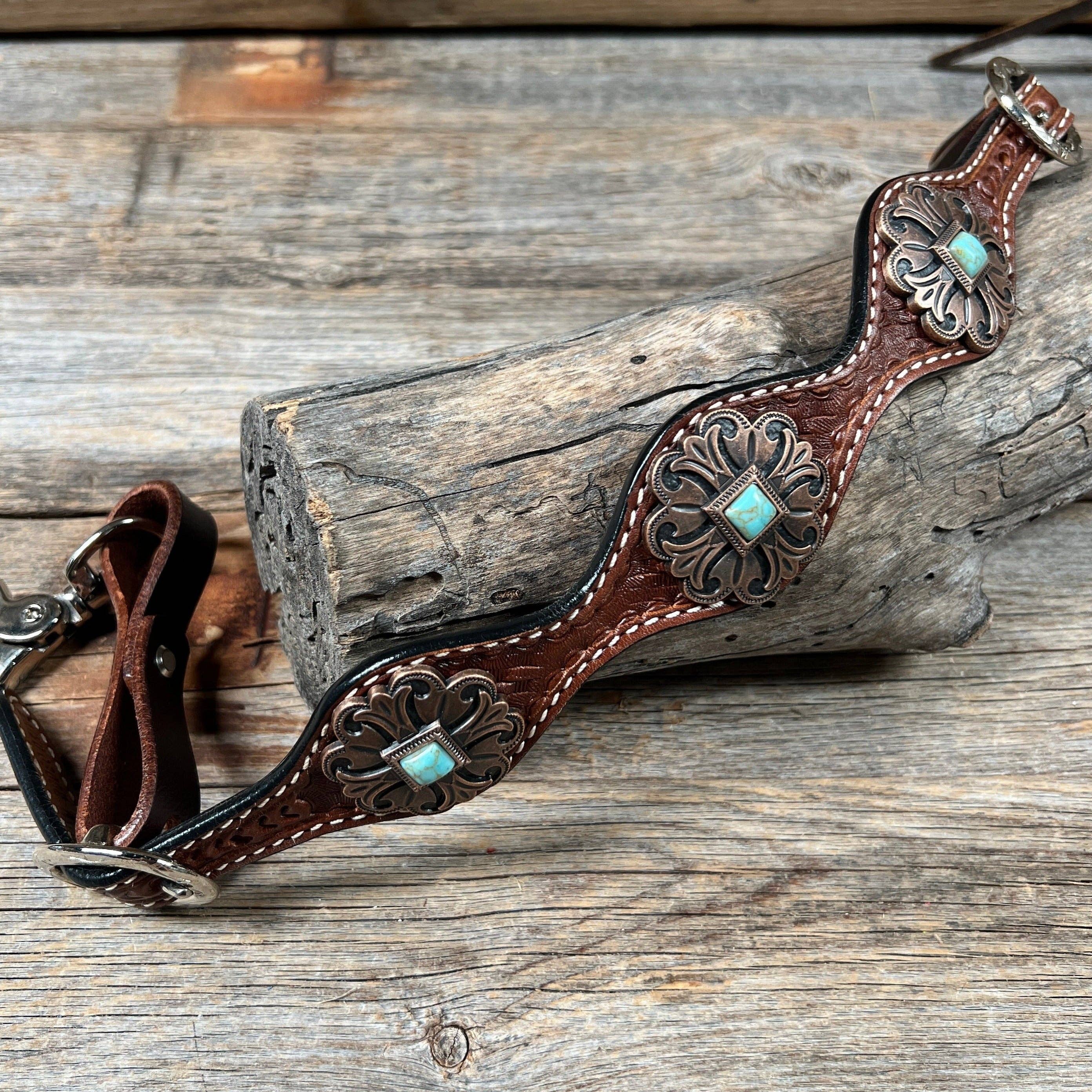 Browband, one ear, wither strap and breastcollar is floral tooled whipstitch style. They are decorated with antique silver Turquoise/AB crystal conchos/buckles. Full Horse size Measurements Headstall measurements : bit to bit - 36" shortest setting : 44" longest settingBrowband measures 15" acrossBreastcollar measurements - From Center Ring to D Ring -16"Breastcollar including toggles : shortest settings - 26" : Longest settings -29" Lifetime guarantee on all crystals. Buy Together or Separate 23619 - 23620 - 5889 - ws2281