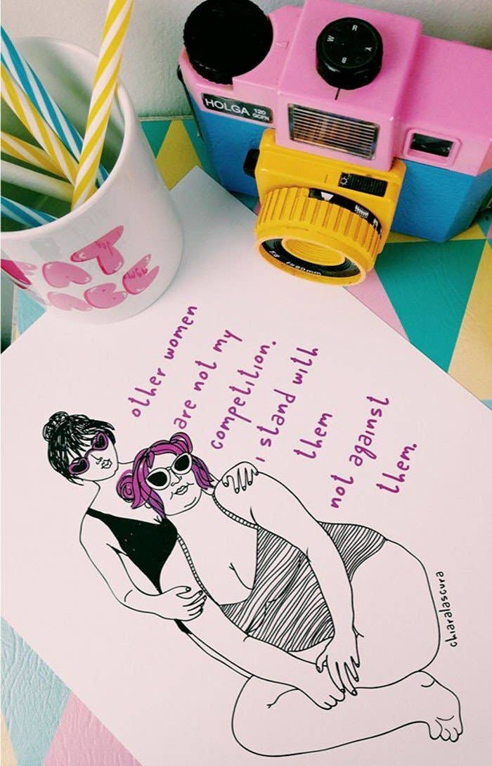 Hallo! Ik ben Chiara, een Italiaanse illustrator en activiste. Ik ontwerp en verkoop geïllustreerde stickers, spelden, knopen, mokken, draagtassen en t-shirts geïnspireerd op lichaamspositiviteit, feminisme, zusterschap, queerheid, dierenbevrijding en geestelijke gezondheid. Ik werk als freelancer sinds 2010, het jaar waarin ik Chiaralascura oprichtte en mijn eerste kleine collectie lanceerde: een paar milieuvriendelijke t-shirts met een veganistisch thema. Sindsdien ben ik ook gaan werken als freelance illustrator en grafisch ontwerper in opdrachten voor organisaties, festivals en merken en het maken van logo's, merkidentiteit, posters en merchandise voor hun projecten. Ik ben altijd een feministe geweest en de laatste jaren ben ik feminisme, vetacceptatie en lichaamspositiviteit in mijn werk gaan integreren. In 2018 was ik medeoprichter van Belle di Faccia, een activismeproject en -organisatie die tot doel heeft het bewustzijn over vetfobie te vergroten en de vetbevrijding in Italië te bevorderen.