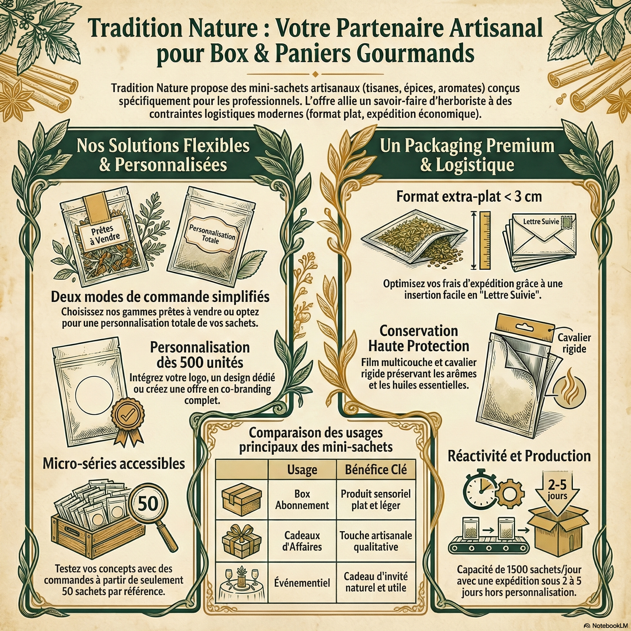Tradition Nature is een familiebedrijf met 25 jaar ervaring in de sectoren van aromatische en medicinale planten, de apotheek en de naturopathie. In onze ateliers in het Bugey-massief produceren we plantenmengsels voor de gezondheid, droge specialiteiten voor de keuken, eenvoudige planten, plantenpoeders, superfoods en specerijen. We werken op de manier van een kruidenierswinkel, in kleine hoeveelheden voor online verkoop, maar onze verpakkingsapparatuur stelt ons ook in staat om middelgrote series tot 1000/2000 eenheden te leveren, met name voor de Boxen. We zijn verheugd om u hier op FAIRE onze collectie van specialiteiten en historische producten aan te bieden, die hun waarde hebben bewezen in termen van verkoop. U bent verzekerd van kwaliteitsproducten, geproduceerd met passie en respect voor de apothekerstraditie.