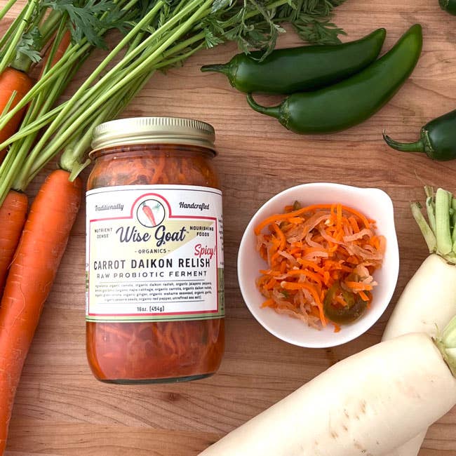 Wij zijn een kleine voedselproducent die eigendom is van een vrouw met als doel voedzame en voedzame voedingsmiddelen te leveren. We zijn actief sinds 2013 en zijn uitgebreid naar 15 boerenmarkten in de Bay Area en meer dan 300 supermarkten in het hele land. We kopen onze ingrediënten in bij boeren uit de buurt die zich bekommeren om de kwaliteit van hun gewassen en het behoud van kostbare bovengrond. Onze zakelijke beslissingen worden genomen op basis van de gezondheid van onze klanten en de impact die we hebben op het milieu. Al onze producten zijn biologisch gecertificeerd en verpakt in glazen potten. We fermenteren nooit in plastic vaten. We hebben 44 Good Food Awards en 3 finalistenprijzen gewonnen. We hebben meer dan 40 SKU's beschikbaar. Al onze producten worden met de hand gemaakt in microbatches in onze gecertificeerde boerderijkeuken in Hollister, Californië.