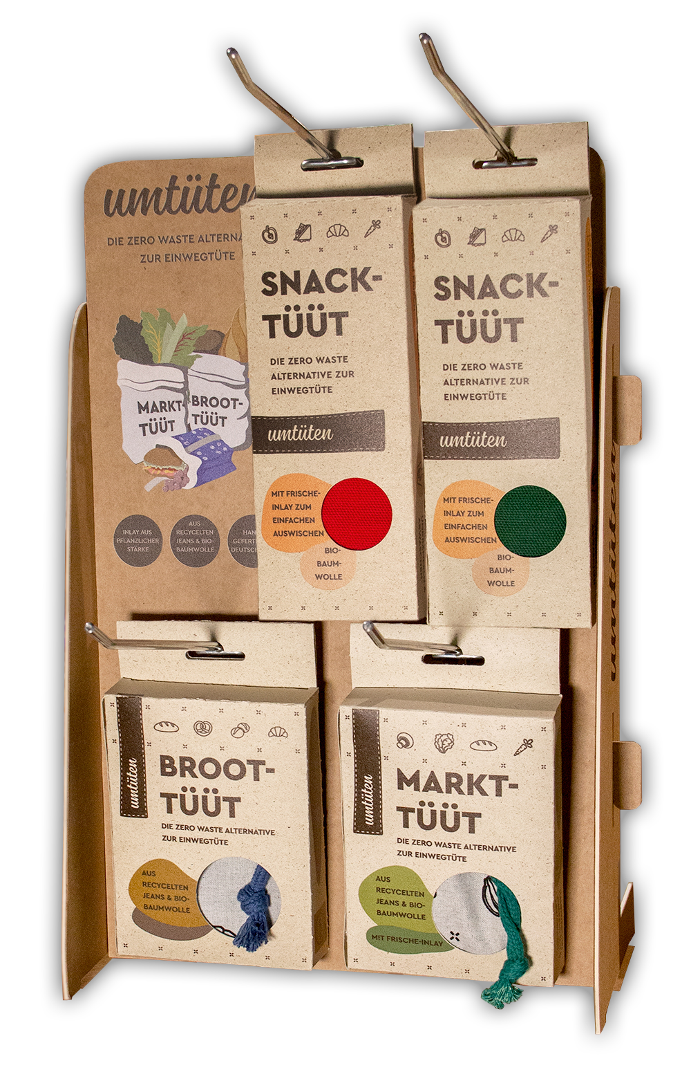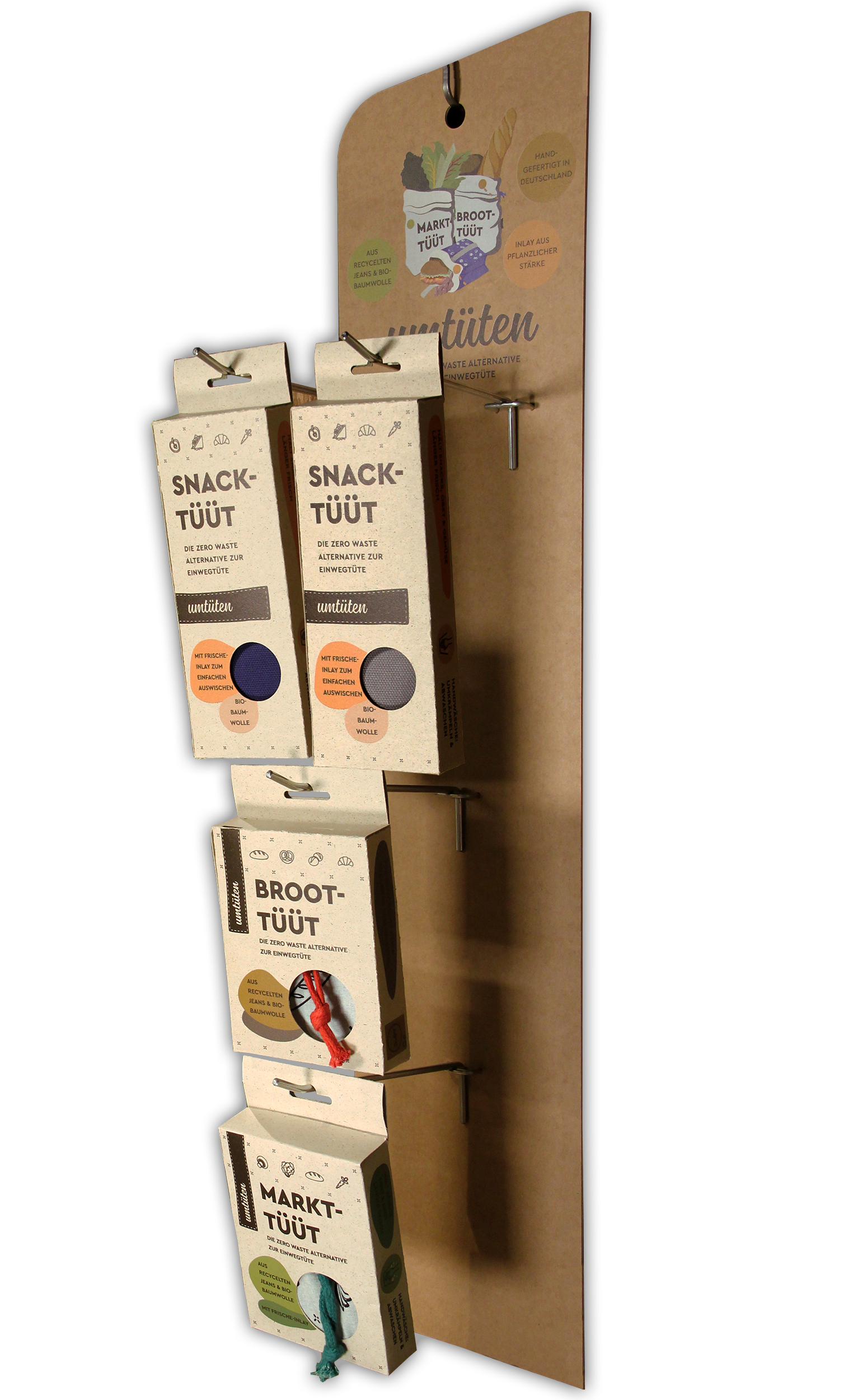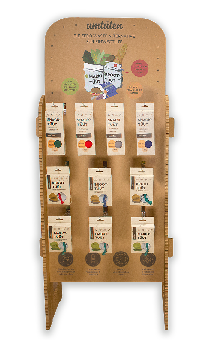 De zero waste alternatieven voor wegwerpzakken! umtüten biedt een duurzaam herbruikbaar alternatief voor zoveel mogelijk situaties in het dagelijks leven. De tassen zijn ontworpen om te winkelen bij de bakkerij, in de supermarkt, onderweg of op kantoor. Op deze manier maken ze het dagelijks leven gewoon vrij van afval. Transparante, duurzame productie van zakken is vooral belangrijk voor zakken - van gesponnen garen tot afgewerkte zakken. Spinnen, weven, verven, bedrukken en naaien gebeurt daarom binnen een straal van 100 km in Münsterland met producenten die ecologisch en sociaal werken en hun vak tot in de perfectie (en met veel liefde) uitvoeren. Voor de zakken gebruikt Umsacken organische gerecyclede materialen, ecologische verven en een inleg gemaakt van plantaardig zetmeel. In een partnernaaiwinkel in Münsterland worden de GOTS-gecertificeerde stoffen met de hand in afgewerkte tassen genaaid. Als gevolg hiervan worden ze hoogwaardige en bijzonder duurzame zakken, waardoor onnodige wegwerpverpakkingen worden vervangen.