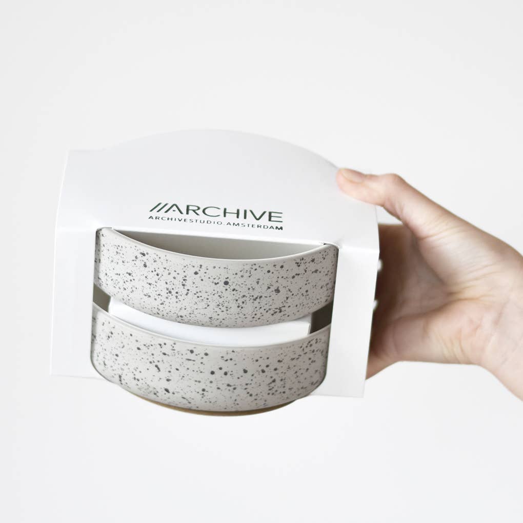 Archive Studio is een ontwerpstudio met een focus op duurzame producten van hoge kwaliteit die dagelijks worden gebruikt. De eerste collectie steengoed keramiek is uniek vanwege de dubbele laag klei die verschillende afwerkingen aan de binnen- en buitenkant van het product mogelijk maakt. De buitenlaag heeft een zacht geschuurde afwerking, waardoor de oorspronkelijke textuur van de klei behouden blijft. De binnenkant heeft een ivoorwitte laag glazuur die het product perfect beschermt. „Begin klein, groei langzaam. Dat is onze filosofie. We breiden langzaam ons archief van keramiek uit en zorgen ervoor dat elk nieuw item perfect in het bestaande assortiment past. Onze gebruikers hoeven ook niet te haasten. Alle producten blijven op de lange termijn beschikbaar, dus het is niet nodig om dringend een hele set samen te stellen. In plaats daarvan kunnen de gebruikers in de loop van de tijd hun eigen collectie samenstellen en uitbreiden Alle producten van Archive Studio worden met de hand gemaakt in een Vietnamese werkplaats. De samenwerking met deze kleine producent is door de EU erkend als een programma ter ondersteuning van de lokale economie en heeft ons vrijgesteld van het betalen van invoerrechten. We bezochten de workshop in januari 2018 en het voelt geweldig om met zo'n authentieke en toegewijde leverancier samen te werken.”