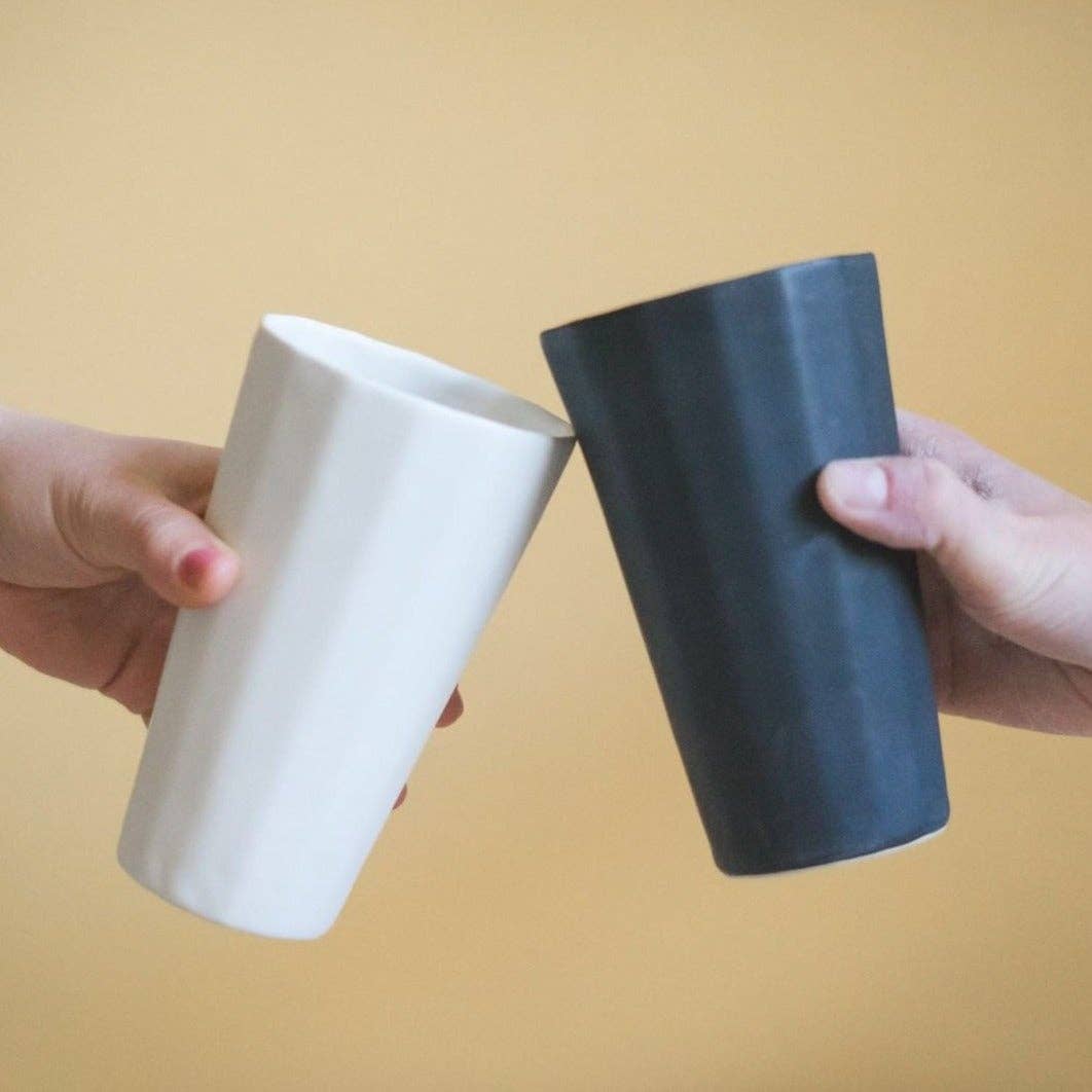 The Bright Angle is een samenwerkingsstudio voor ontwerpers en makers van keramiek, opgericht in Asheville in 2016. Het begint met een idee - we brengen dit idee aanvankelijk naar buiten door te schetsen of te beeldhouwen. Om ervoor te zorgen dat we het slimste ontwerp kunnen realiseren, zetten we de schets over naar een computerondersteund modelleersysteem. Met dit programma kunnen we het ontwerp naar de 3D-printer sturen om het eerste model tot leven te zien komen. Het gebruik van technologie heeft ons in staat gesteld ideeën te realiseren die technologie op een manier benutten die we als ambachtslieden niet zouden hebben overwogen. Zodra we een model hebben waar we tevreden mee zijn, schalen we het op om rekening te houden met de krimp van het porselein. Vervolgens gieten we gips rond het model om een mal te maken. Deze mal wordt gevuld met vloeibaar porselein om het object te vormen. We verfijnen het porseleinen object met handgereedschap. Het porselein wordt bedekt met onze zachte satijnglazuur en gebakken in een oven tot 2200F. Zodra het gebakken is, schuren we de onderkanten glad en beginnen we de andere materialen voor elk ontwerp te verzamelen. Zodra het gebakken is, schuren we de onderkanten glad en verpakken we ze zodat ze veilig bij u thuis aankomen.