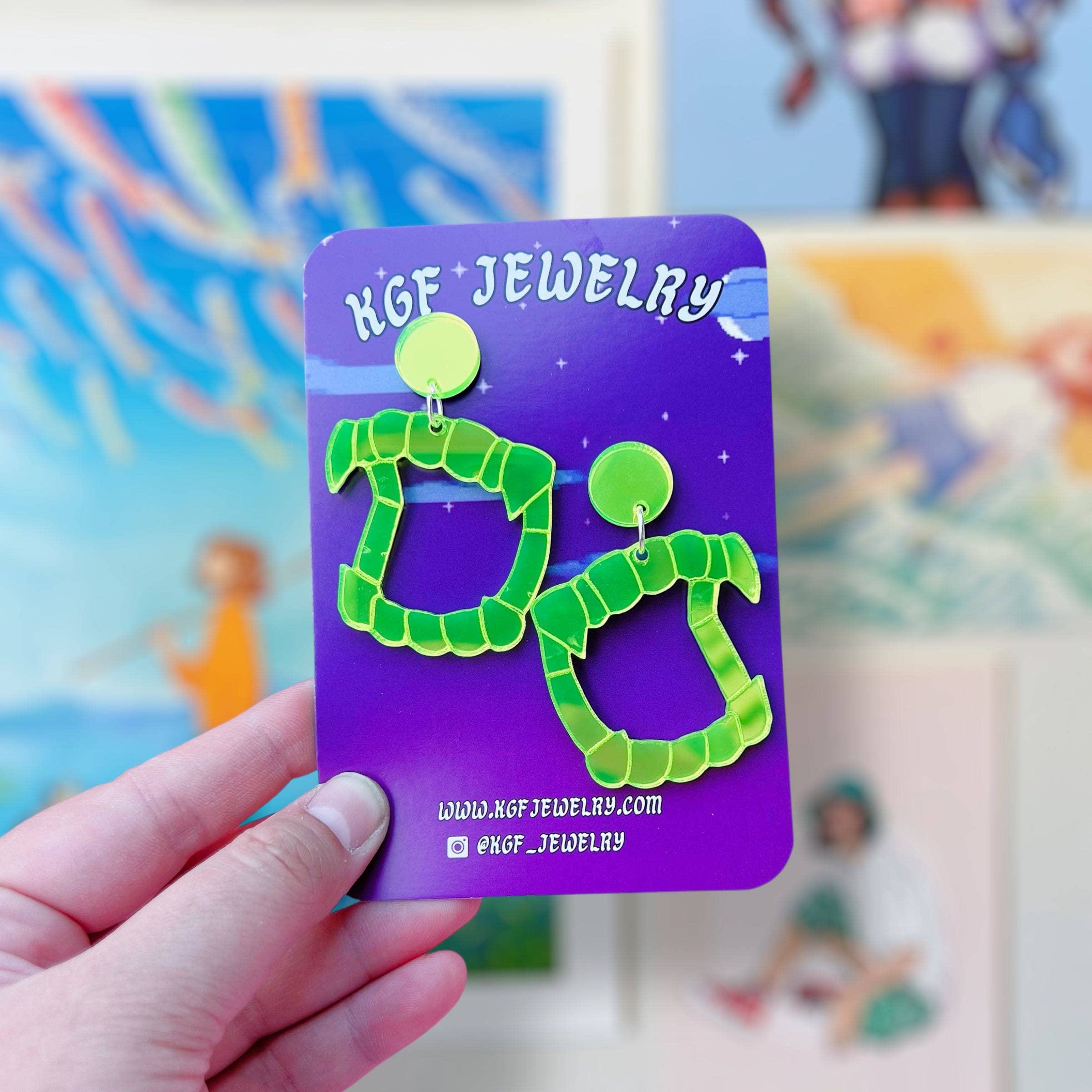Hallo, ik ben Kat! Ik heb KGF Jewelry. Ik knip, monteer, schilder en verpak alles zelf, het is een show voor één vrouw! Ik maak oorbellen en accessoires die verband houden met acryl popcultuur. Ik ben in 2020 begonnen tijdens de pandemie. Het was een moeilijke tijd voor mij en ik wilde iets doen. Ik begon kleine krimpoorbellen te maken en ze op Etsy te verkopen. Het begon van start te gaan en uiteindelijk stopte ik met mijn dagelijkse baan en begon fulltime te werken aan KGF Jewelry! Ik had nooit gedacht dat ik zou zijn waar ik nu ben.