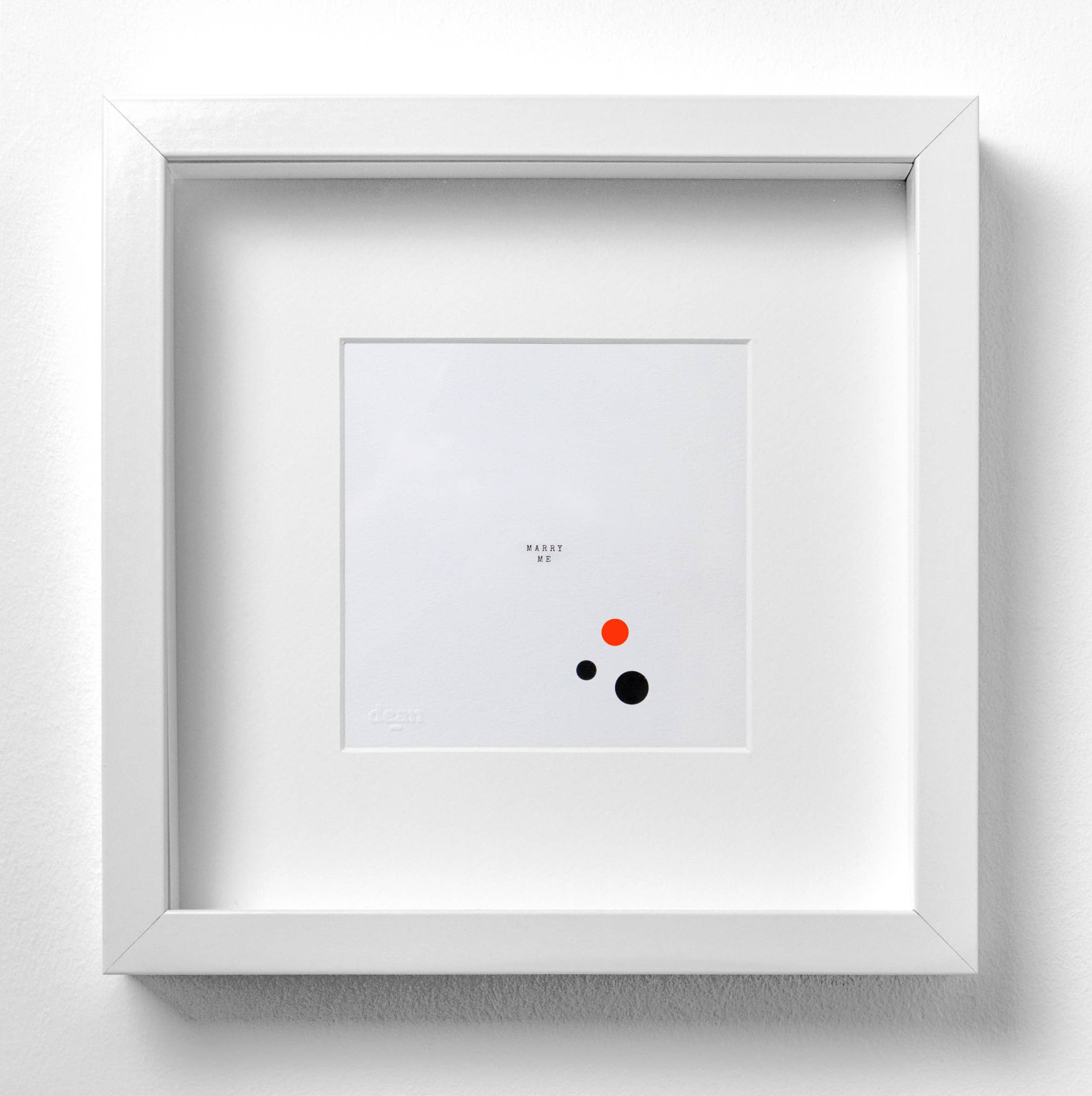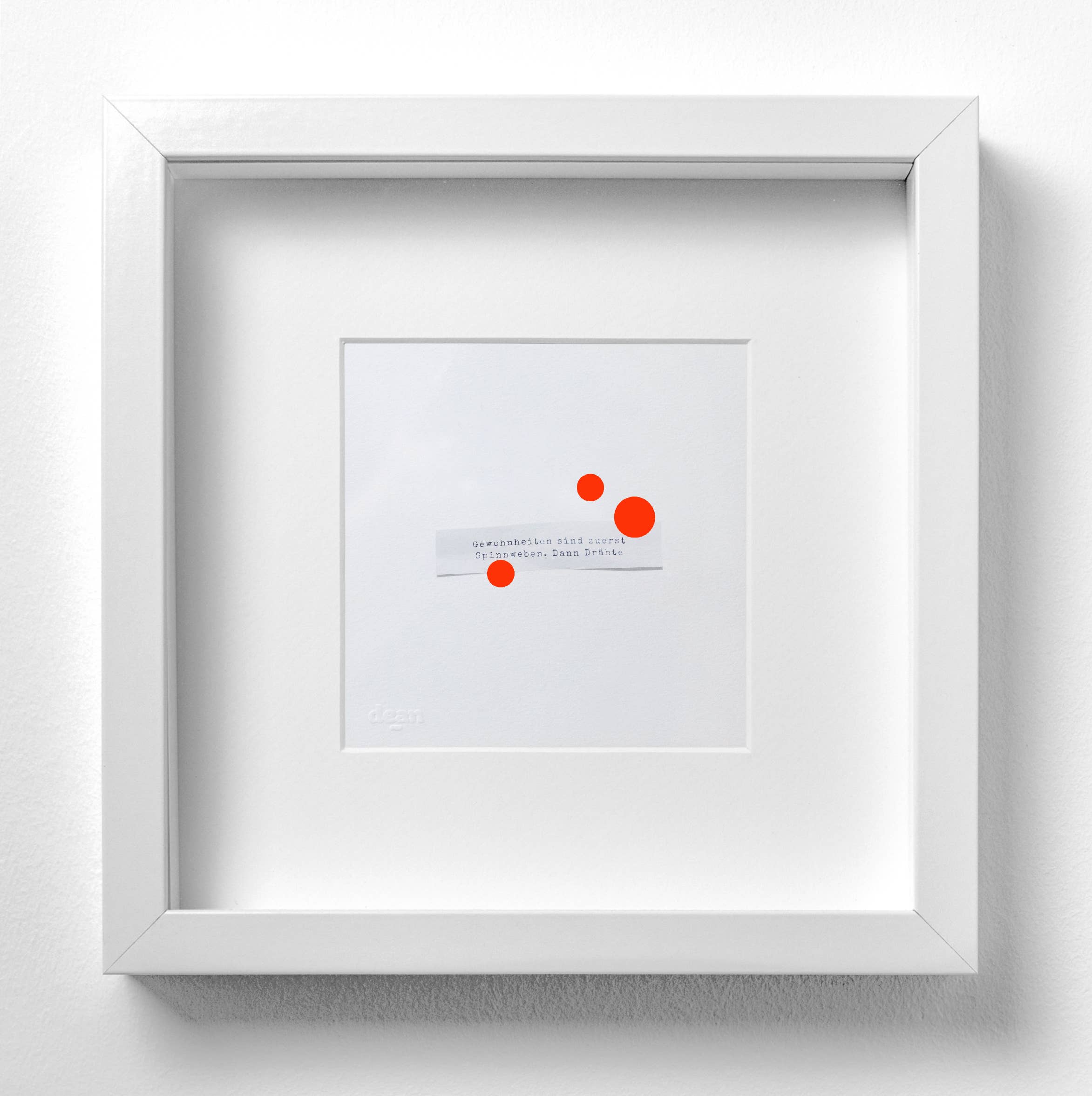 dean.one zijn beeldende kunstfoto's van 25 × 25 cm. Met gelukskoekjes, Pantone-verhalen, teksten, zeefdrukken en risografieën. Of het nu gaat om een enkele foto of de hele muur, Dean.one verfrist en herleeft elke kamer. Meestal discreet, soms heel luid. En neonkleurige tassen van stof maken het assortiment compleet.
