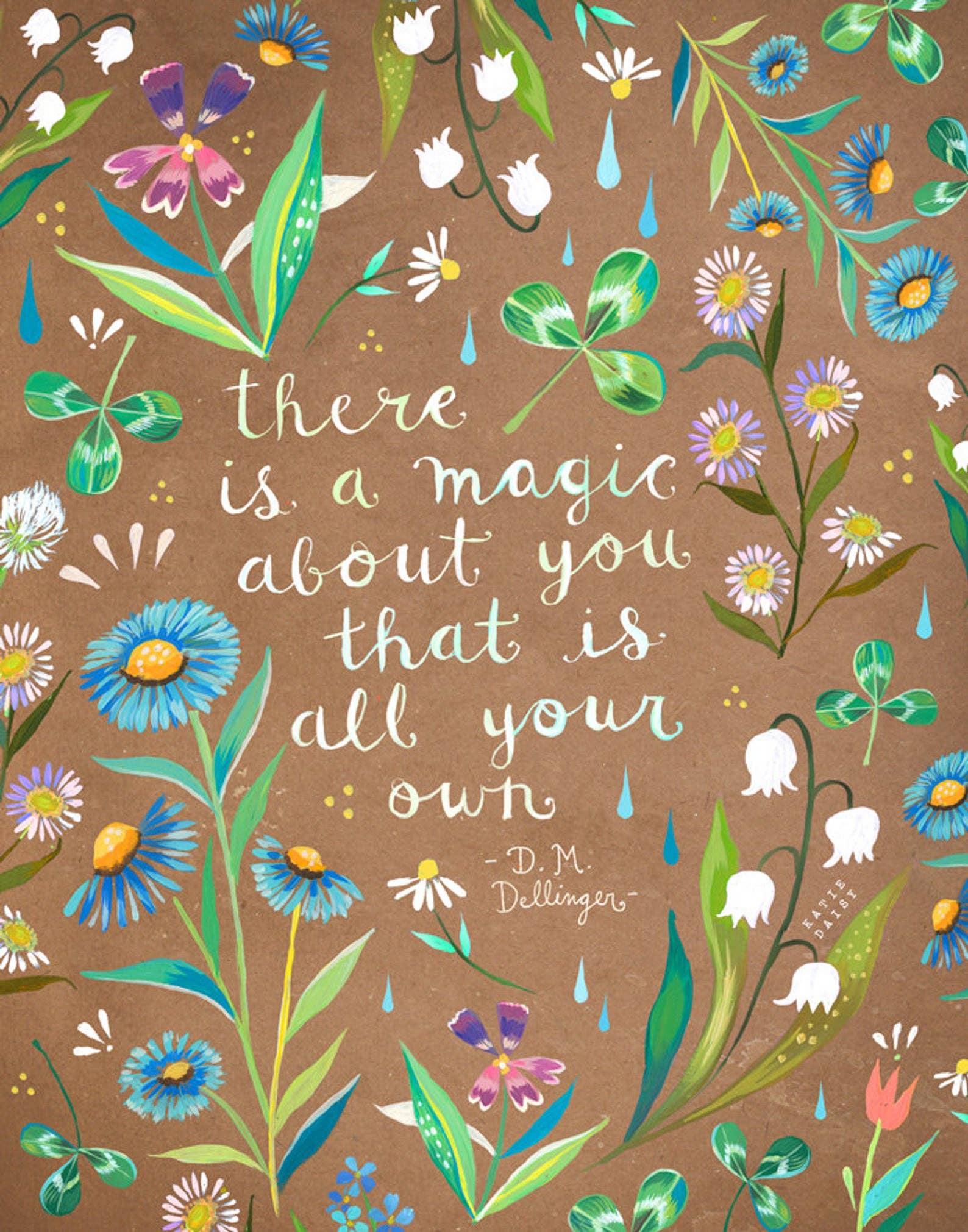 Katie Daisy werd opgevoed door de vogels en warme briesjes van het kleine stadje Lindenwood, Illinois, opgegroeid tussen de andere wilde bloemen met wortels diep in de natuurlijke wereld geplant. Ze vond haar stem en verbeterde haar vaardigheden aan het Minneapolis College of Art and Design, studeerde af in 2009 en begon vervolgens een avontuurlijke carrière als freelance illustrator. Ze verkoopt prints van hoge kwaliteit via haar website & Etsy-winkel en heeft haar werk in licentie gegeven voor een breed scala aan producten. Katie werkt in aquarel- en acrylverf en gemengde mediaterialen en streeft ernaar om de magie en schoonheid vast te leggen van een leven dat in harmonie met de natuur leeft.