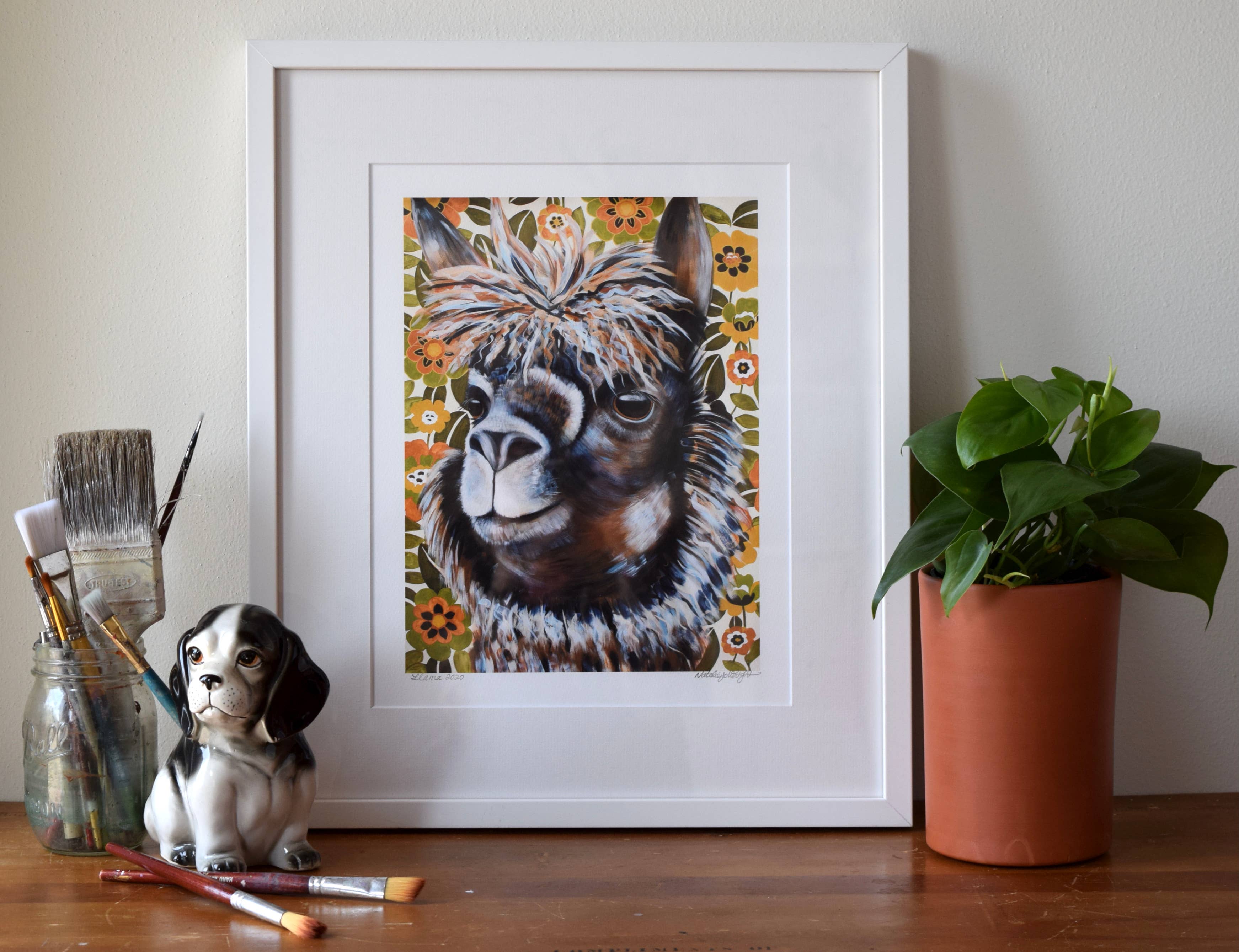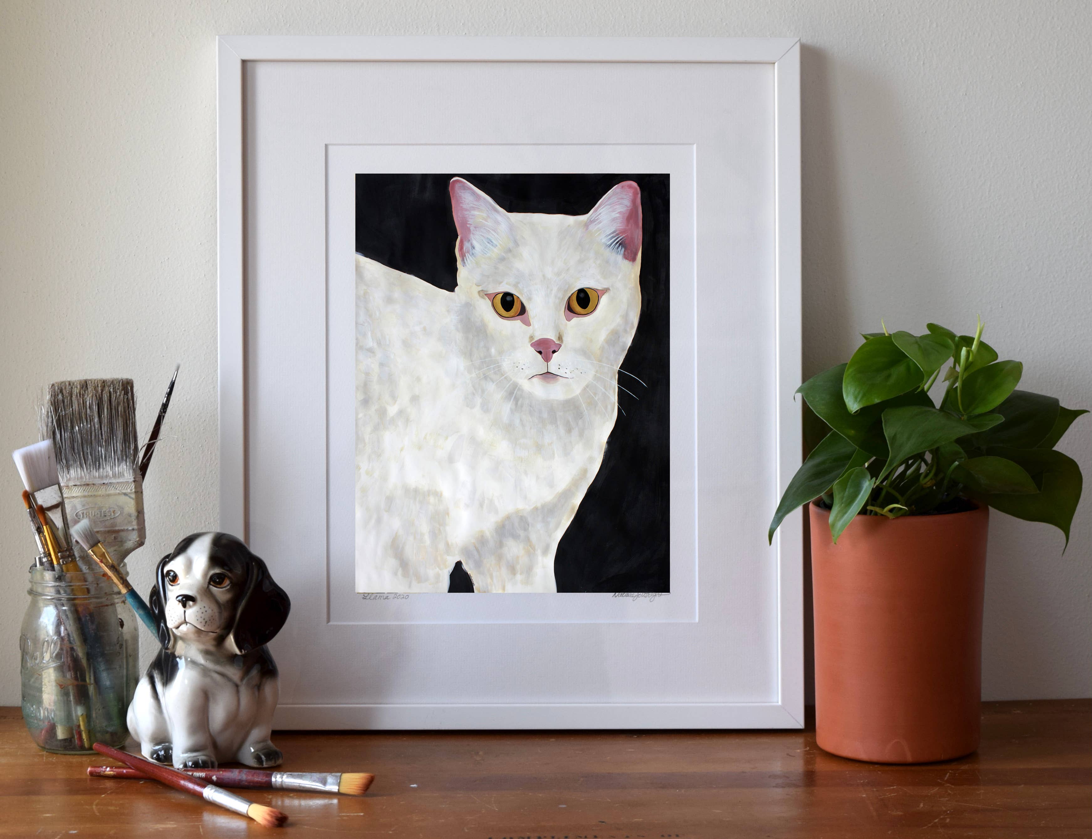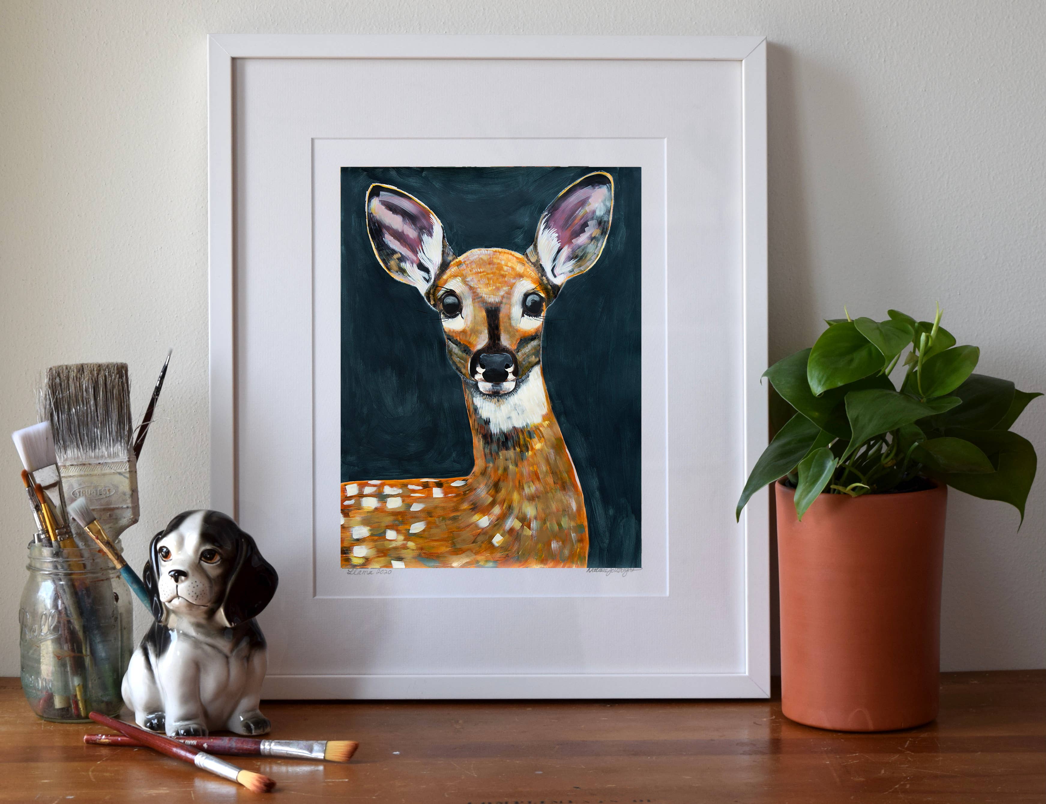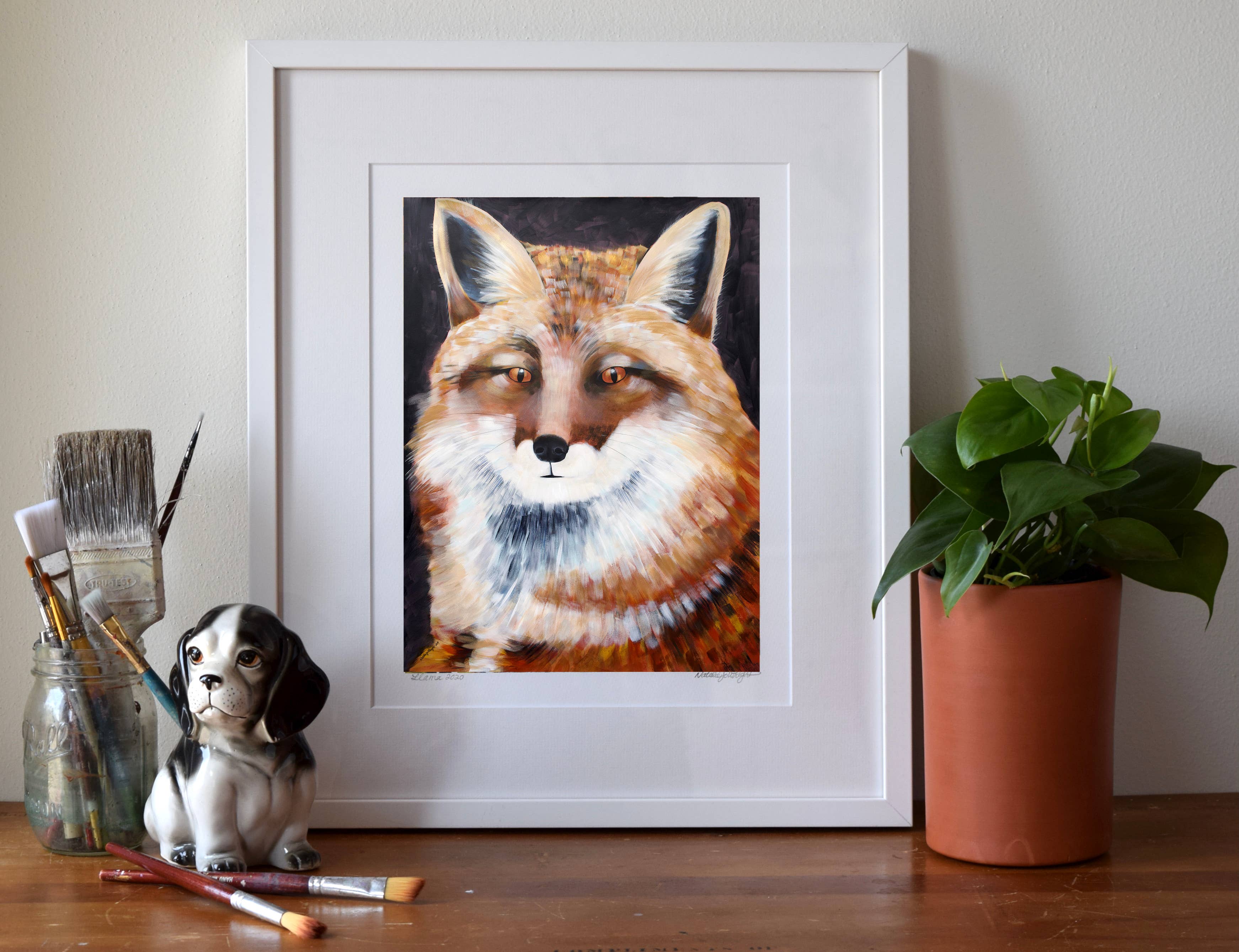 Ik maak museumwaardige kunstdrukken van mijn originele schilderijen - van bestverkopende bosdieren en katten tot portretten en pop-surrealistische werken. Mijn werk combineert beeldende kunst en design, geworteld in zowel traditionele ambacht als hedendaagse verhalen. Ik heb een BFA van het Milwaukee Institute of Art & Design en een MFA in Textielontwerp van de Rhode Island School of Design. In de loop der jaren heb ik kunst gecreëerd die zowel in huizen als openbare ruimtes te vinden is - van mijn "Mustachio" behang, een klassieker van het in Brooklyn gevestigde Flavor Paper sinds 2008, tot grootschalige dierenportretten die door heel Madison, Wisconsin, worden tentoongesteld. Wat mijn merk uniek maakt, is de balans tussen speelsheid en diepgang - stukken die zowel speels als gedurfd zijn, met een gevoel voor humor, tederheid en verbinding met het dagelijks leven. Mijn praktijk is altijd in ontwikkeling, van boswezens en katachtige muzen tot portretten van culturele iconen, wat zorgt voor een frisse en evoluerende collectie voor boetieks en verzamelaars.
