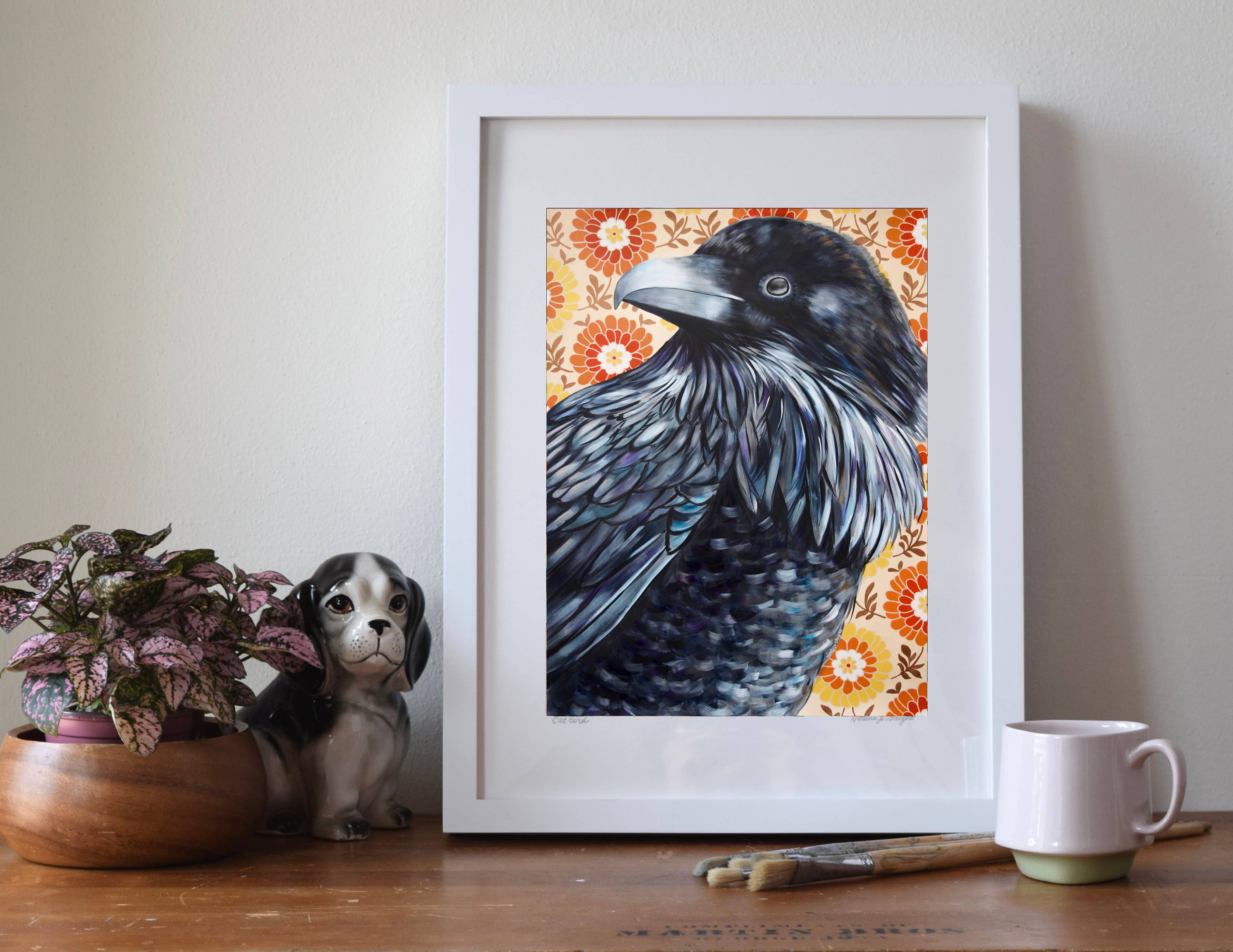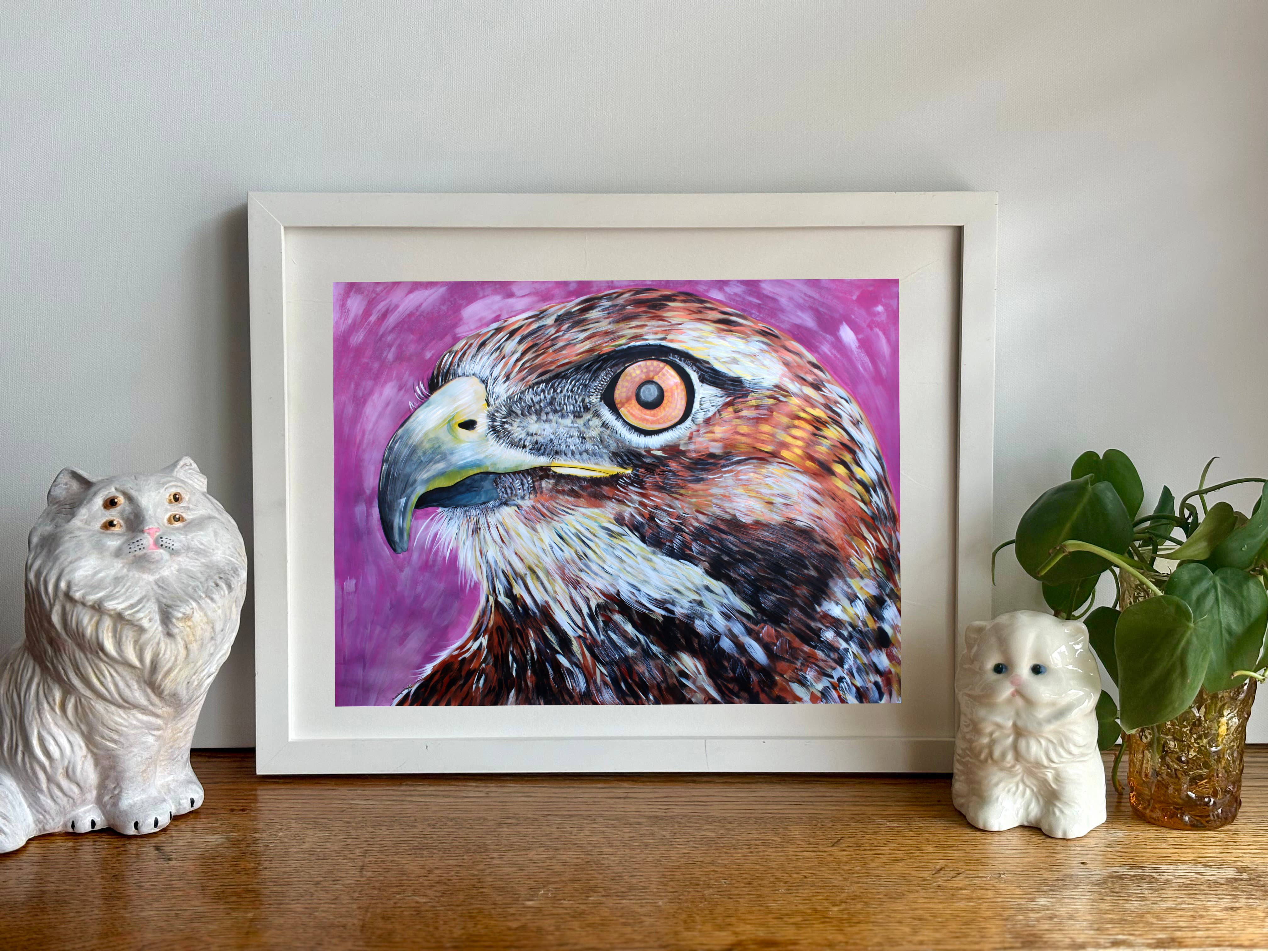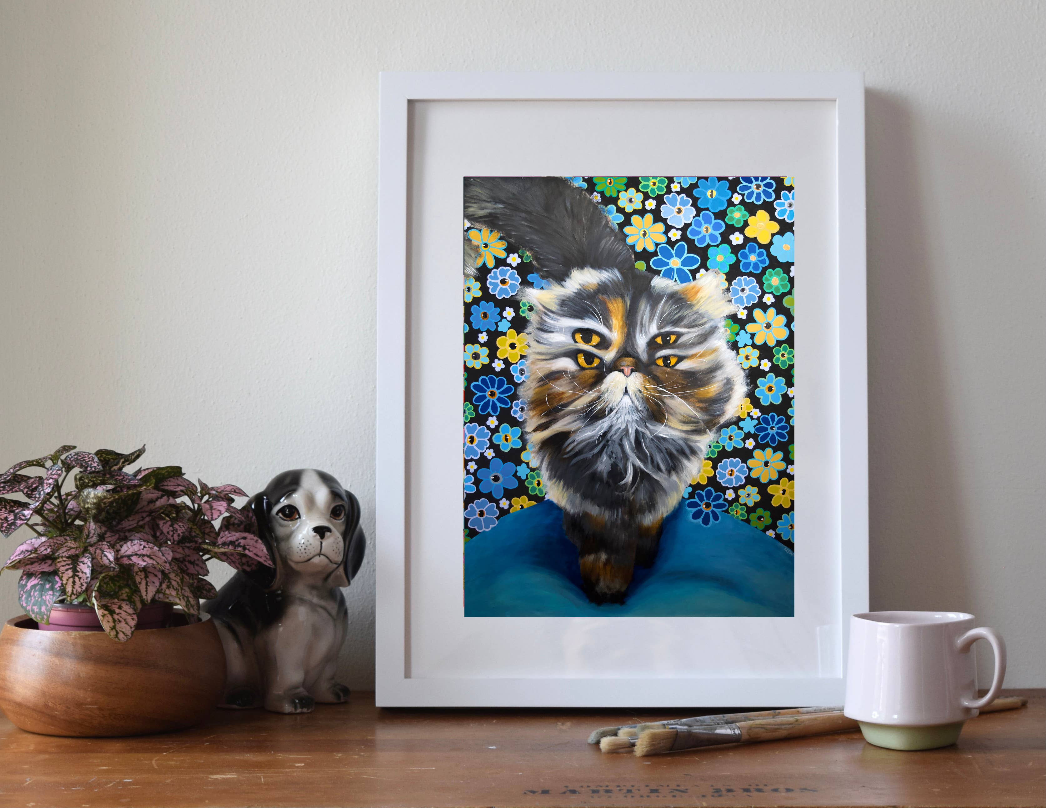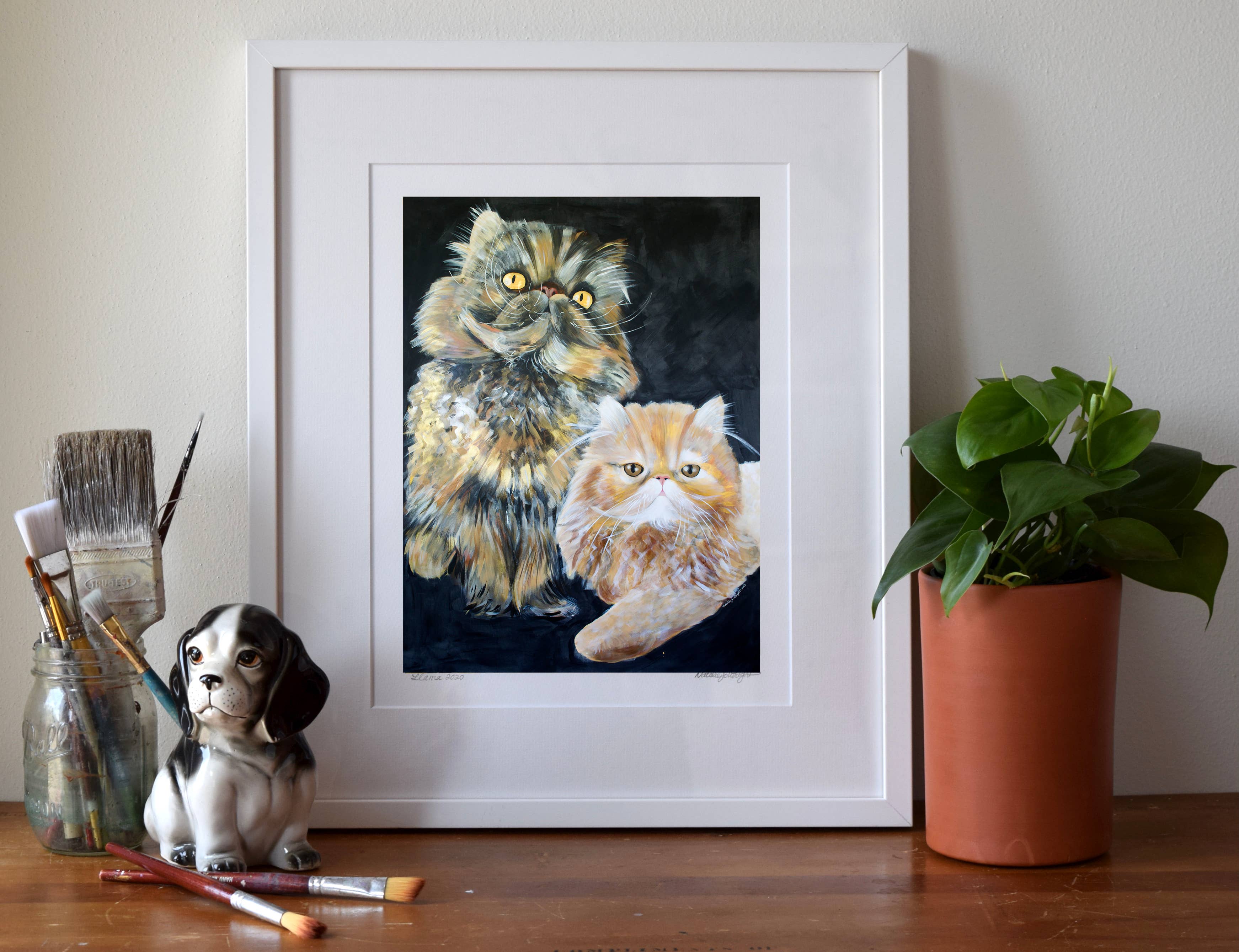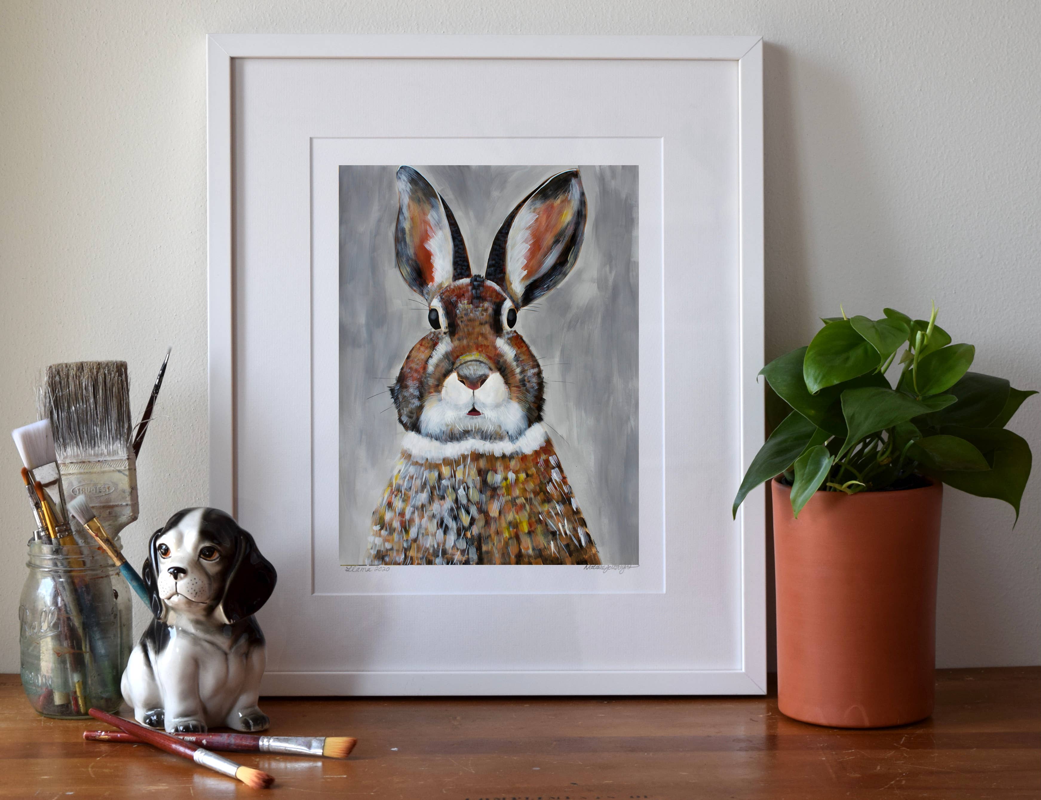 Ik maak museumwaardige kunstdrukken van mijn originele schilderijen - van bestverkopende bosdieren en katten tot portretten en pop-surrealistische werken. Mijn werk combineert beeldende kunst en design, geworteld in zowel traditionele ambacht als hedendaagse verhalen. Ik heb een BFA van het Milwaukee Institute of Art & Design en een MFA in Textielontwerp van de Rhode Island School of Design. In de loop der jaren heb ik kunst gecreëerd die zowel in huizen als openbare ruimtes te vinden is - van mijn "Mustachio" behang, een klassieker van het in Brooklyn gevestigde Flavor Paper sinds 2008, tot grootschalige dierenportretten die door heel Madison, Wisconsin, worden tentoongesteld. Wat mijn merk uniek maakt, is de balans tussen speelsheid en diepgang - stukken die zowel speels als gedurfd zijn, met een gevoel voor humor, tederheid en verbinding met het dagelijks leven. Mijn praktijk is altijd in ontwikkeling, van boswezens en katachtige muzen tot portretten van culturele iconen, wat zorgt voor een frisse en evoluerende collectie voor boetieks en verzamelaars.