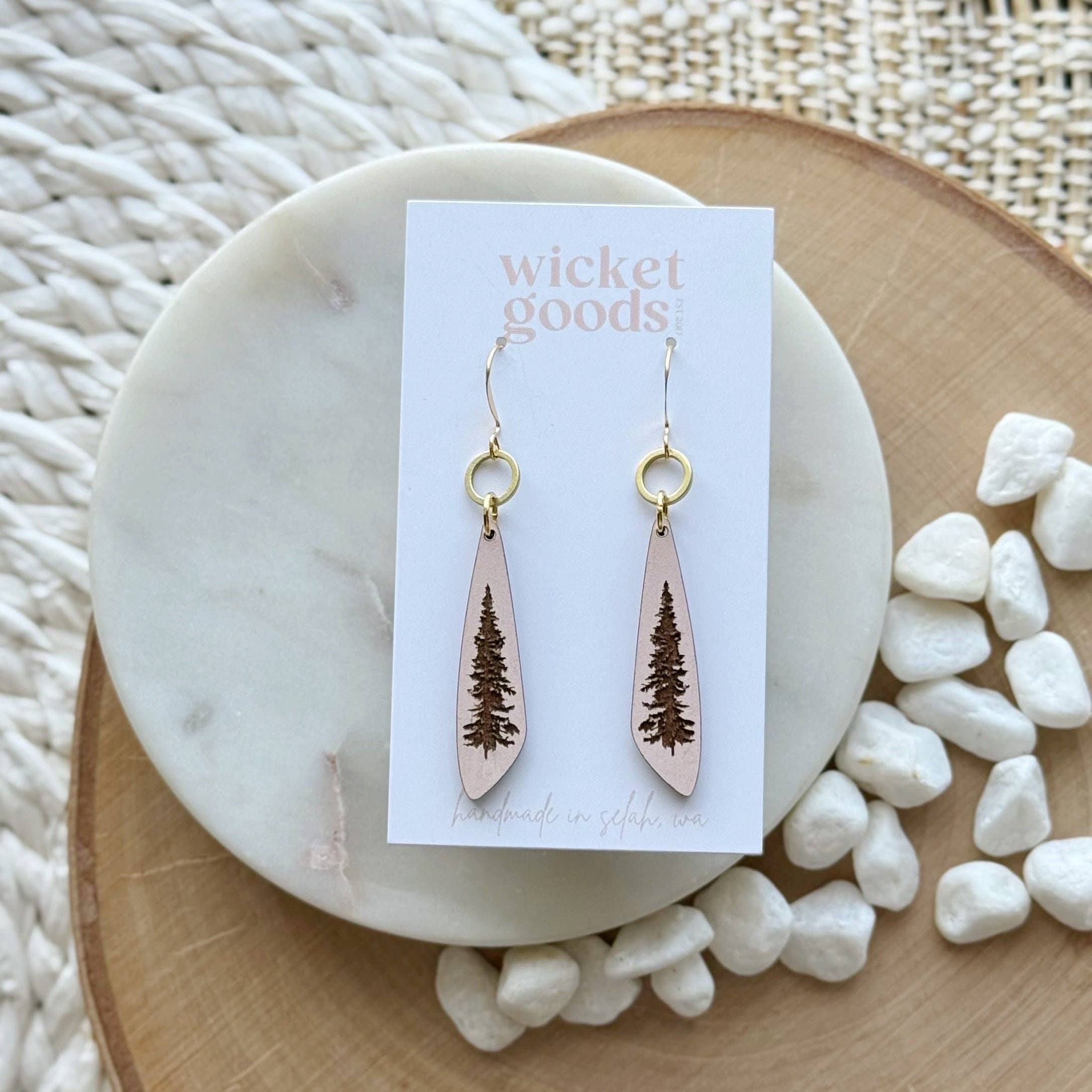 Goederen die de levensstijl van de Pacific Northwest vieren >> Wicket werd opgericht in 2017 en is gevestigd in de prachtige linkerbovenhoek van de Verenigde Staten. Onze handgemaakte sieraden en accessoires zijn geïnspireerd op het landschap, de mensen en plaatsen van Washington, Oregon en Idaho, de staten die deel uitmaken van de Pacific Northwest. Van de torenhoge pijnbomen in de bossen tot de hoge woestijn, bruisende steden, kuststranden en weelderige landerijen - de ruimtes om ons heen bieden een eindeloos canvas van inspiratie voor de stukken die je hier in onze winkel vindt. We vinden het geweldig om elke keer dat we een nieuwe collectie maken of een bestelling verzenden, een beetje thuis met je te delen. Elk sieraad en accessoire is zorgvuldig ontworpen en vervaardigd in onze thuisstudio in Selah, Washington.