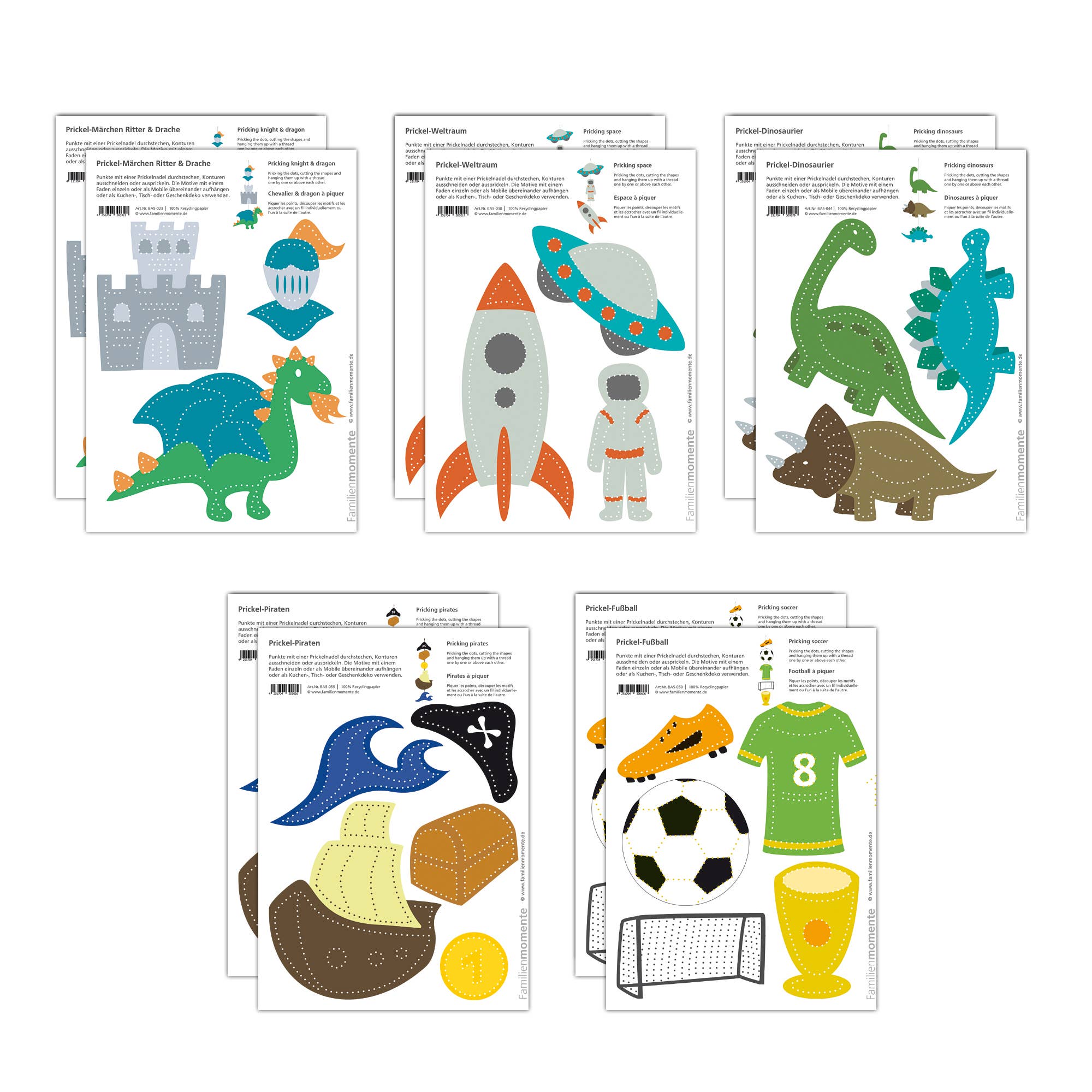 Familie momenten - Maak elk moment waardevol met prikmotieven van Familie momenten. Prikken is een oude knutseltechniek en is door Familie momenten opnieuw ontdekt. Met talrijke sjablonen kunnen verschillende decoraties worden gemaakt - mobielen, windlichten, wenskaarten, tafeldecoraties en nog veel meer. De prikkaarten met cijfers en letters ondersteunen het leren met alle zintuigen.