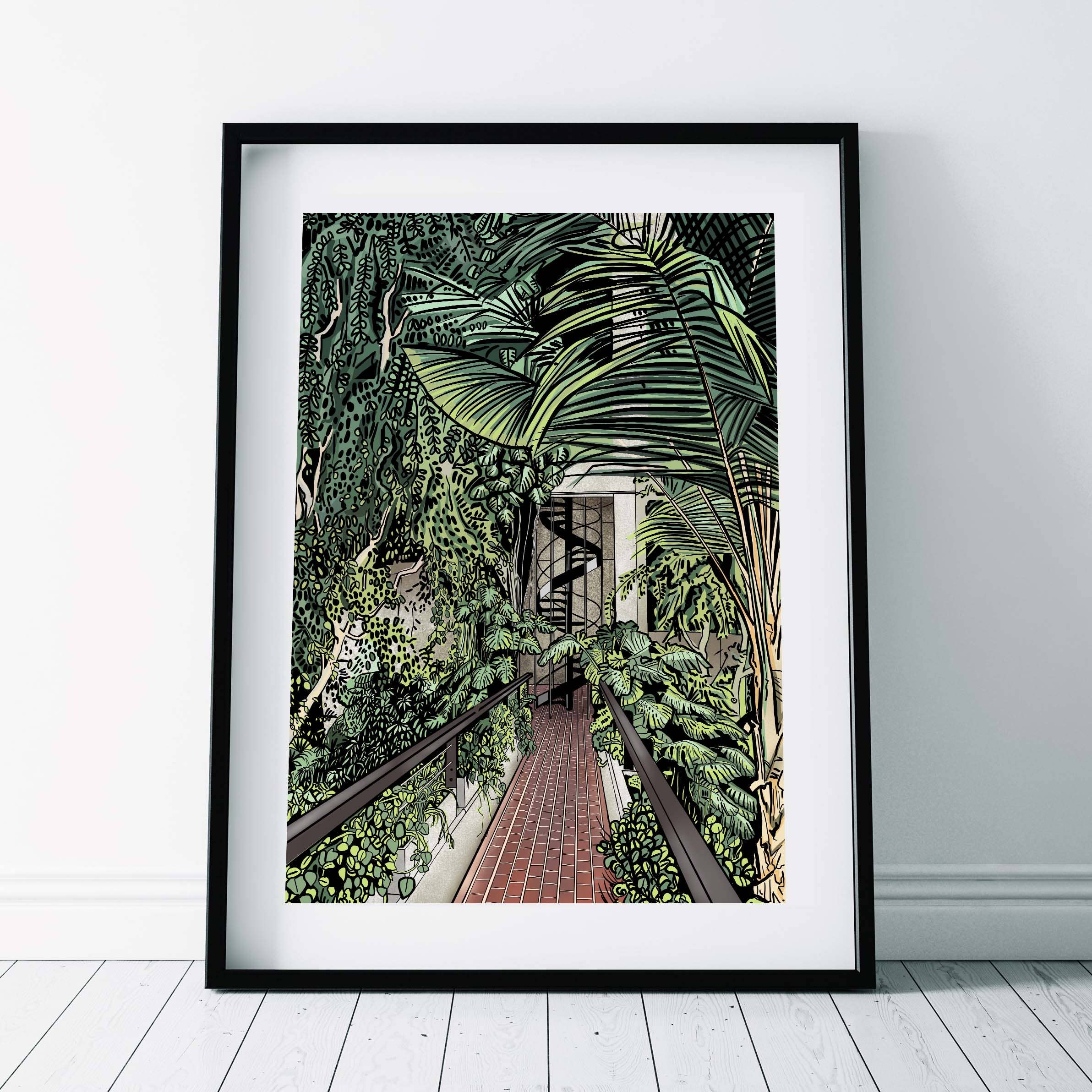 Freya Hufton maakt gedurfde en vrolijke ontwerpen geïnspireerd door de natuur, architectuur en patronen. Na het behalen van een architectuurdiploma begon Freya de kassen in Kew Gardens te illustreren als een vorm van escapisme tijdens de eerste lockdown van 2020. Sindsdien is ze doorgegaan met het tekenen van botanische tuinen en patronen en heeft ze een reeks wenskaarten gemaakt, kunstafdrukken, briefpapier en textielproducten. Deze ontwerpen vieren het plantenleven in harmonie met architectonische structuren, en de rijke kleuren en details in de natuurlijke wereld.