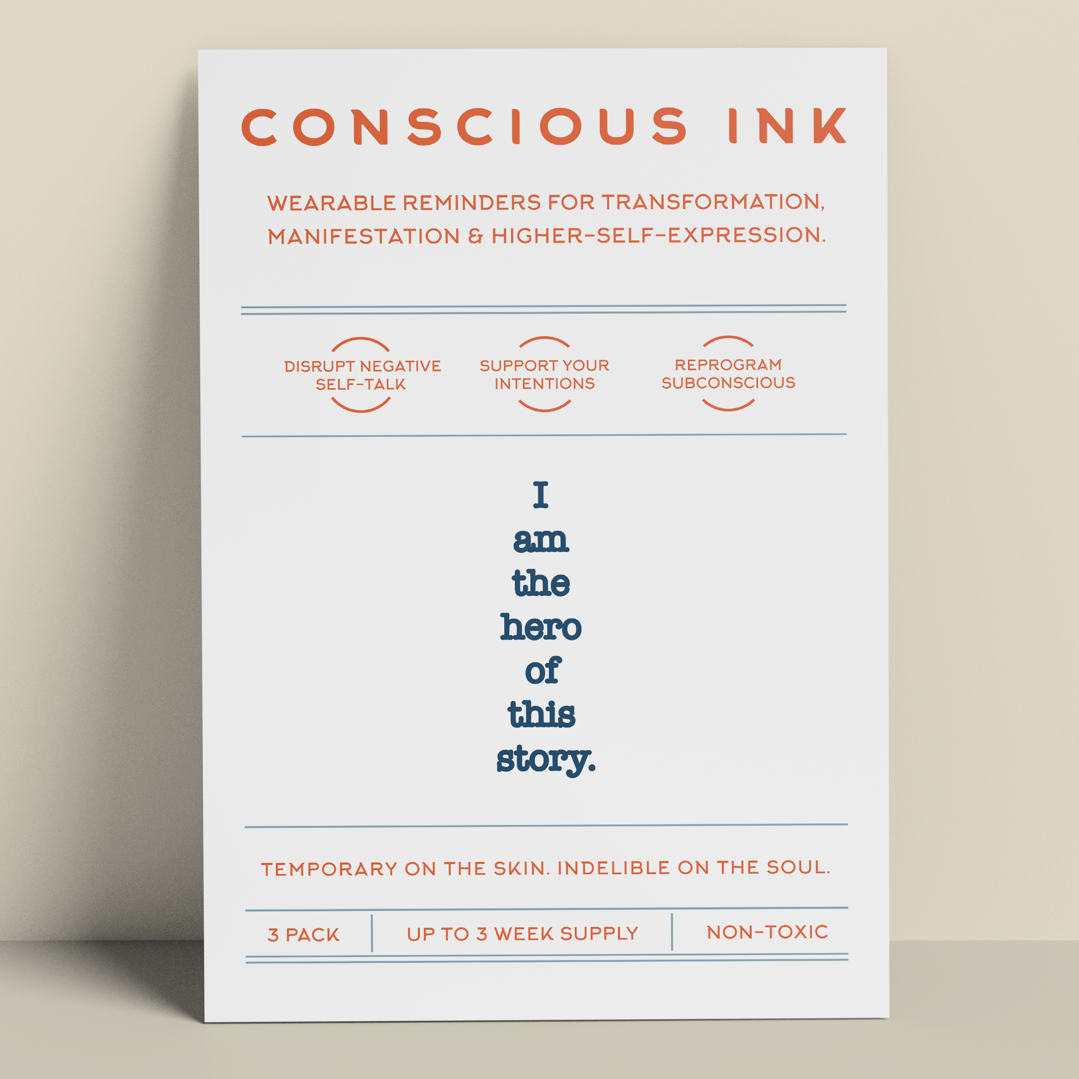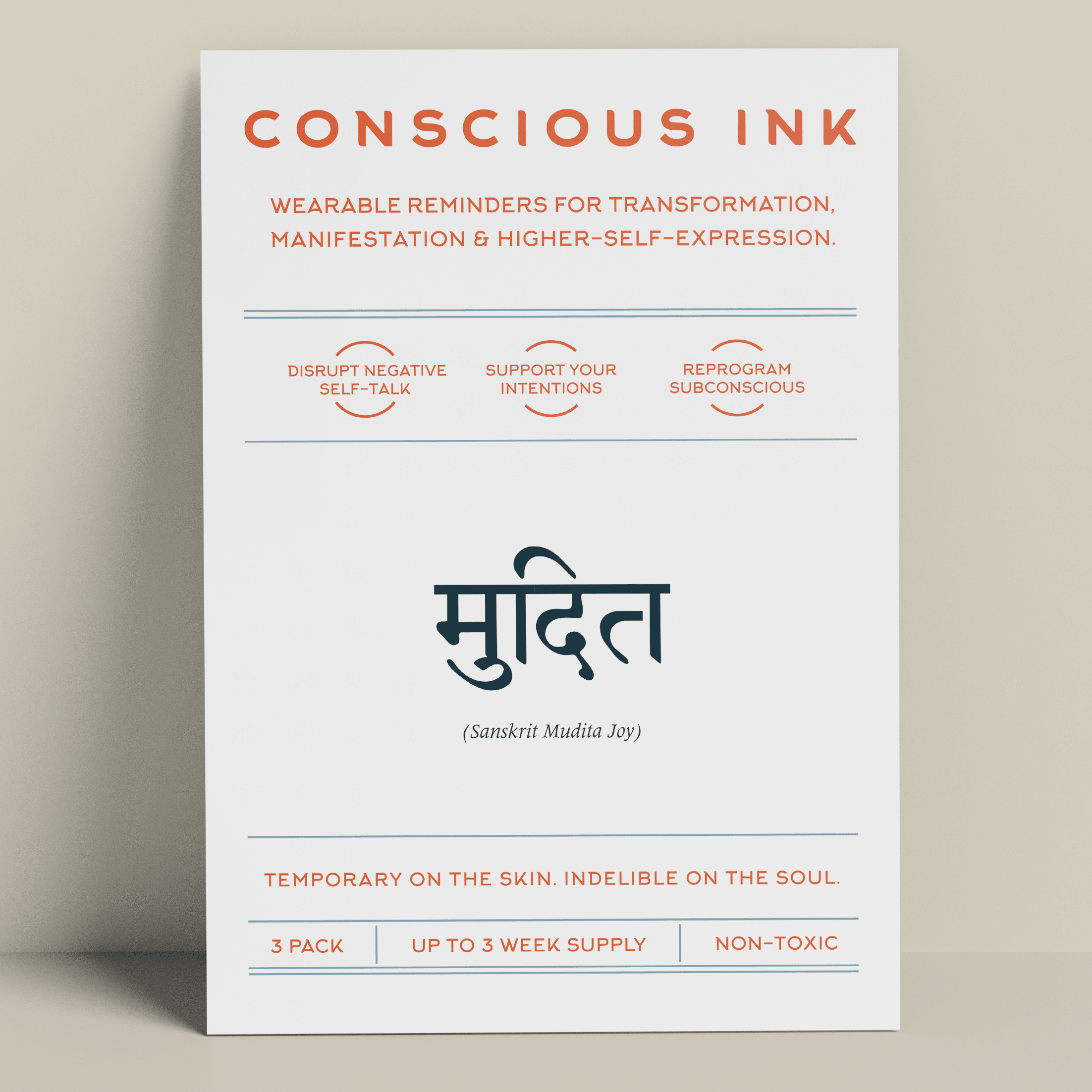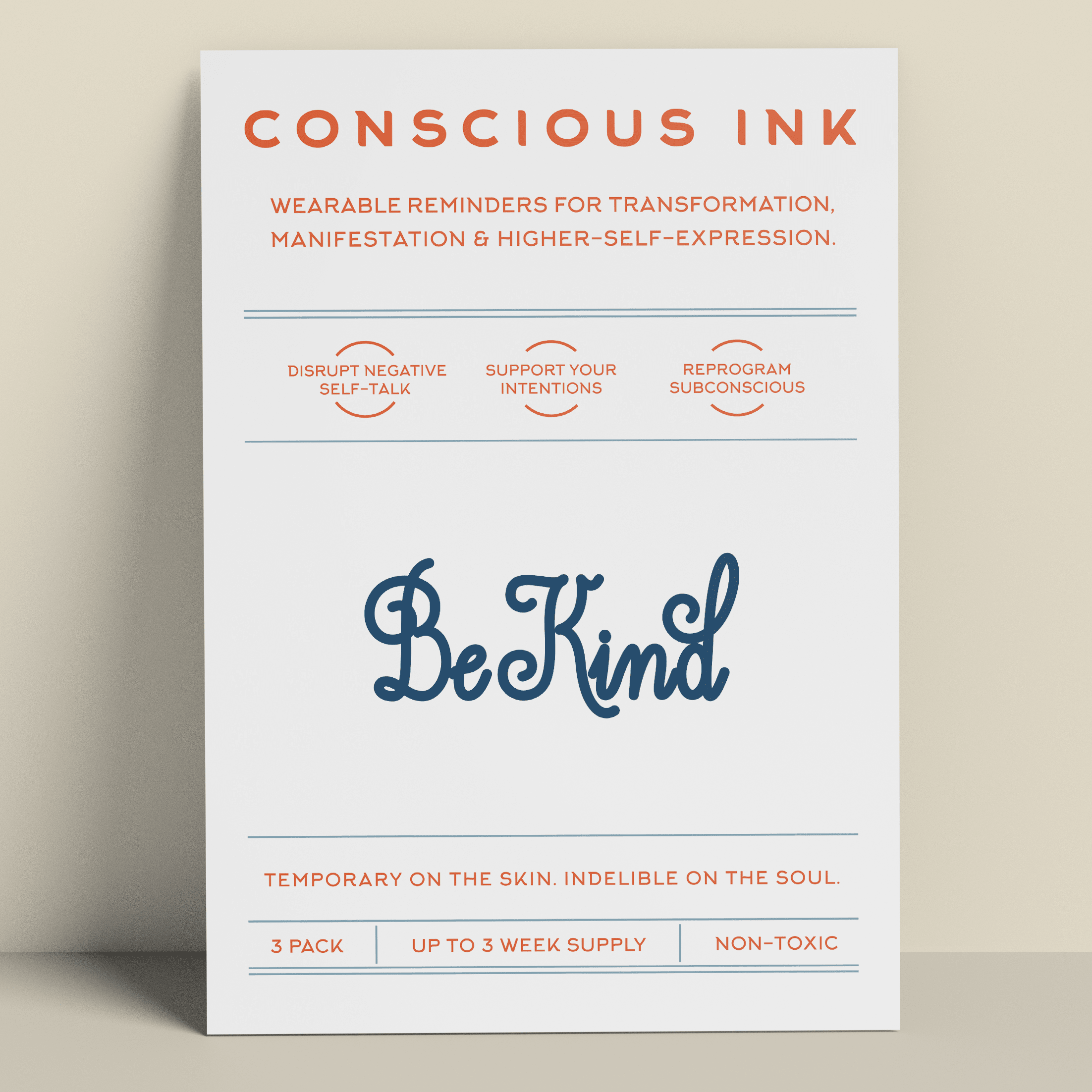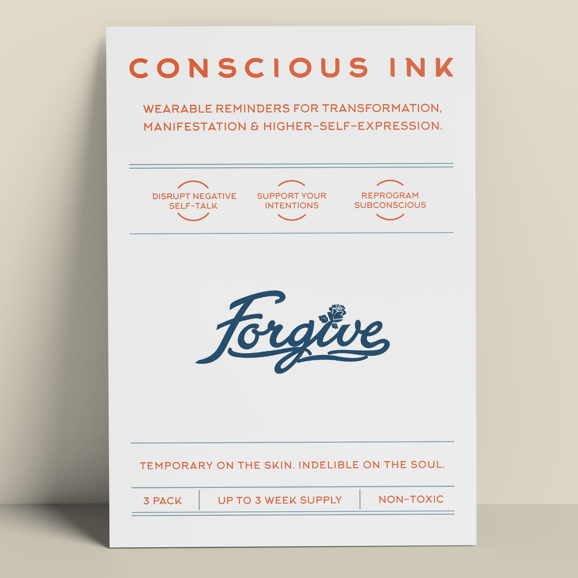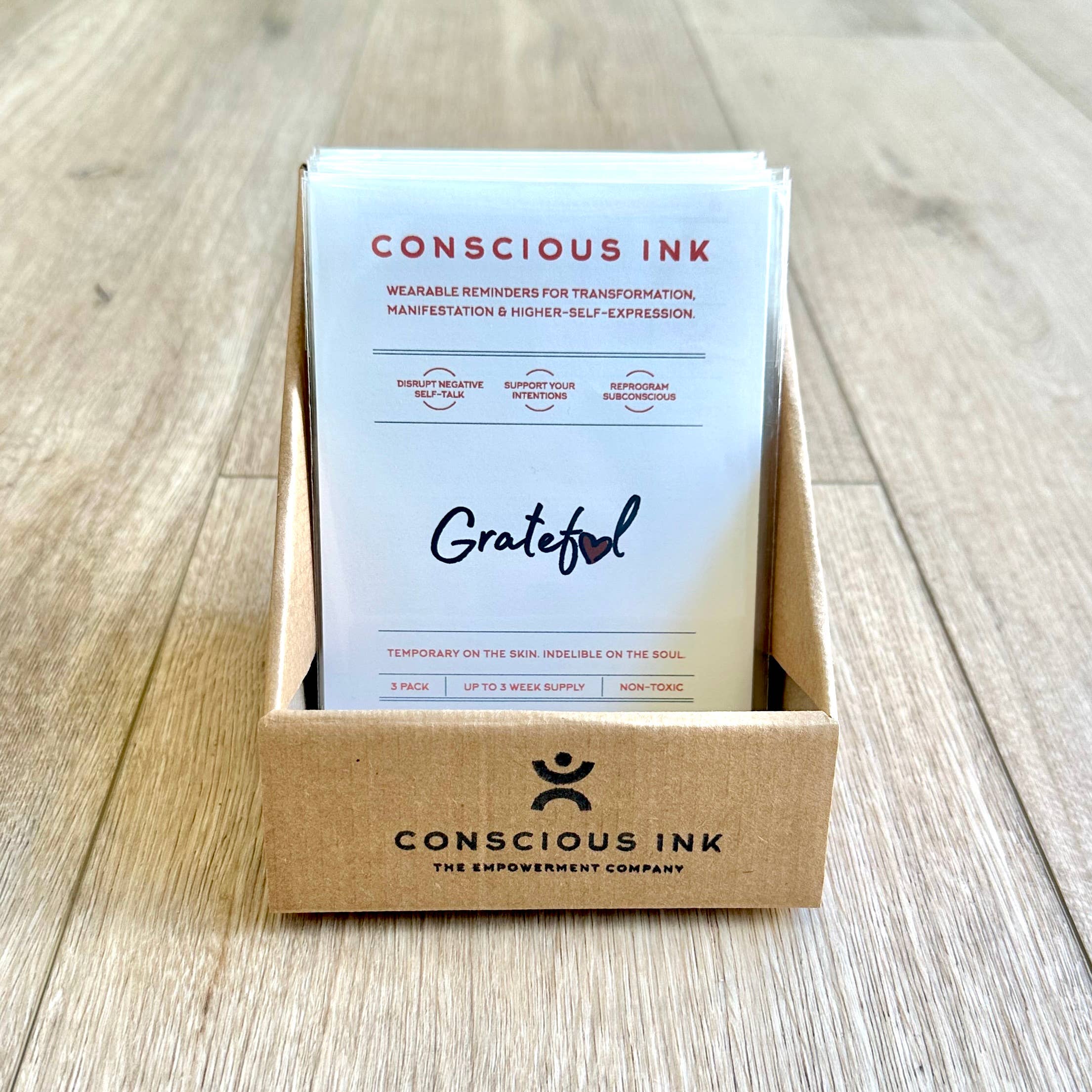 Conscious Ink, opgericht in 2010, opgericht door een expert op het gebied van persoonlijke ontwikkeling, is het eerste bedrijf ooit dat tijdelijke tatoeages gebruikt om mensen te ondersteunen bij het vervullen van hun intenties, dromen en verlangens. Onze tijdelijke Manifestatie Tattoos zijn verrassend krachtig en zijn draagbare herinneringen die zijn gemaakt om negatieve zelfpraat en zelfvernietigend gedrag te verstoren en om nieuwe zelfbevestigende gewoonten te bevorderen. De resultaten zijn zelfs levensveranderend geweest. Lees onze recensies! Elke Conscious Ink gaat gemiddeld 3-7 dagen mee (afhankelijk van de juiste toepassing, plaatsingsgebied, huidtype en activiteitsniveau). Conscious Ink is niet giftig, gemaakt in de VS met FDA-gecertificeerde inkten van cosmetische kwaliteit, die voldoet aan of overtreft alle wettelijke vereisten van de VS, Canada en de Europese Unie, inclusief veiligheidsnormen voor cosmetica en speelgoedproducten. TIPS VOOR GEBRUIK, LANGDURIG GEBRUIK EN MANIFESTATIE 1.