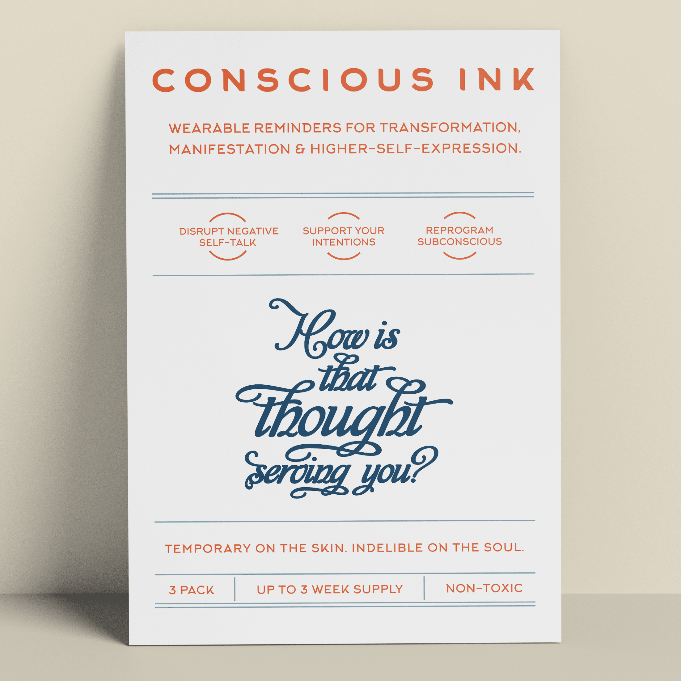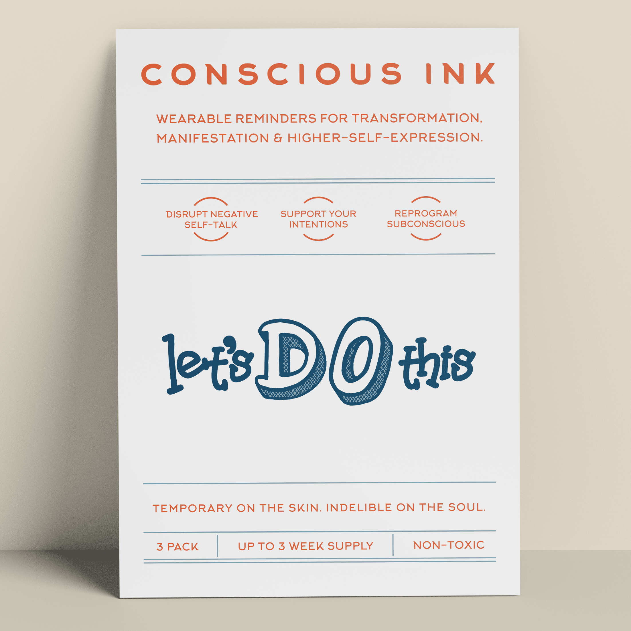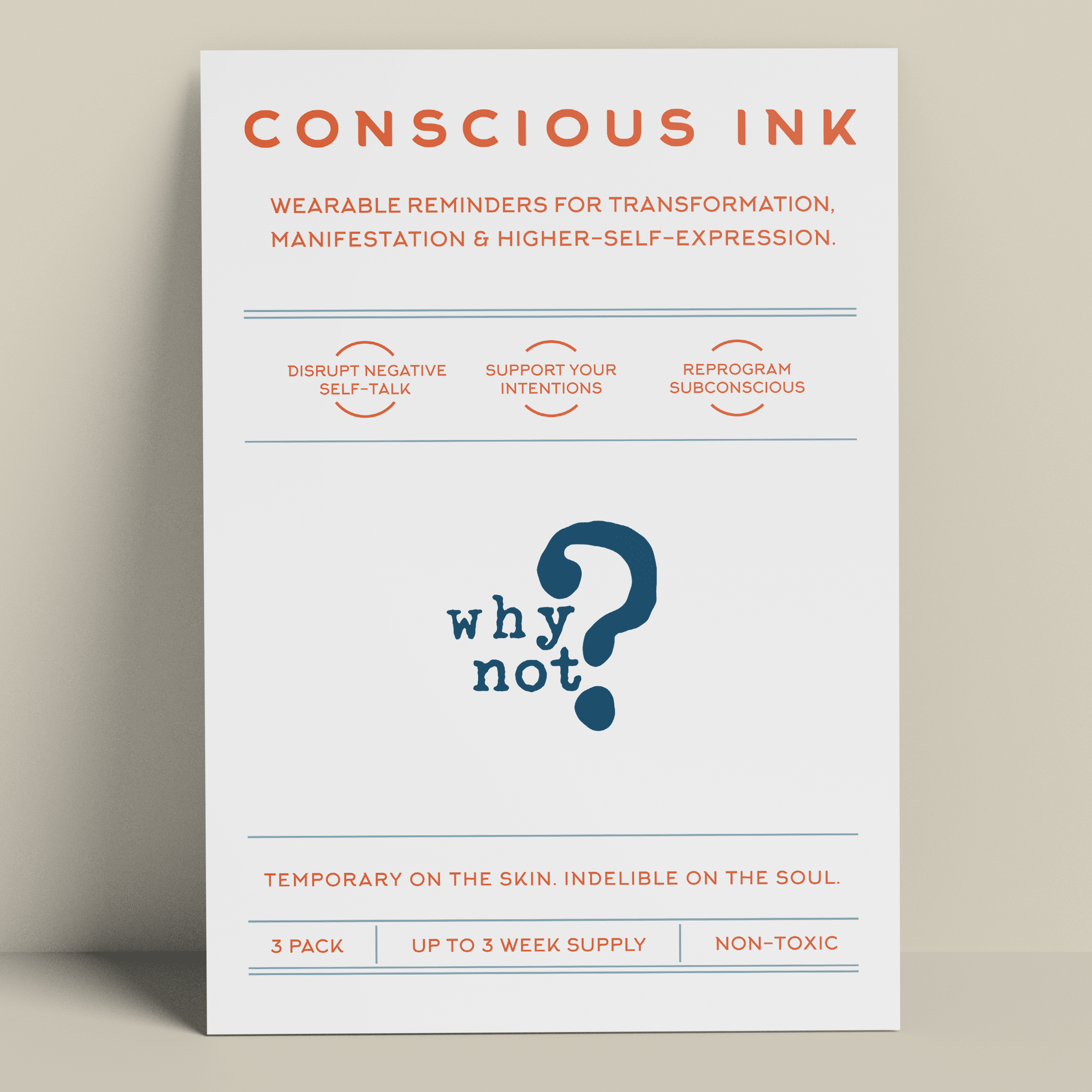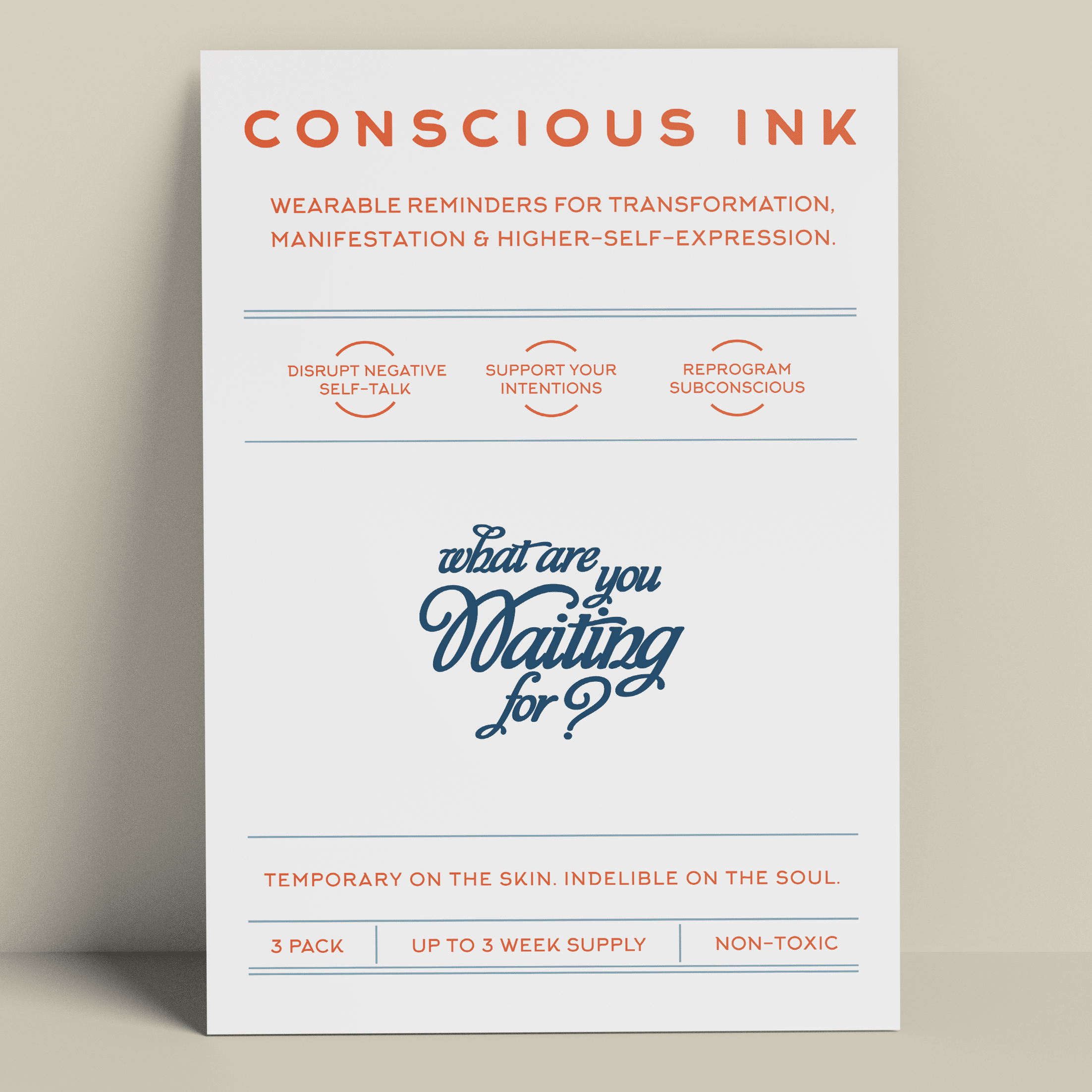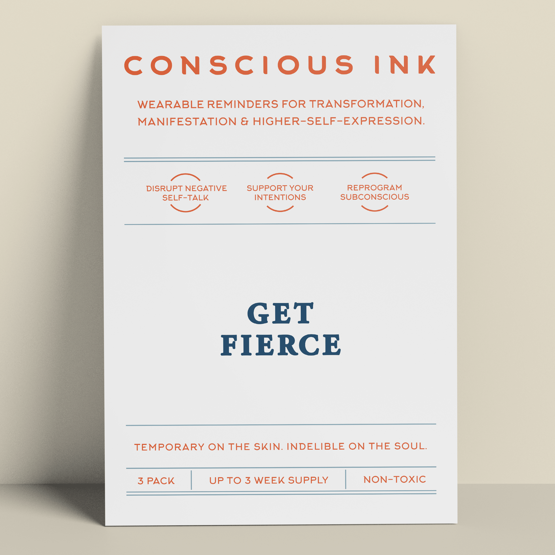 Conscious Ink, opgericht in 2010, opgericht door een expert op het gebied van persoonlijke ontwikkeling, is het eerste bedrijf ooit dat tijdelijke tatoeages gebruikt om mensen te ondersteunen bij het vervullen van hun intenties, dromen en verlangens. Onze tijdelijke Manifestatie Tattoos zijn verrassend krachtig en zijn draagbare herinneringen die zijn gemaakt om negatieve zelfpraat en zelfvernietigend gedrag te verstoren en om nieuwe zelfbevestigende gewoonten te bevorderen. De resultaten zijn zelfs levensveranderend geweest. Lees onze recensies! Elke Conscious Ink gaat gemiddeld 3-7 dagen mee (afhankelijk van de juiste toepassing, plaatsingsgebied, huidtype en activiteitsniveau). Conscious Ink is niet giftig, gemaakt in de VS met FDA-gecertificeerde inkten van cosmetische kwaliteit, die voldoet aan of overtreft alle wettelijke vereisten van de VS, Canada en de Europese Unie, inclusief veiligheidsnormen voor cosmetica en speelgoedproducten. TIPS VOOR GEBRUIK, LANGDURIG GEBRUIK EN MANIFESTATIE 1.