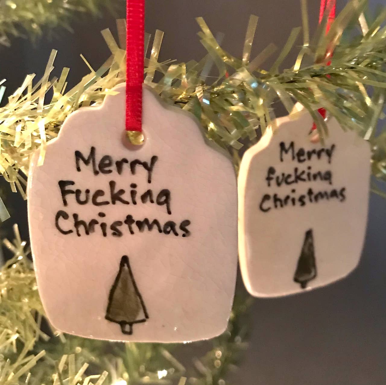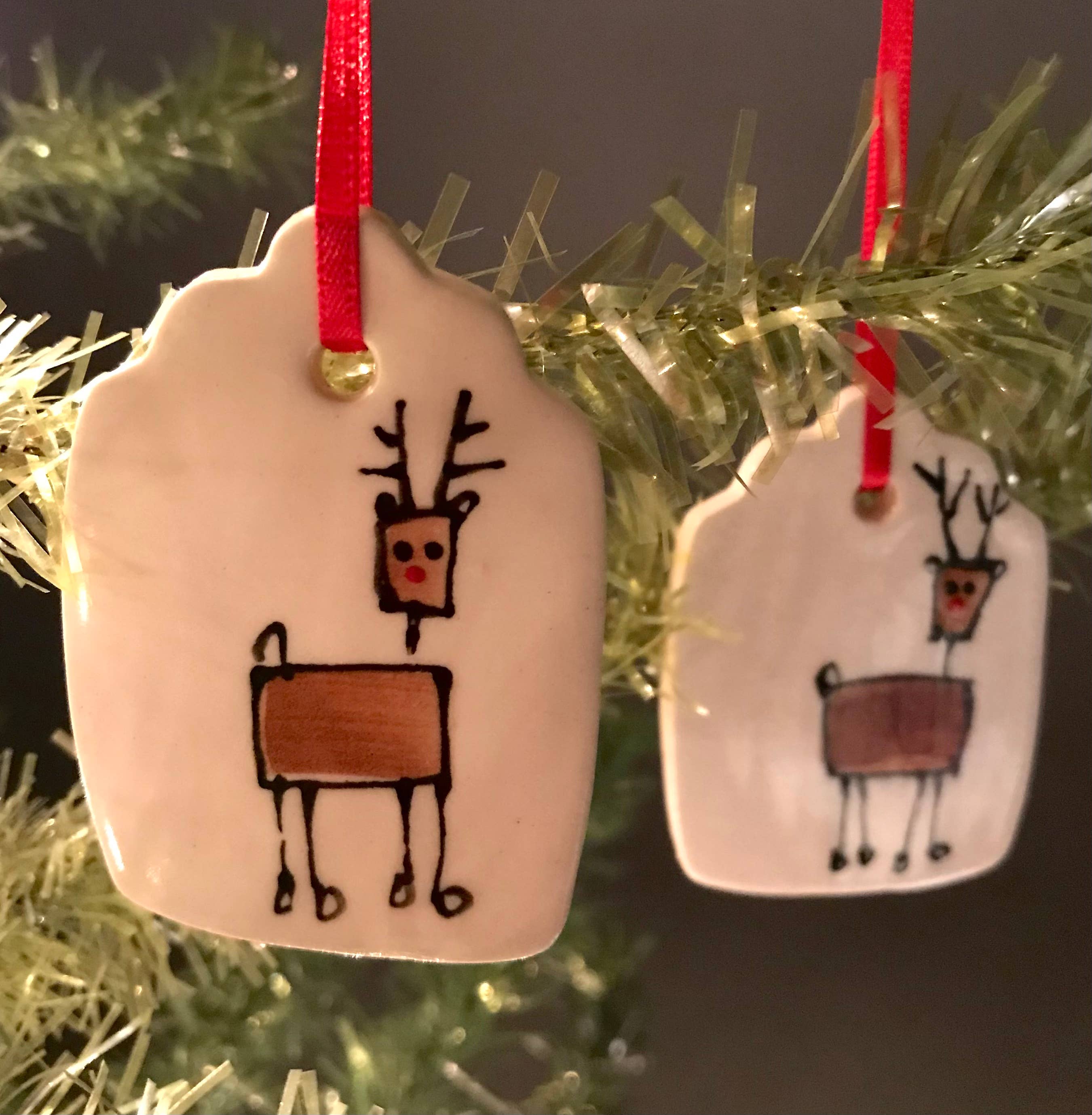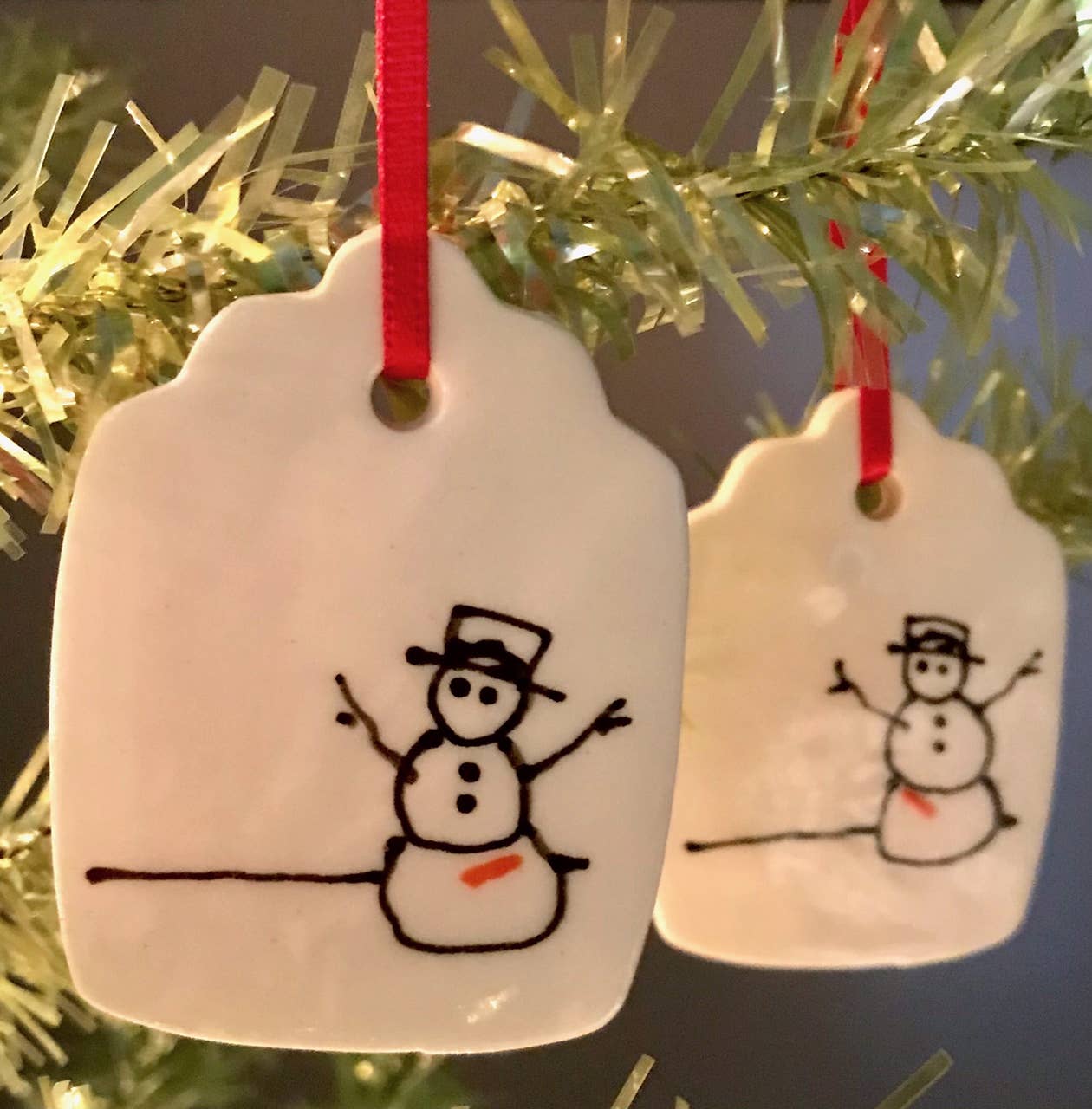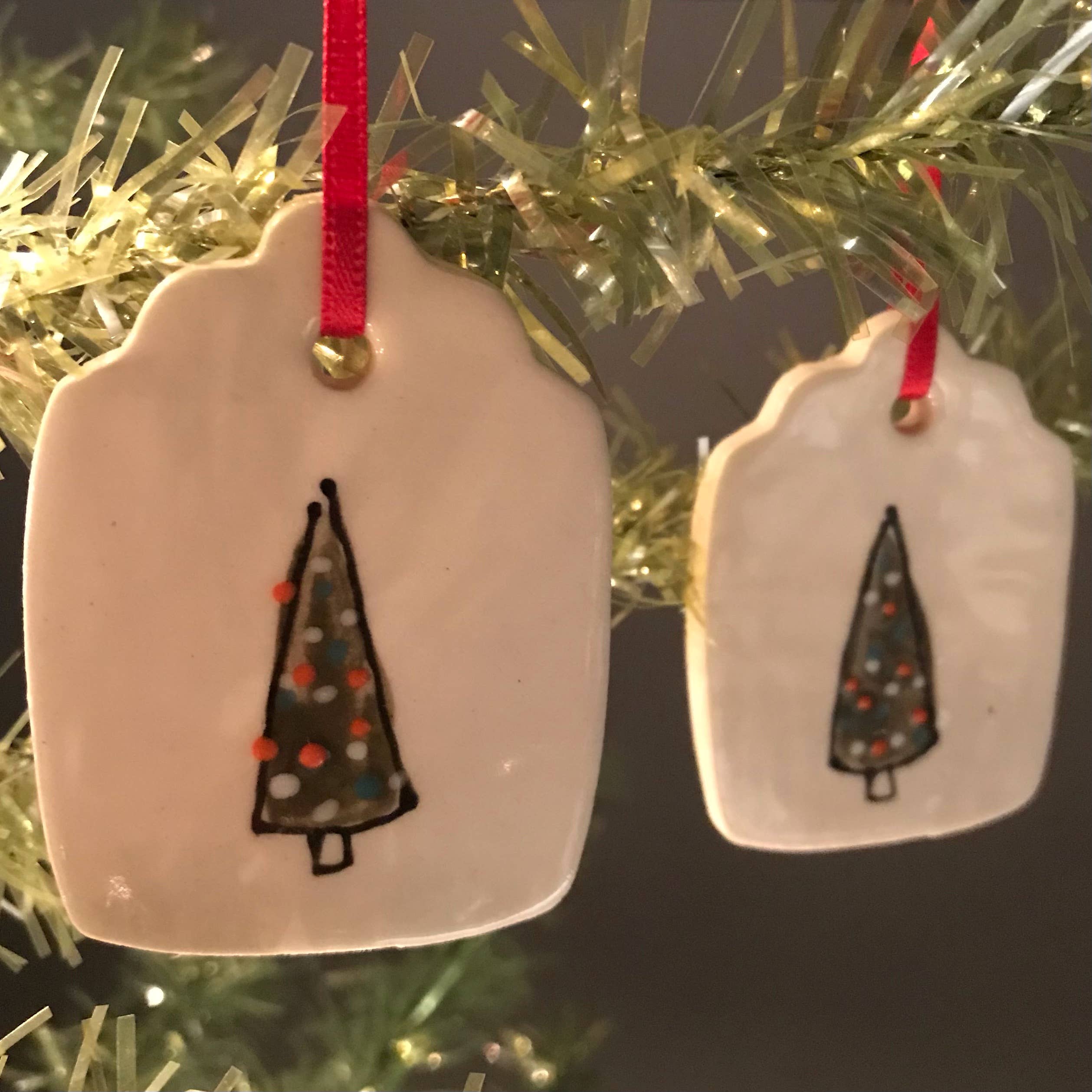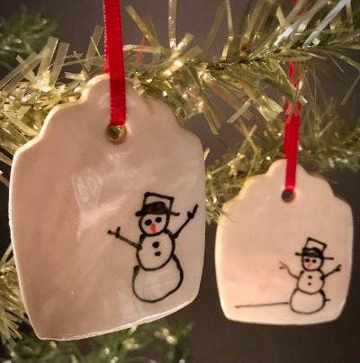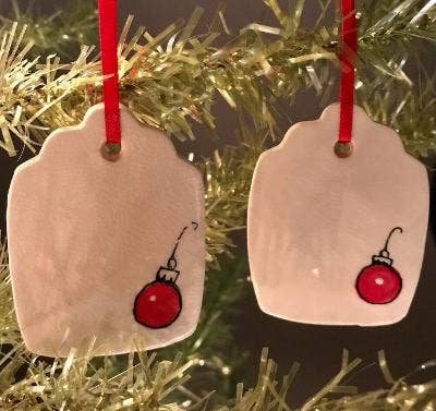 Kathrine Allen en Kyle Osvog zijn beide fulltime artiesten die samenkwamen om aan deze grappige kleine samenwerking te werken. Kyle heeft meer dan 40 jaar ervaring in klei, Kathrine heeft ongeveer 30 jaar ervaring in mixed media, voornamelijk schilderen en prenten. Uit die geweldige 70 jaar ervaring komen hier enkele gekke, ondeugende vakantietags om op je boom te zetten, of op een speciaal pakket.