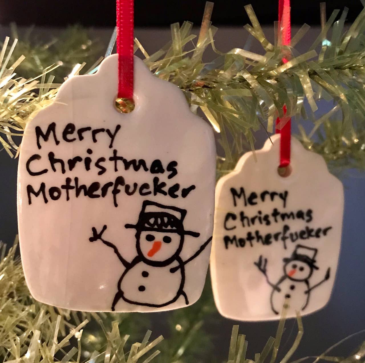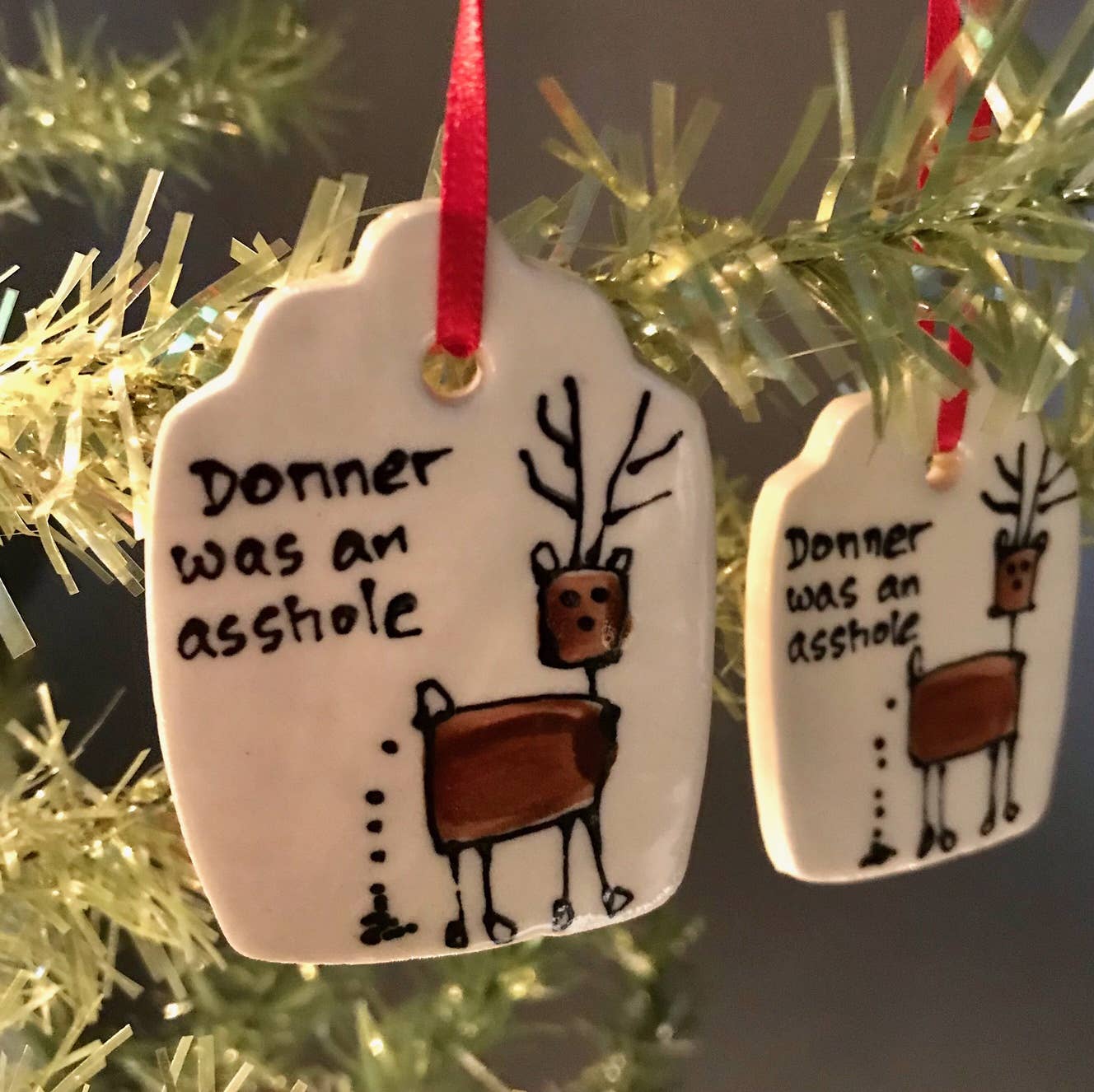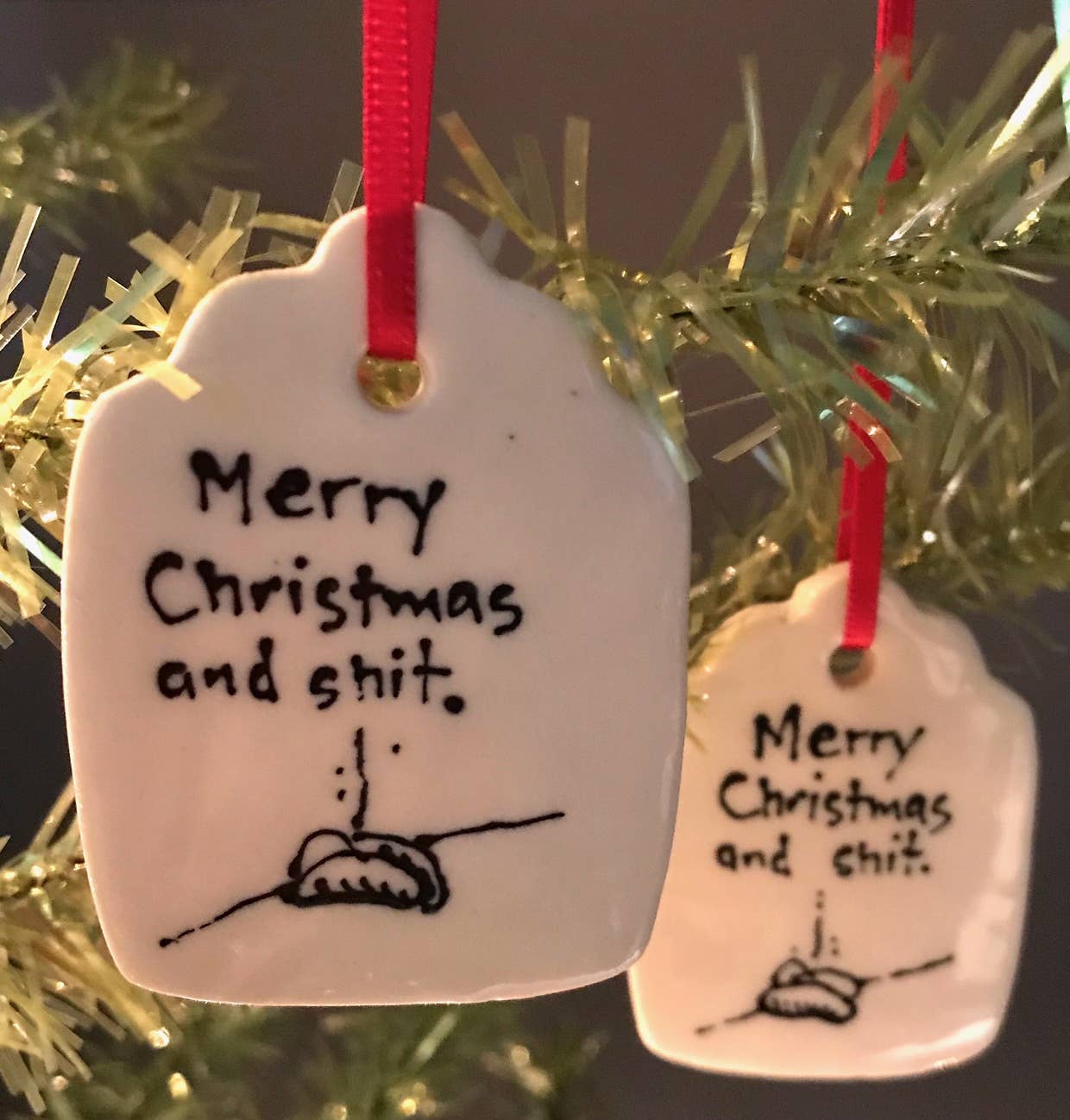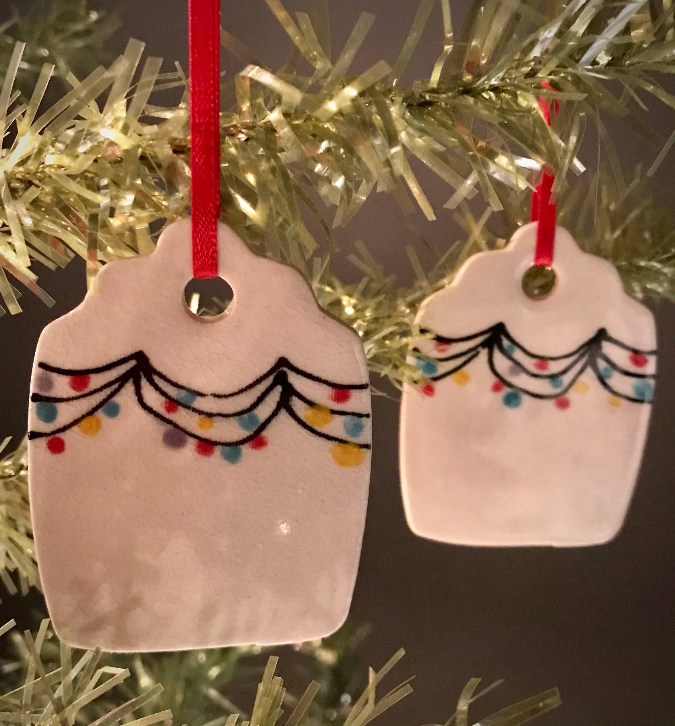 Kathrine Allen en Kyle Osvog zijn beide fulltime artiesten die samenkwamen om aan deze grappige kleine samenwerking te werken. Kyle heeft meer dan 40 jaar ervaring in klei, Kathrine heeft ongeveer 30 jaar ervaring in mixed media, voornamelijk schilderen en prenten. Uit die geweldige 70 jaar ervaring komen hier enkele gekke, ondeugende vakantietags om op je boom te zetten, of op een speciaal pakket.