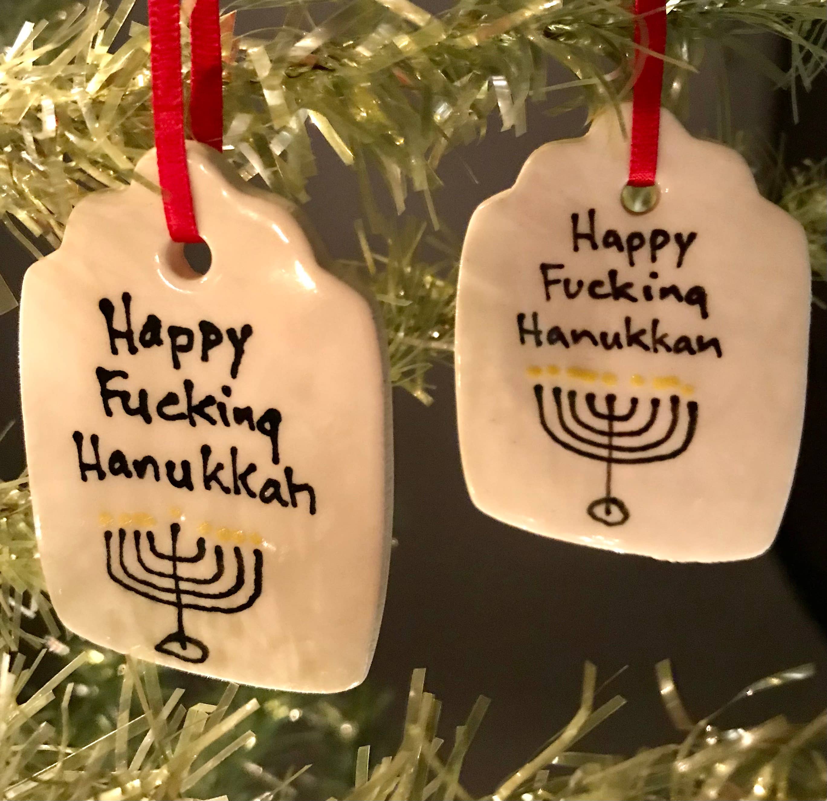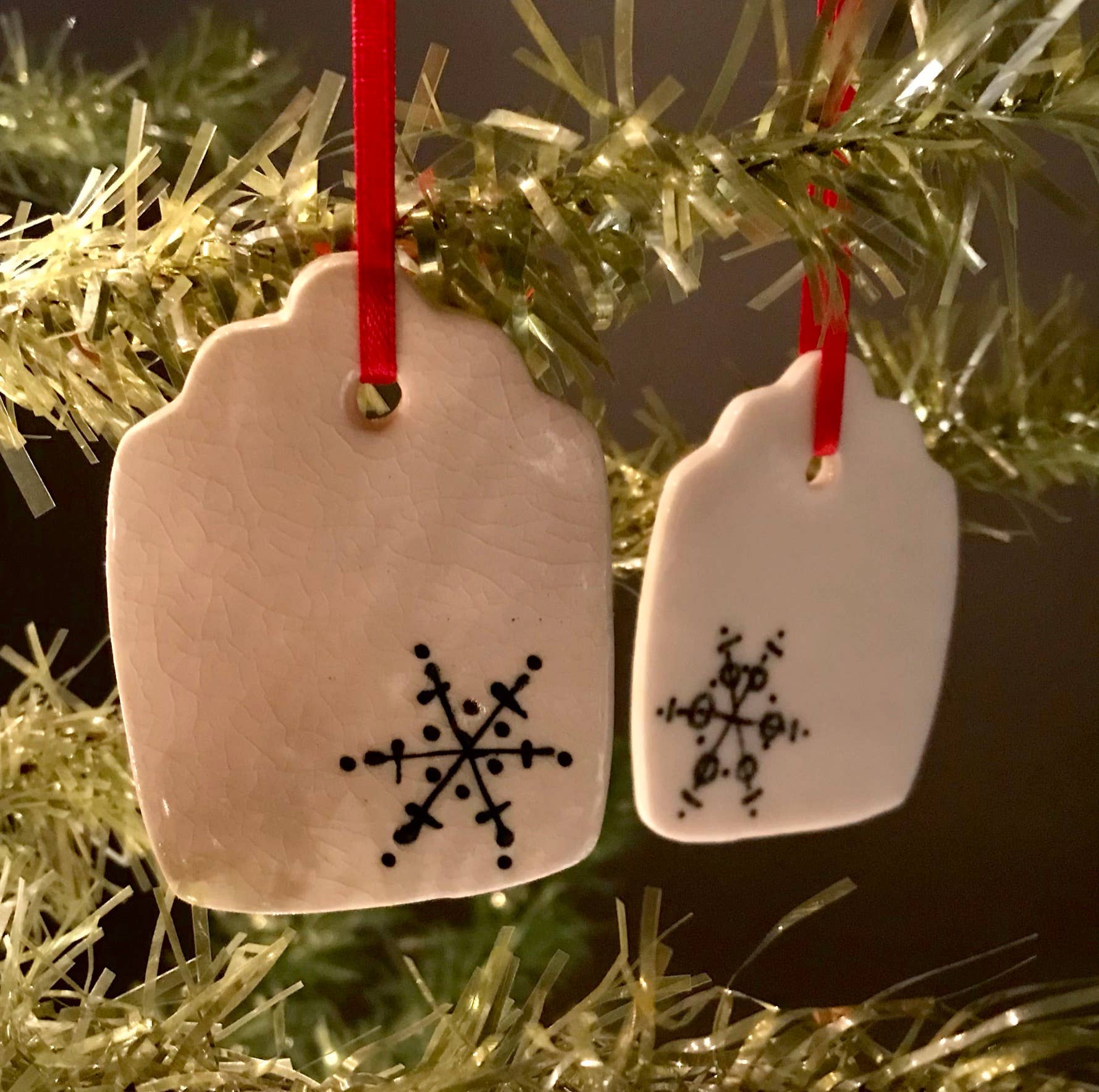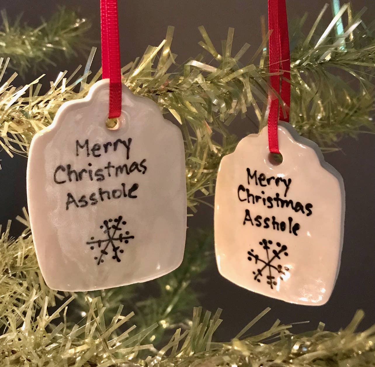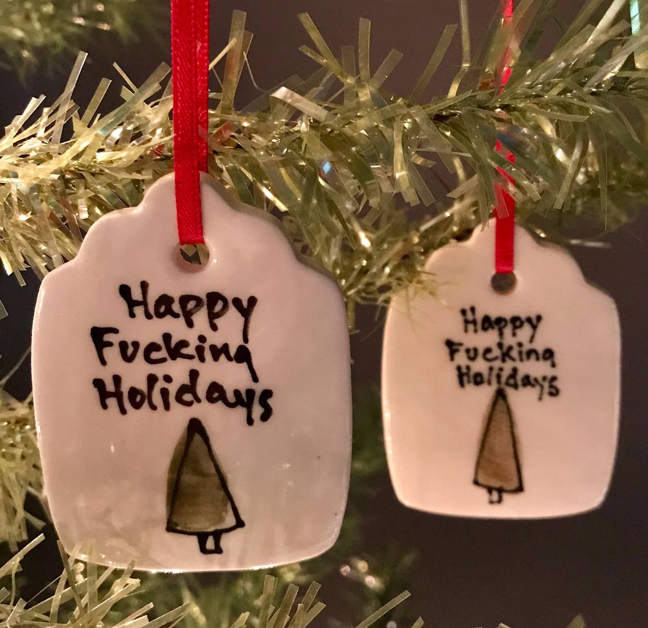 Kathrine Allen en Kyle Osvog zijn beide fulltime artiesten die samenkwamen om aan deze grappige kleine samenwerking te werken. Kyle heeft meer dan 40 jaar ervaring in klei, Kathrine heeft ongeveer 30 jaar ervaring in mixed media, voornamelijk schilderen en prenten. Uit die geweldige 70 jaar ervaring komen hier enkele gekke, ondeugende vakantietags om op je boom te zetten, of op een speciaal pakket.