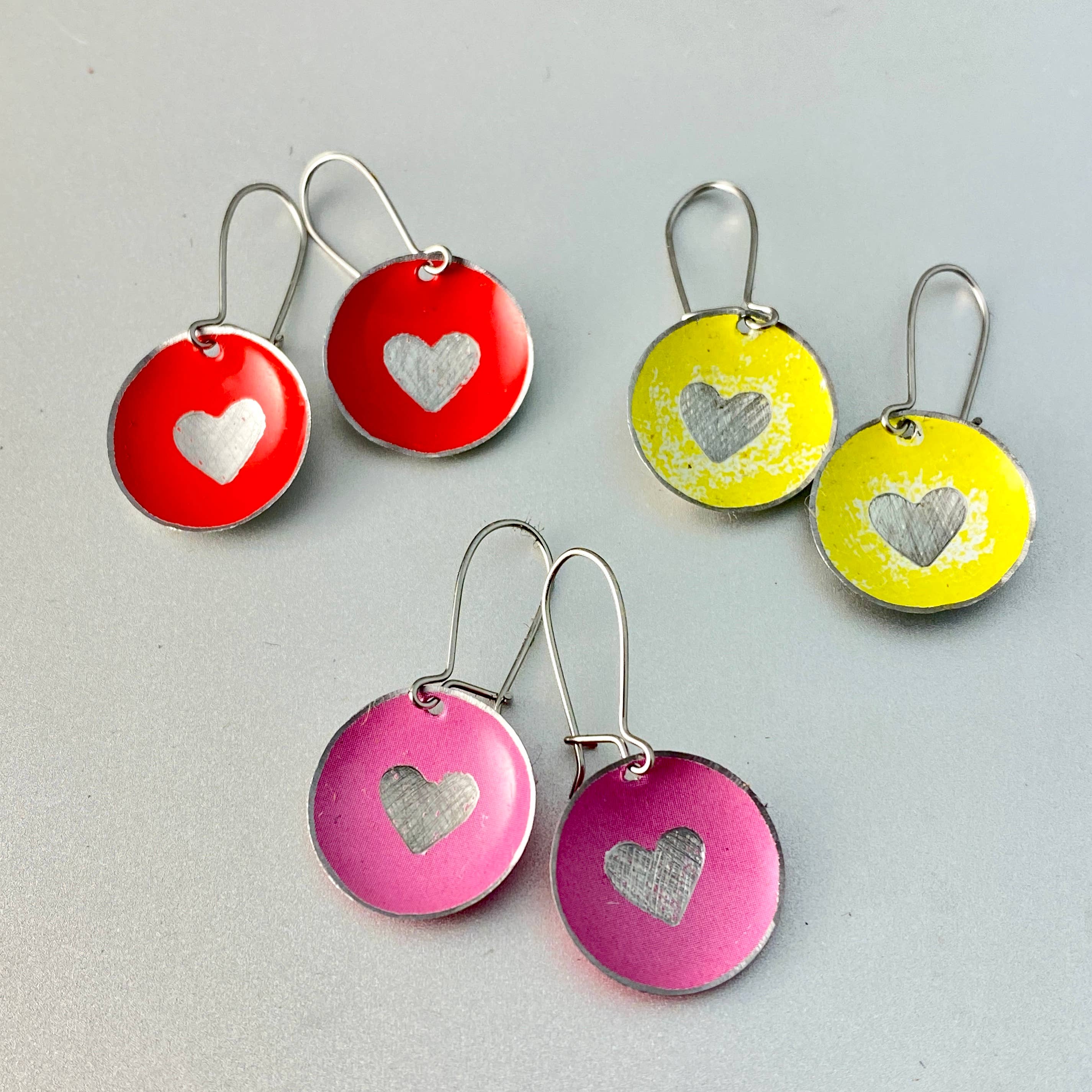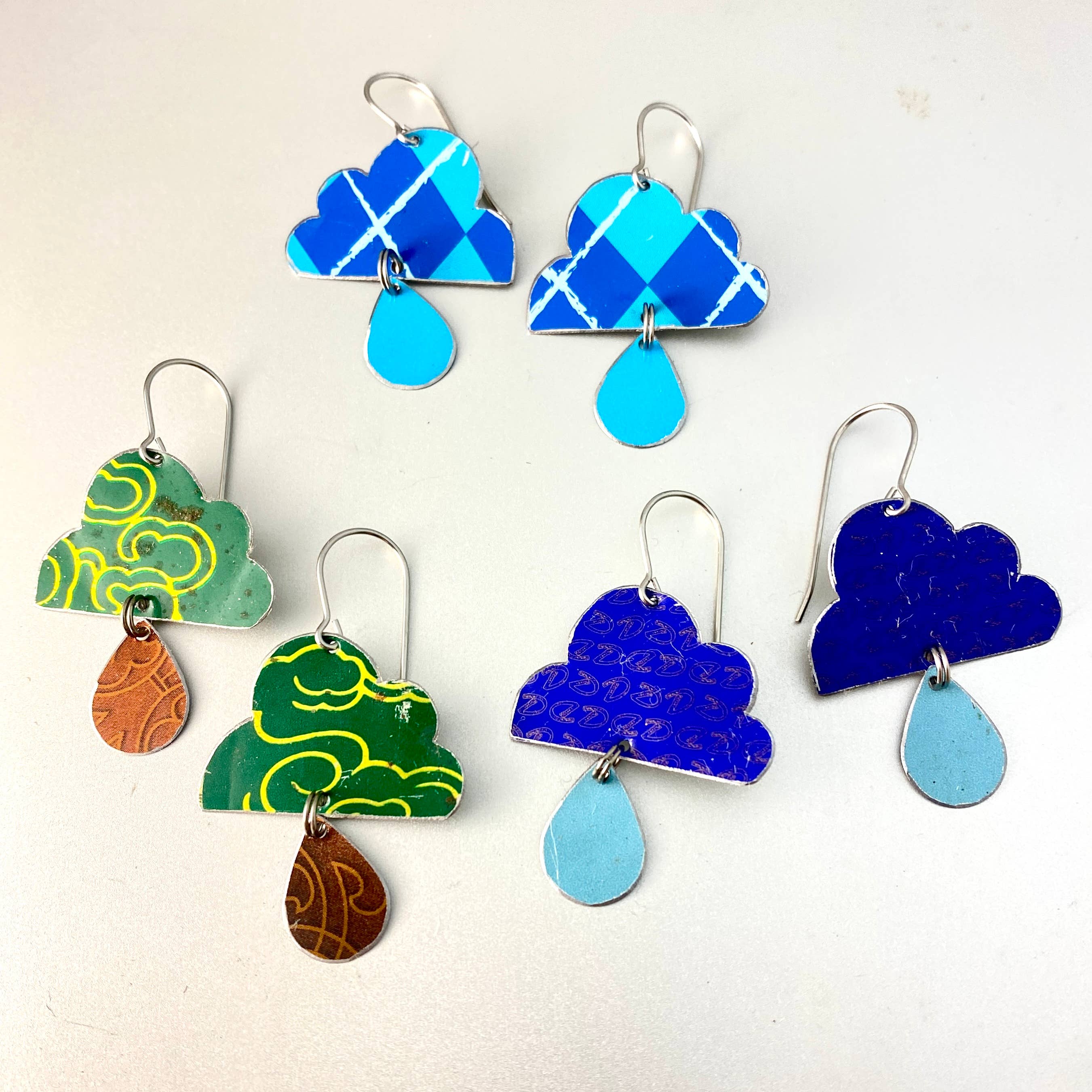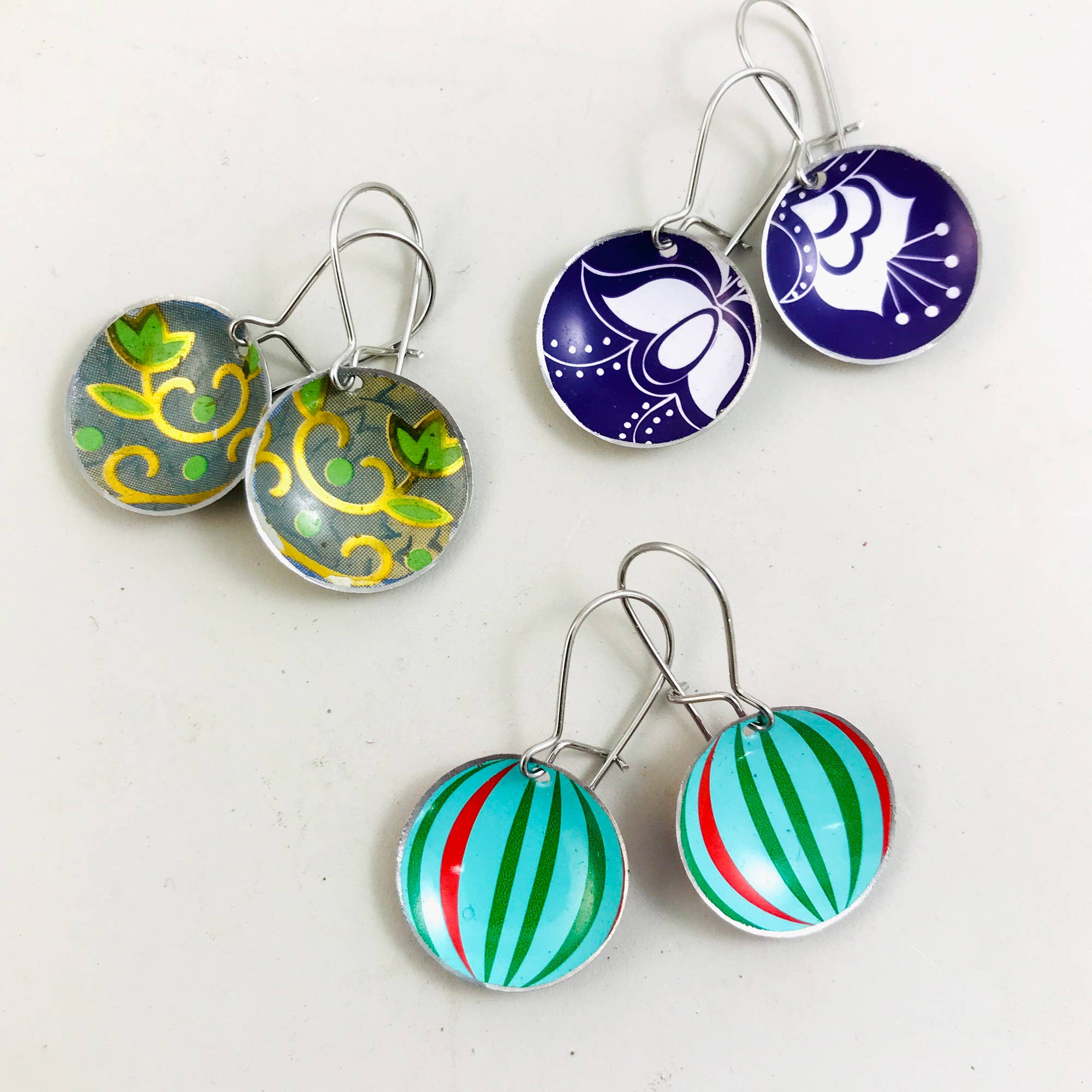 Als fervent kringloopshopper was Christine dolblij om een manier te vinden om al die onbeminde decoratieve blikken te gebruiken als prachtige, unieke sieraden. Elk stuk is individueel handgemaakt en perfect voor vrouwen die hun unieke stem in de wereld willen uiten. In tegenstelling tot zilver, goud of koper, zijn blikken verkrijgbaar in een eindeloze reeks kleuren en patronen. Veel blikken waren ooit hun eigen vormen van reclame. Gedrukt met afbeeldingen en typografie uit het verleden, spreken deze blikken rechtstreeks aan Christine's opleiding als grafisch ontwerper en liefde voor vintage commercieel ontwerp en ephemera. Het gebruik van upcycled en niet-kostbare materialen is haar bewuste keuze om te werken met materialen die al bestaan zonder verdere winning van hulpbronnen. Christine's eco-bewuste esthetiek resoneert diep met mensen die ernaar streven hun impact op de planeet te verminderen, evenals degenen die gewoon iets moois willen dragen. Tin is van nature dun en licht materiaal, dus zelfs grote oorbellen kunnen in alle comfort worden gedragen.