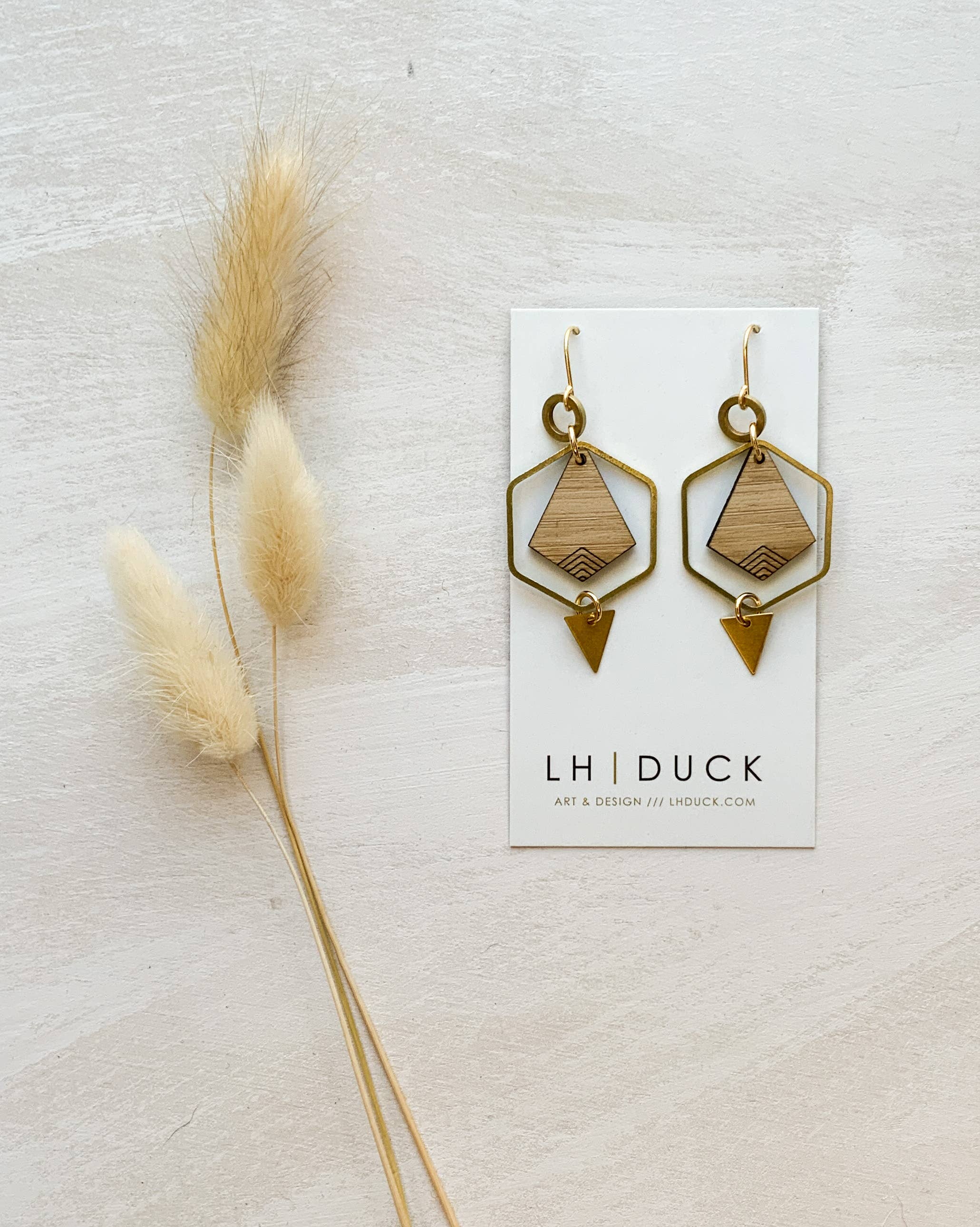 Ik run dit kleine bedrijf in de uitlopers van Noord-Californië. Elk sieraad dat je hier ziet, wordt in kleine batches gemaakt in mijn thuisstudio. Ik ben overdag grafisch ontwerper en's nachts ambachtsman. Mijn werk op het gebied van ontwerp stimuleert mijn creativiteit en zet me aan om nieuwe vormcombinaties en patronen te verkennen. Al mijn ontwerpen zijn geïnspireerd op mijn liefde voor geometrische vormen en strakke lijnen. Ik streef ernaar sieraden te maken die betaalbaar en uniek zijn. Alles is klaar om te worden gecombineerd met elke outfit voor elke gelegenheid. Proost! Lindsay Maker, eigenaar en ontwerper van LHDUCK ***Al mijn oorbellen maken gebruik van ruwe messing en bamboecomponenten en hebben vergulde koperen oorhaakjes en springringen. ***