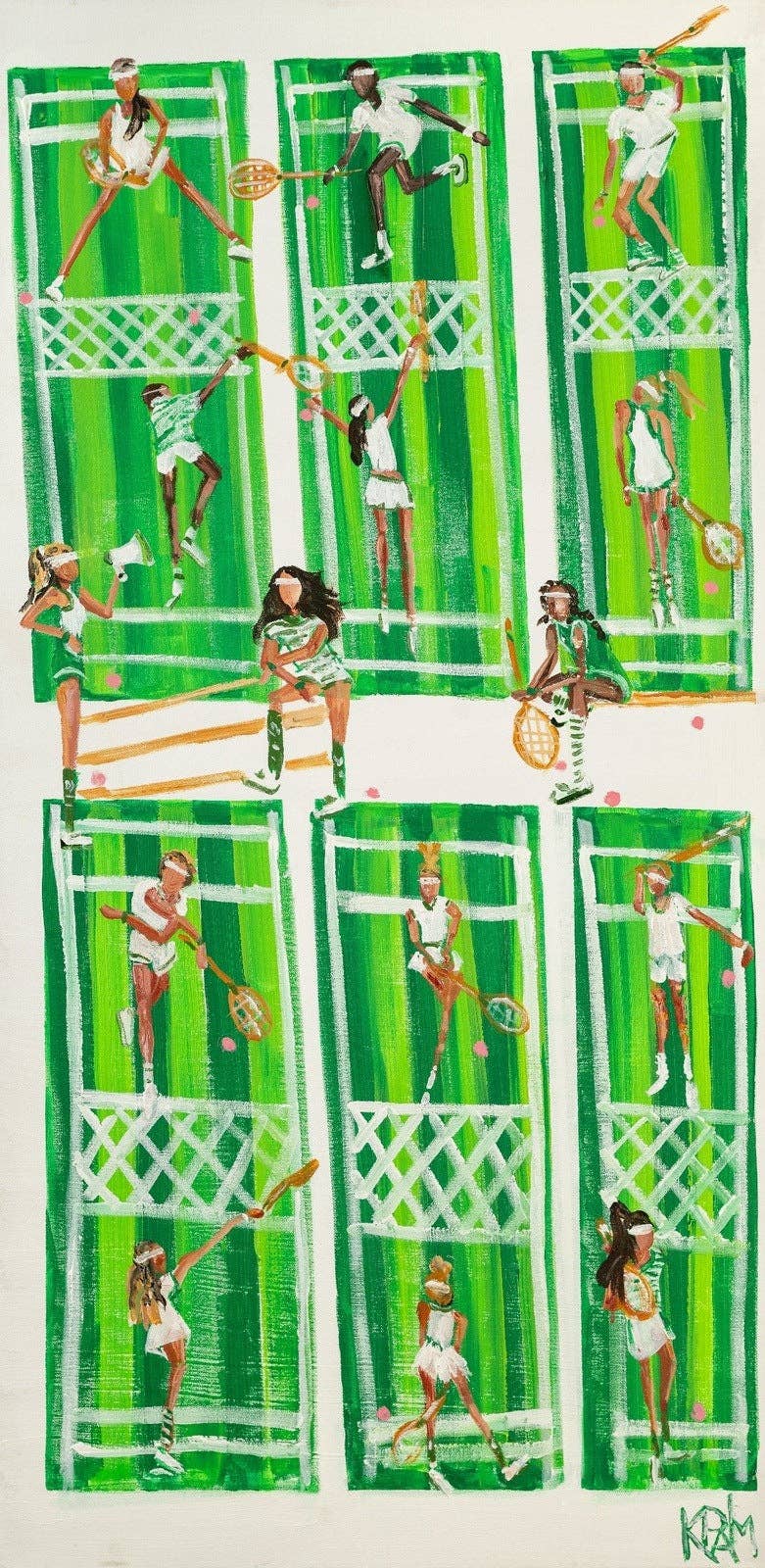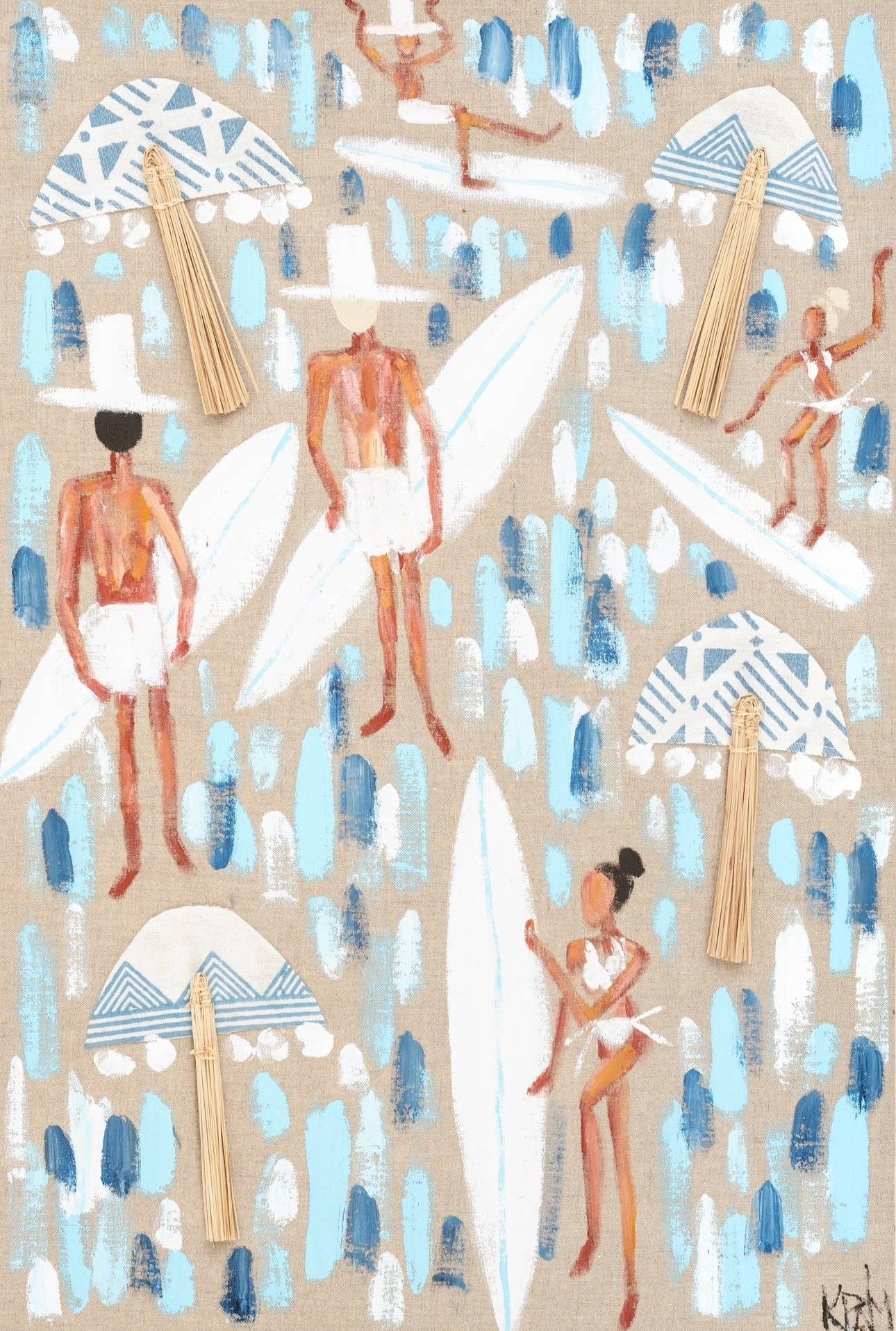 Hallo, ik ben Kathleen Palmeri, de kunstenaar achter KPalm. Ik ben altijd al een kunstenaar geweest. Voordat ik kon spreken, vond ik mijn weg in de wereld door te tekenen, kleuren en schilderen. Kunst maken is hoe ik mijn wereld begrijp en communiceer wat ik zie en voel. Ik studeerde Schone Kunsten aan de Mason Gross School of the Arts van Rutgers University en behaalde later een Master of Science in Counseling aan de New York University. Hoewel mijn professionele pad het werken als studieadviseur in New York City omvatte, is kunst de constante draad gebleven in elke fase van mijn leven. Ik ben ook een echtgenote en moeder van vijf kinderen, wat een diepe invloed heeft gehad op wie ik ben en het werk dat ik creëer. Mijn schilderijen zijn gelaagd en getextureerd, vaak gecentreerd rond sterke en krachtige figuren. Ik werk voornamelijk met paletmessen, waarbij ik verf over het doek snijd en sleep om verhalen te vertellen over groei, veerkracht en perfect imperfecte levens. Naast deze moderne portretten maak ik speelse kleine surfer schilderijen geïnspireerd door de Jersey Shore, de oceaan en momenten van pure vreugde. Mijn pyjamacollectie is een uitbreiding van mijn kunstwerken, waarbij ik mijn schilderijen en patronen vertaal naar draagbare stukken. Ontworpen in zachte katoensatijn met doordachte details, brengt de collectie kunst, comfort en schoonheid in het dagelijks leven.