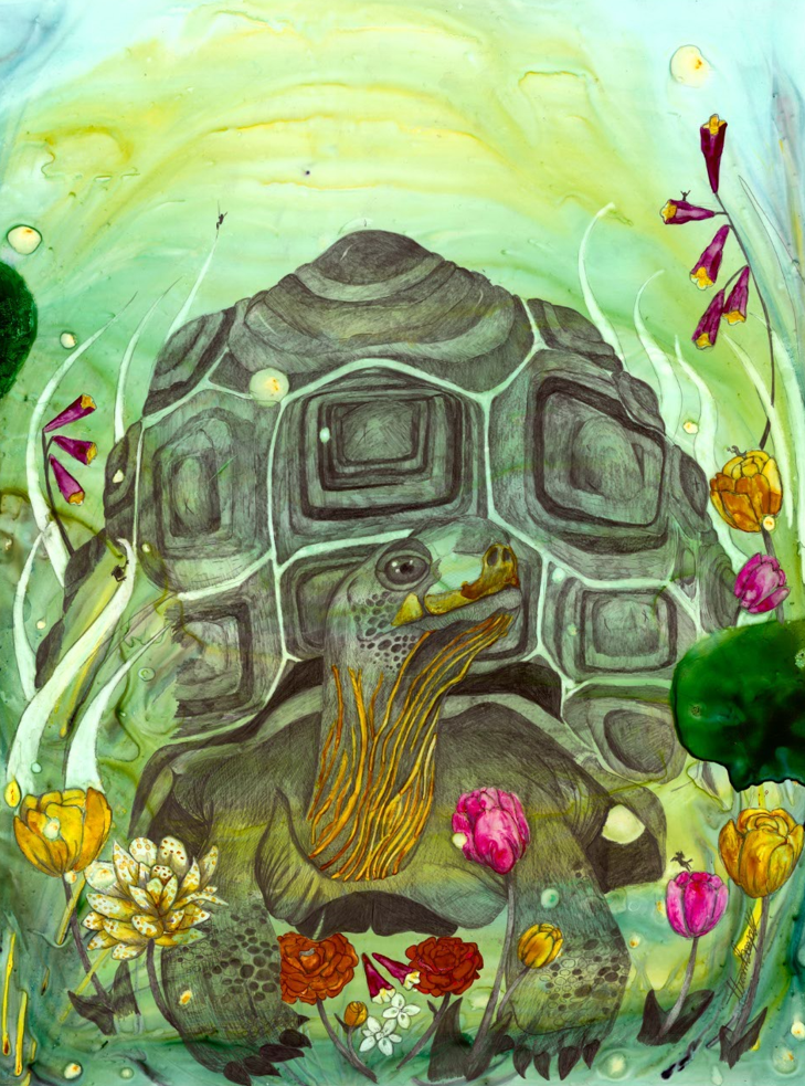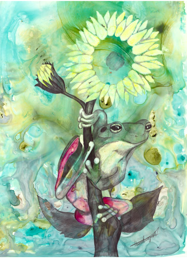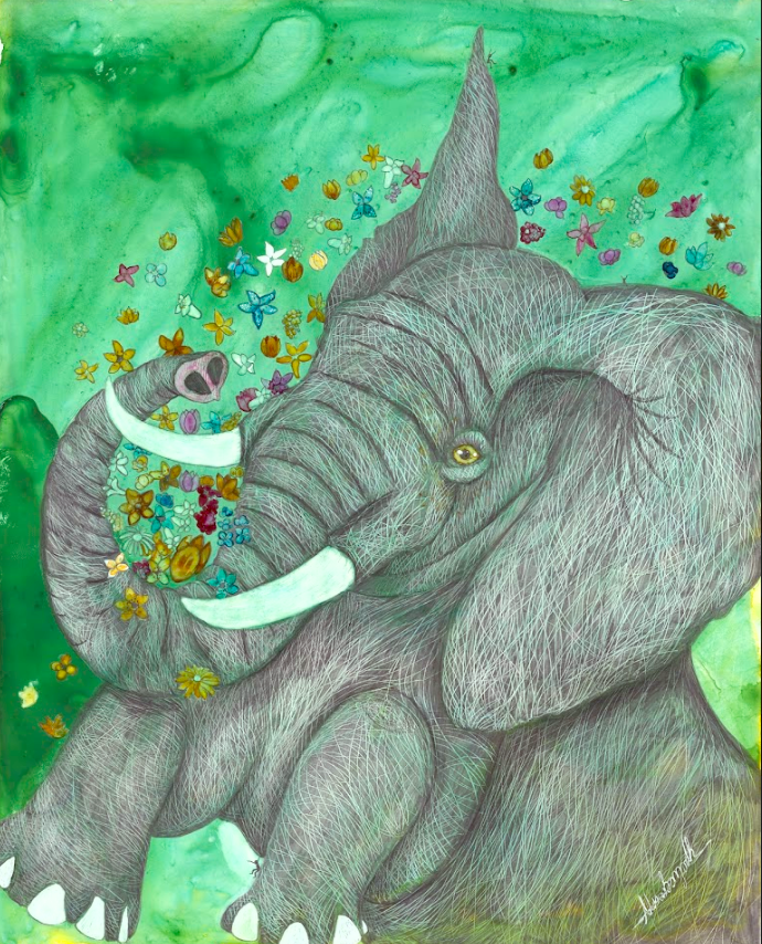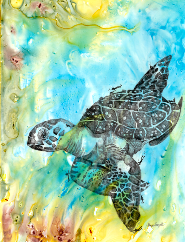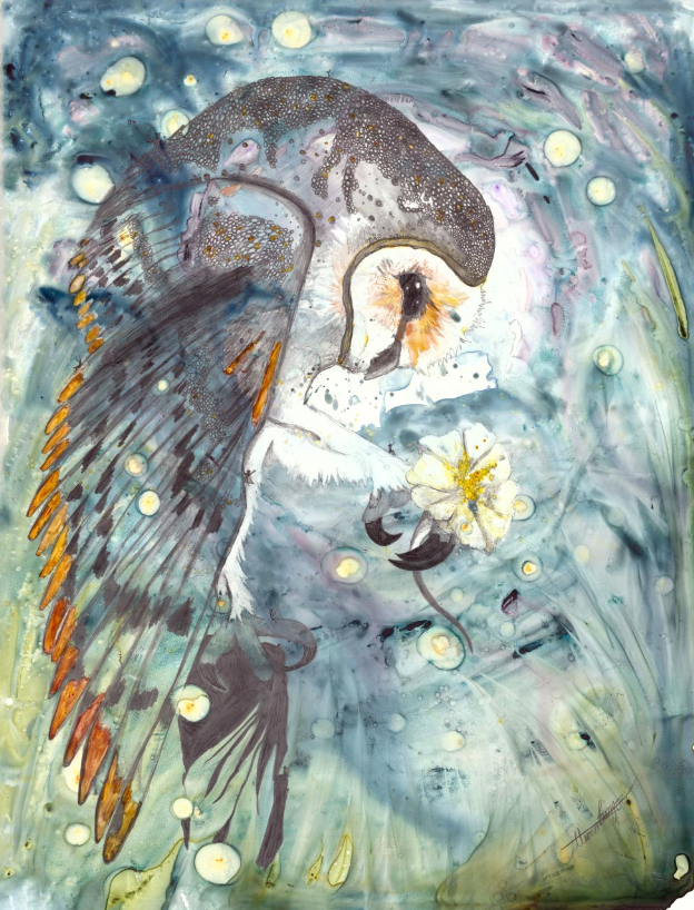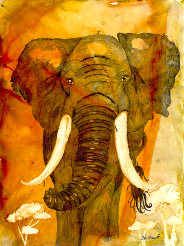 Ik streef ernaar om mensen met de natuur en dieren te verbinden door middel van mijn visuele concept om een geheim venster te creëren op die wereld waar mensen zichzelf terug in de natuur kunnen „zien” door dit interactieve kunstwerk te hebben. Abstracte schilderijen worden gemaakt met schitterende aquarellen als basis. Vervolgens leg ik de kleuren in lagen, ets ze in het papier voor details en bouw ik textuur op. De illustratie is met grafiet over het schilderij getekend voor uitgebreide details, schaduwen en perspectief. Extra kleurlagen met copic, gelpen en/of inkt worden toegevoegd om specifieke dier- en milieukenmerken te benadrukken. Het dier heeft kleine mensen verborgen voor schaal, interesse en als metafoor om mensen te helpen het dier op de planeet te houden. Het kunstwerk is op een houten paneel gemonteerd en verzegeld met archiefspray en verschillende lagen encaustiek van museumkwaliteit. Het „open” karakter van het eindproduct stelt de kijker in staat om het beeld van dichtbij te bekijken, en hopelijk kan het volledig tot zijn recht komen in wat het stuk te bieden heeft!