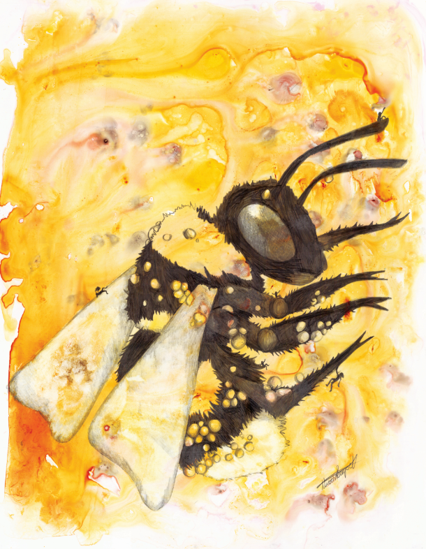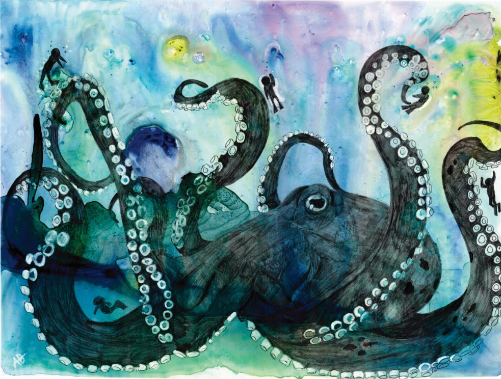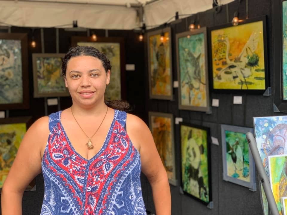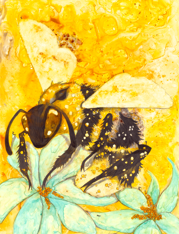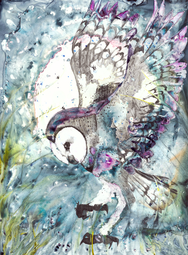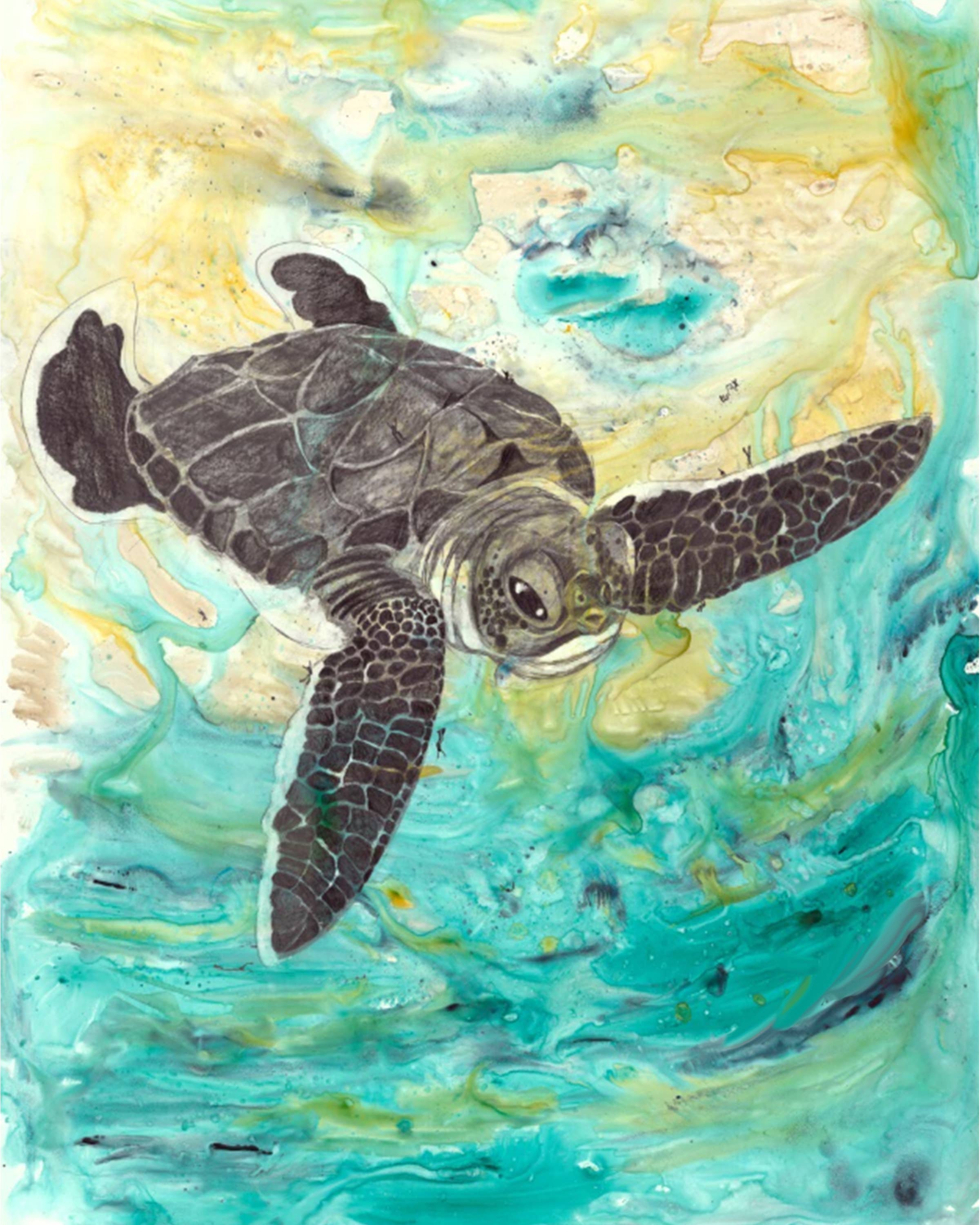 Ik streef ernaar om mensen met de natuur en dieren te verbinden door middel van mijn visuele concept om een geheim venster te creëren op die wereld waar mensen zichzelf terug in de natuur kunnen „zien” door dit interactieve kunstwerk te hebben. Abstracte schilderijen worden gemaakt met schitterende aquarellen als basis. Vervolgens leg ik de kleuren in lagen, ets ze in het papier voor details en bouw ik textuur op. De illustratie is met grafiet over het schilderij getekend voor uitgebreide details, schaduwen en perspectief. Extra kleurlagen met copic, gelpen en/of inkt worden toegevoegd om specifieke dier- en milieukenmerken te benadrukken. Het dier heeft kleine mensen verborgen voor schaal, interesse en als metafoor om mensen te helpen het dier op de planeet te houden. Het kunstwerk is op een houten paneel gemonteerd en verzegeld met archiefspray en verschillende lagen encaustiek van museumkwaliteit. Het „open” karakter van het eindproduct stelt de kijker in staat om het beeld van dichtbij te bekijken, en hopelijk kan het volledig tot zijn recht komen in wat het stuk te bieden heeft!