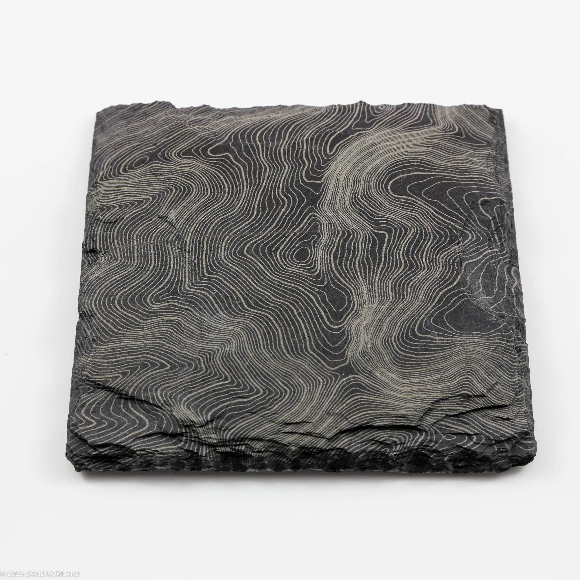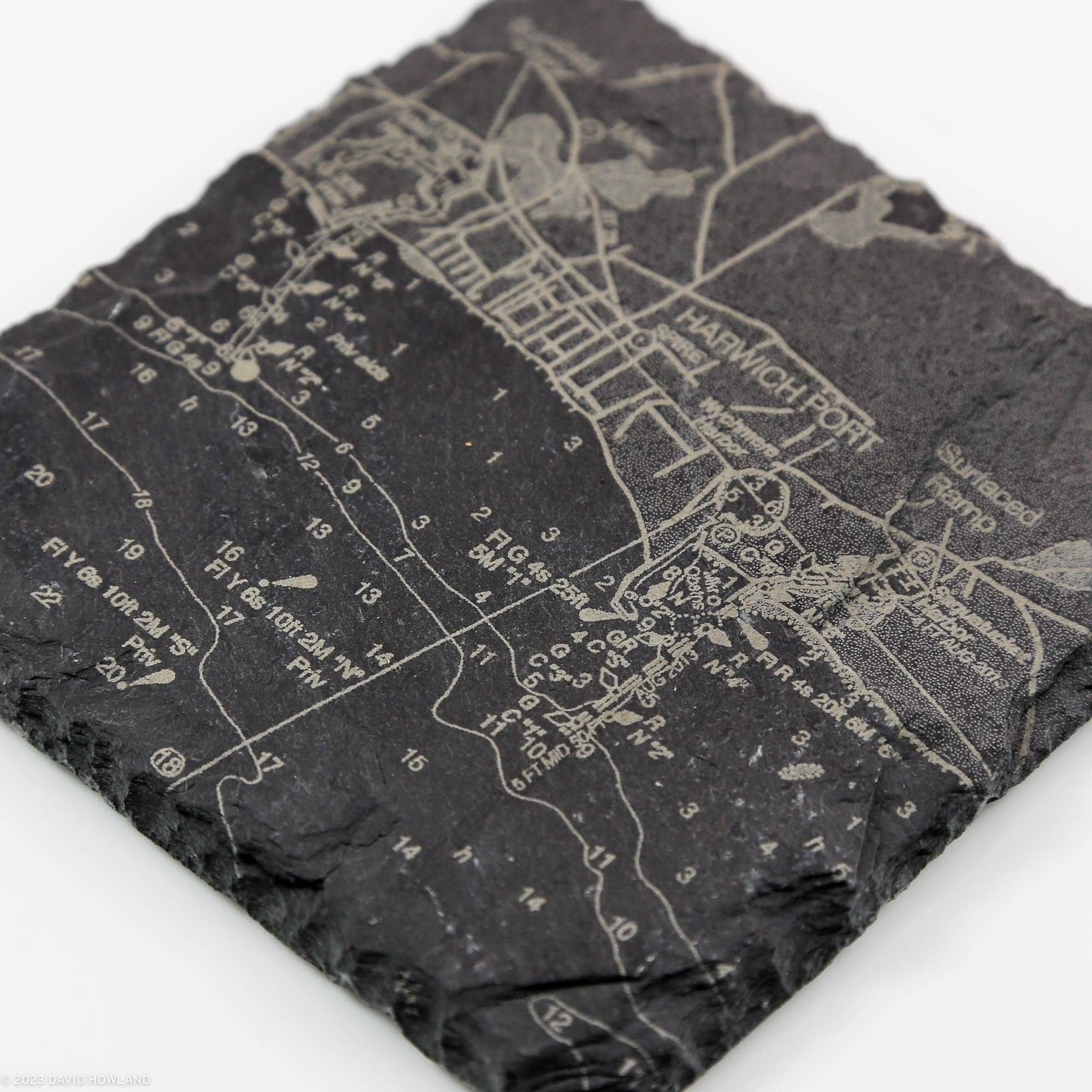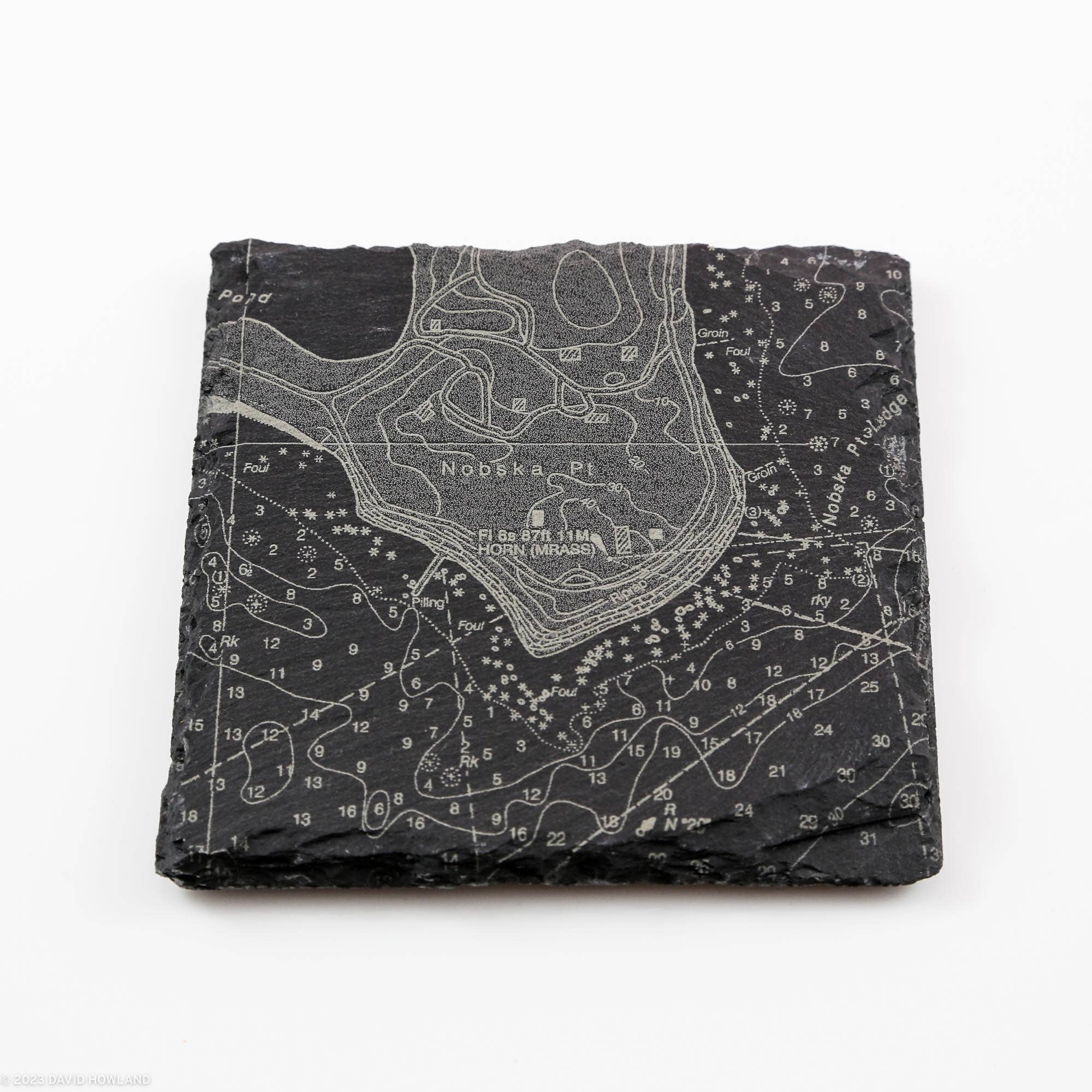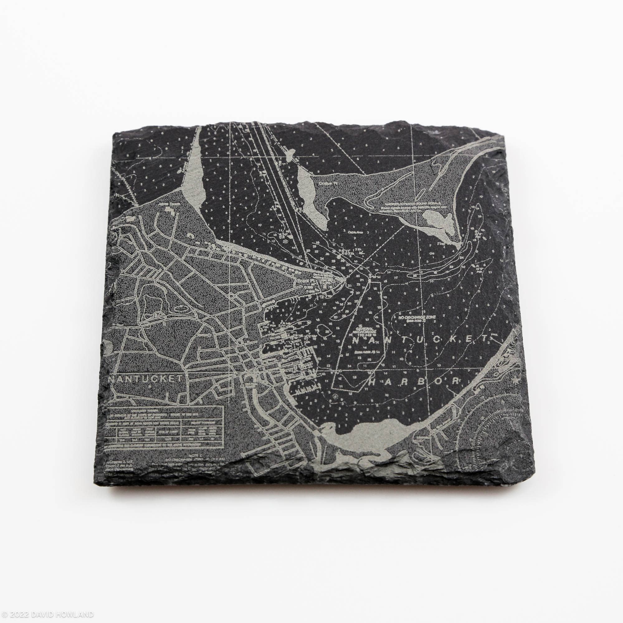 Ik heb altijd van kaarten gehouden, vooral contourkaarten. Terwijl ik in de Witte Bergen wandelde, keek ik over de kaarten die paden en ravijnen over de bergkammen volgden. Ik vond het leuk om meer vertrouwd te raken met deze kaarten door leisteenonderzetters te maken die zijn gegraveerd met de contourlijnen en paden van de bergen van New England. Ik ben onlangs ook begonnen met het verkennen van de kaarten die beschikbaar zijn bij NOAA om nautische kaarten te graveren van de havens en oceanen rond mijn huis op Cape Cod.