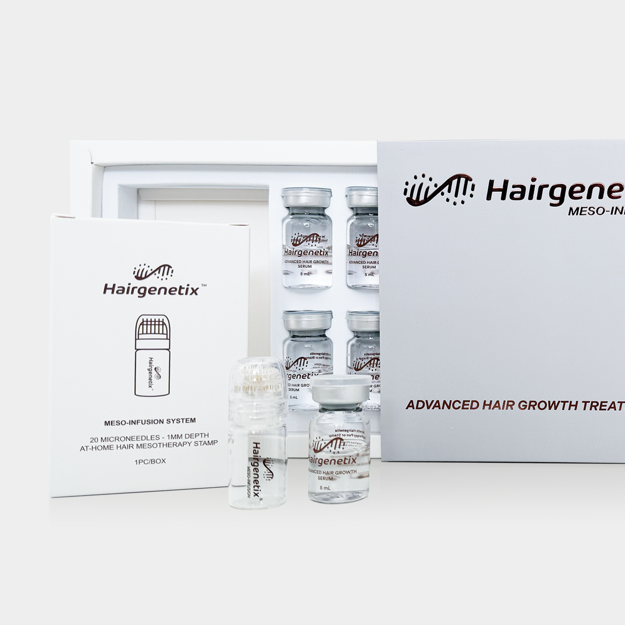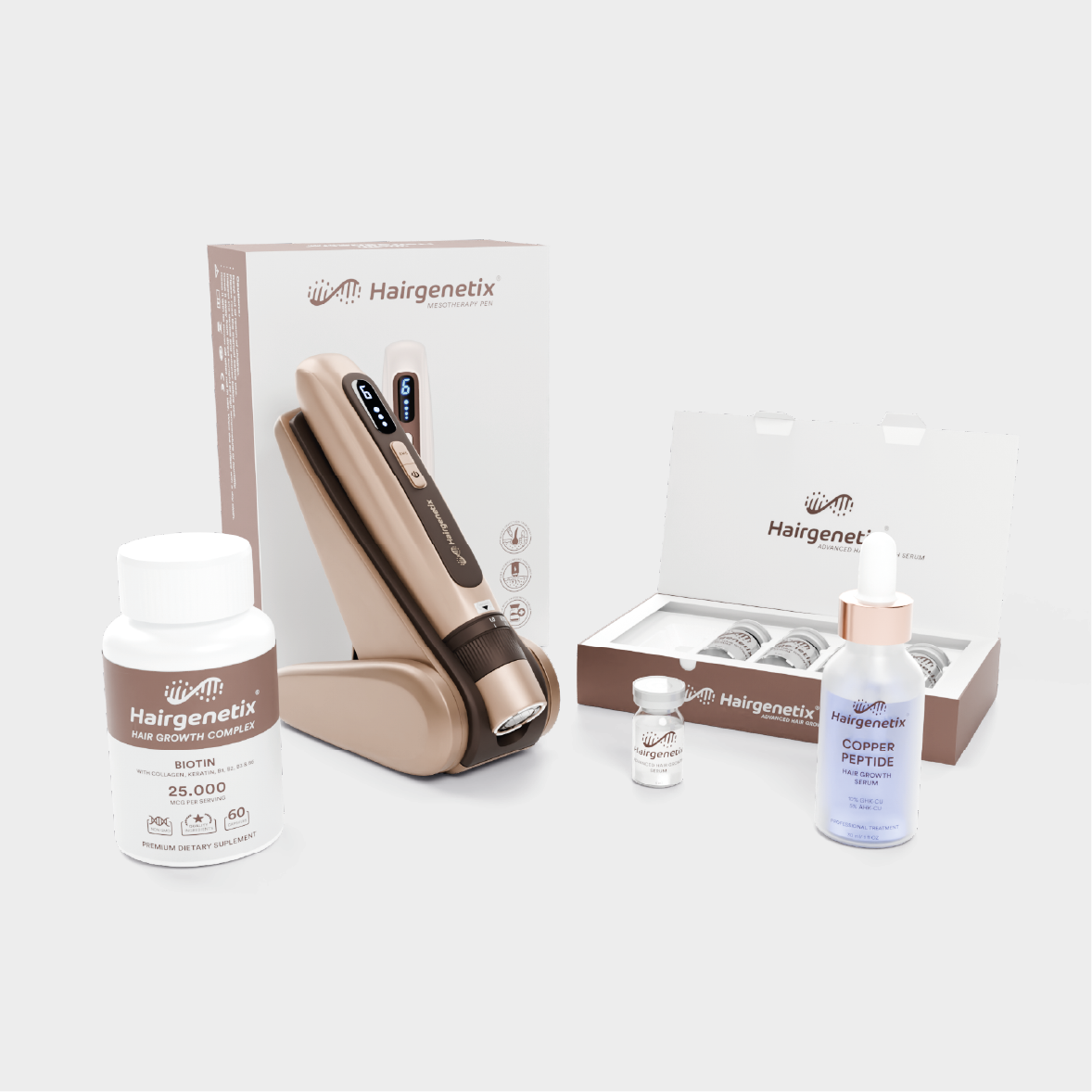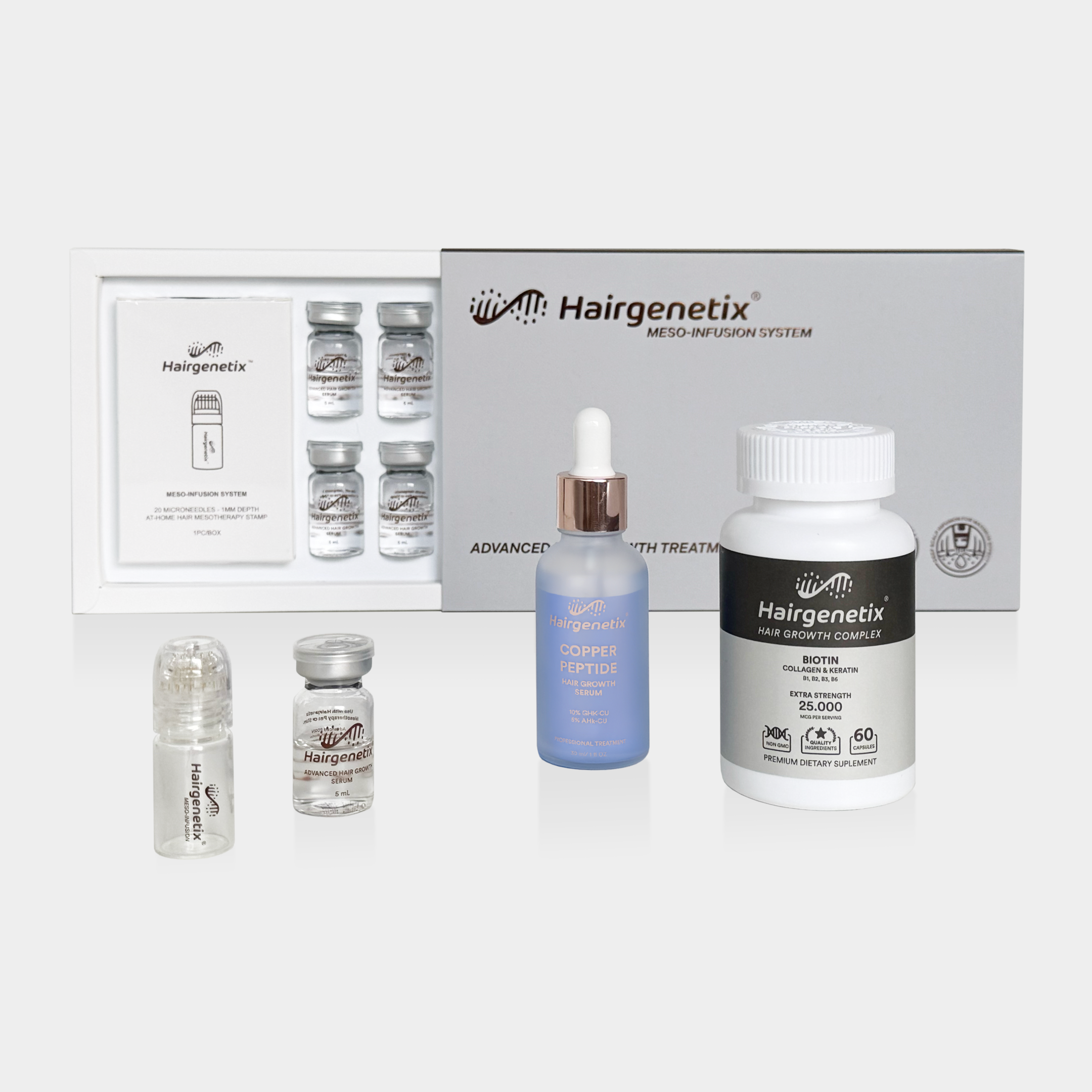 Hairgenetix is a Dutch brand specialized in advanced hair growth solutions, developed for people who expect real results - not just marketing claims. Our formulas are built around GHK-Cu (copper peptides), one of the most extensively researched bioactive ingredients in the field of hair growth and scalp health. This peptide is known for its ability to stimulate hair follicles, prolong the hair growth phase, and help reduce excessive hair shedding. Its effects have been widely studied in scientific research and form the foundation of our product development. In addition to our copper peptide collection, Hairgenetix also offers a professional meso pen - an accessible at-home alternative to clinical mesotherapy. Through controlled micro-perforations in the scalp, active ingredients can be delivered deeper into the hair follicles, exactly where they are most effective. A treatment method that was previously only available in clinics is now accessible for home use. Suitable for both men and women, Hairgenetix responds to the growing demand for ingredient-driven, scientifically supported hair care. Our customers consciously choose high-quality formulas, transparent ingredients, and solutions designed with real results in mind.