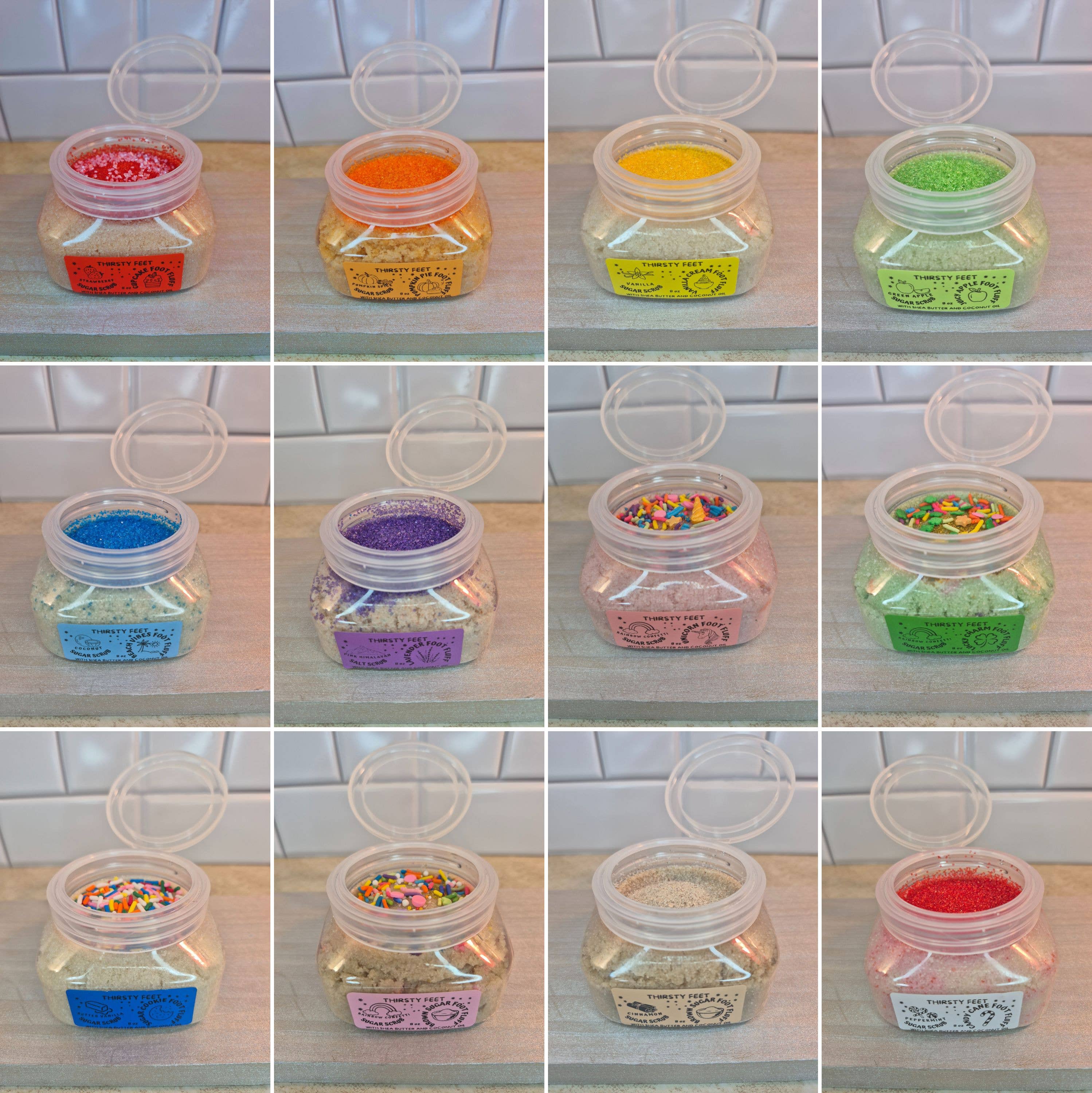 Verwen jezelf met THIRSTY FEET®️ Foot Fluff Intense Moisturizing Exfoliator! Vochtinbrengende ingrediënten laten je voeten er geweldig uitzien en aanvoelen! Zeg vaarwel tegen schadelijke chemicaliën en hallo tegen natuurlijke ingrediënten! Gemaakt met pure Afrikaanse sheaboter en kokosolie, boordevol vitamines en essentiële vetzuren die de huid voeden en verzorgen. Ook goed te gebruiken als bodyscrub voor handen, ellebogen en knieën. Verheldert ook oude tatoeages! Thirsty Feet Foot Fluff is ontstaan nadat ik meer dan 25 jaar last had van extreem droge voeten. Elke keer dat ik sandalen wilde dragen, moest ik mijn voeten in vaseline weken en 's nachts sokken dragen. Maar wie wil er nu in sokken slapen, toch? Thirsty Feet Foot Fluff is een verbazingwekkend natuurlijke voetscrub. Er zijn geen schadelijke chemicaliën, geen schadelijke geuren, geen essentiële oliën en geen toegevoegde conserveermiddelen. "Een traktatie voor je voeten!" Thirsty Feet Foot Fluff biedt verschillende varianten om uit te kiezen, allemaal beginnend met dezelfde basisingrediënten, gemaakt in kleine batches, en vervolgens door het toevoegen van verschillende geuren en sprinkles wordt elke variant aantrekkelijk! Een regenboog van kleuren laat je voeten er geweldig uitzien en aanvoelen! Thirsty Feet biedt verschillende geuren en thema's voor elk seizoen, feestdag of gelegenheid! Verwen jezelf en hydrateer die dorstige voeten!