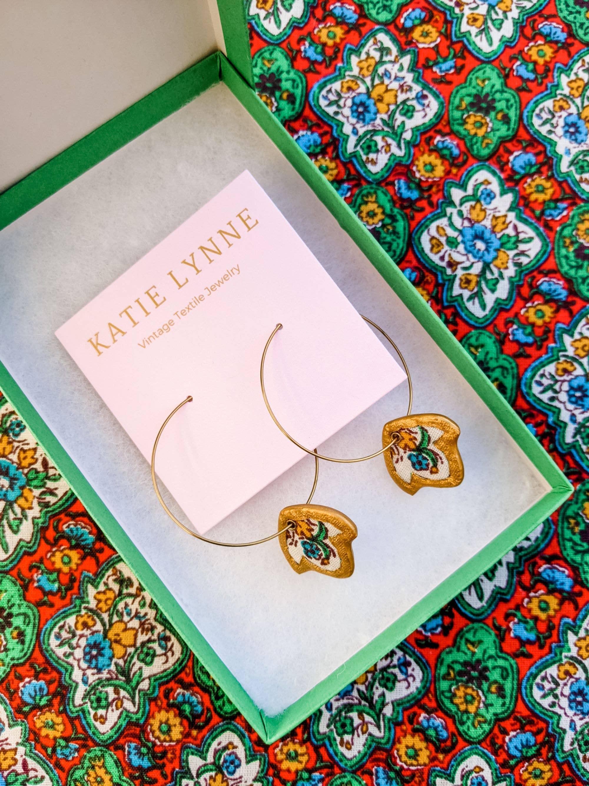 Katie Lynne - Vintage Textile Jewelry is met de hand genaaid, met de hand gesneden en met de hand beschilderd met vintage stoffen uit de late jaren 1800 tot de jaren 1990. De stof is met de hand geselecteerd bij de verkoop van onroerend goed, antiekwinkels en bij kleine bedrijven in de VS en in het buitenland. Elk stuk van Katie Lynne wordt geleverd met een handgeschreven notitie met de ouderdom van de gebruikte stof en de herkomst ervan. De missie van het merk is om de vraag naar textiel te verminderen door de mode te vertragen en tijdloze statement-sieraden te creëren voor de moderne persoon.