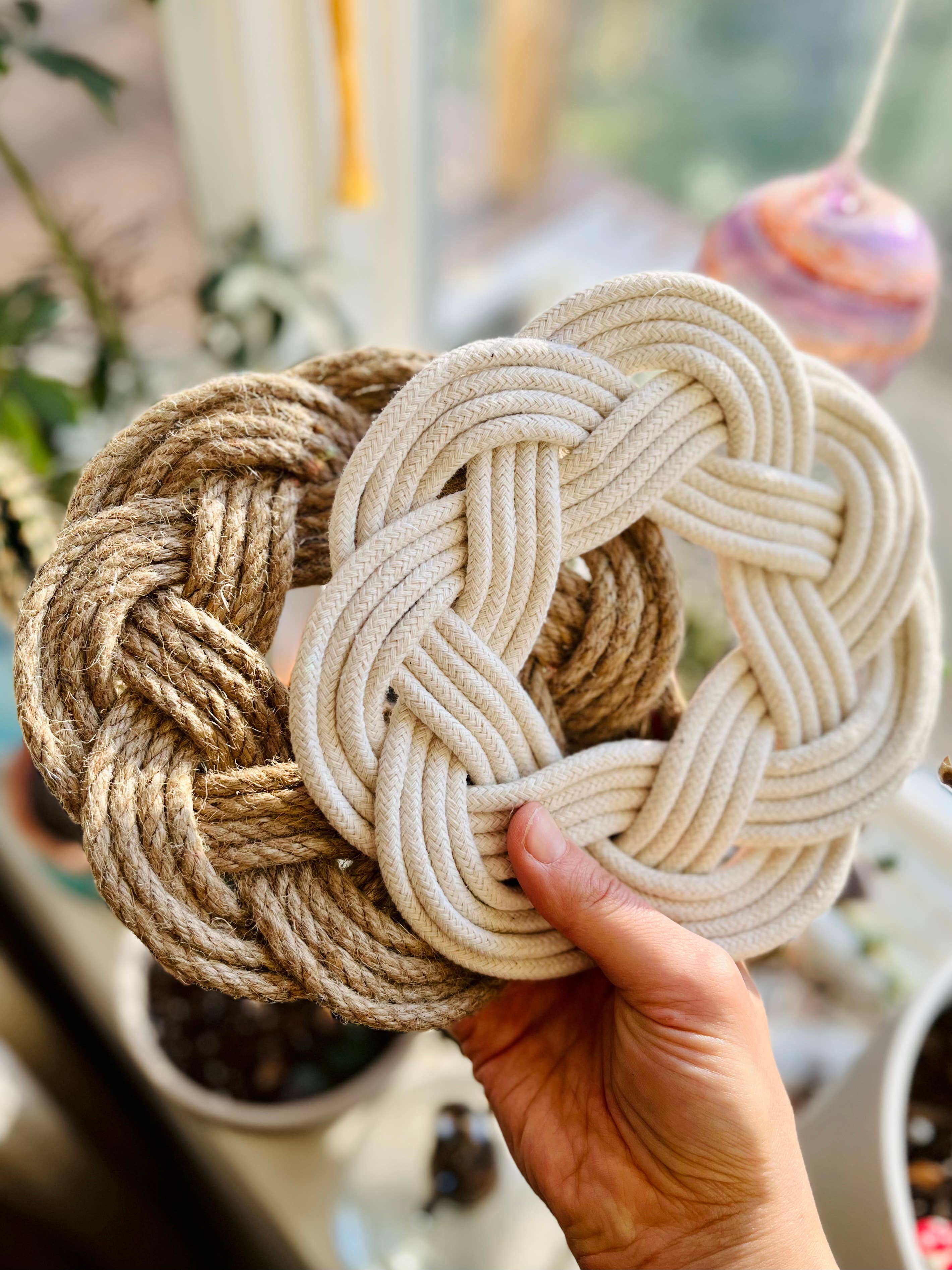 Kleurrijke stevige onderzetter met touw aan de kust Voeg deze feestdagen (en wanneer je maar wilt) een serieus vleugje kleur, textuur en verfijning toe aan elk tafellandschap met deze handgevlochten schoonheid. Elke onderzetter is met de hand gevlochten en gemaakt van 9 mm dik gerecycled gevlochten katoen. De uiteinden zijn bevestigd met niet-giftige lijm om de vorm te behouden. Ronde vorm. Meet ongeveer 9-10" in diameter. Het zachte katoen maakt ze licht en duurzaam. Spot Clean met een doek als het vuil is.