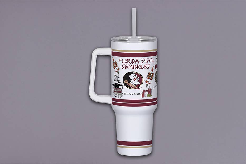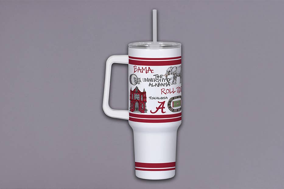 Dubbelwandige metalen beker van 40 ounce met handvat, inclusief plastic rietje en deksel. College gelicentieerd met unieke iconische ontwerpen van elke school.