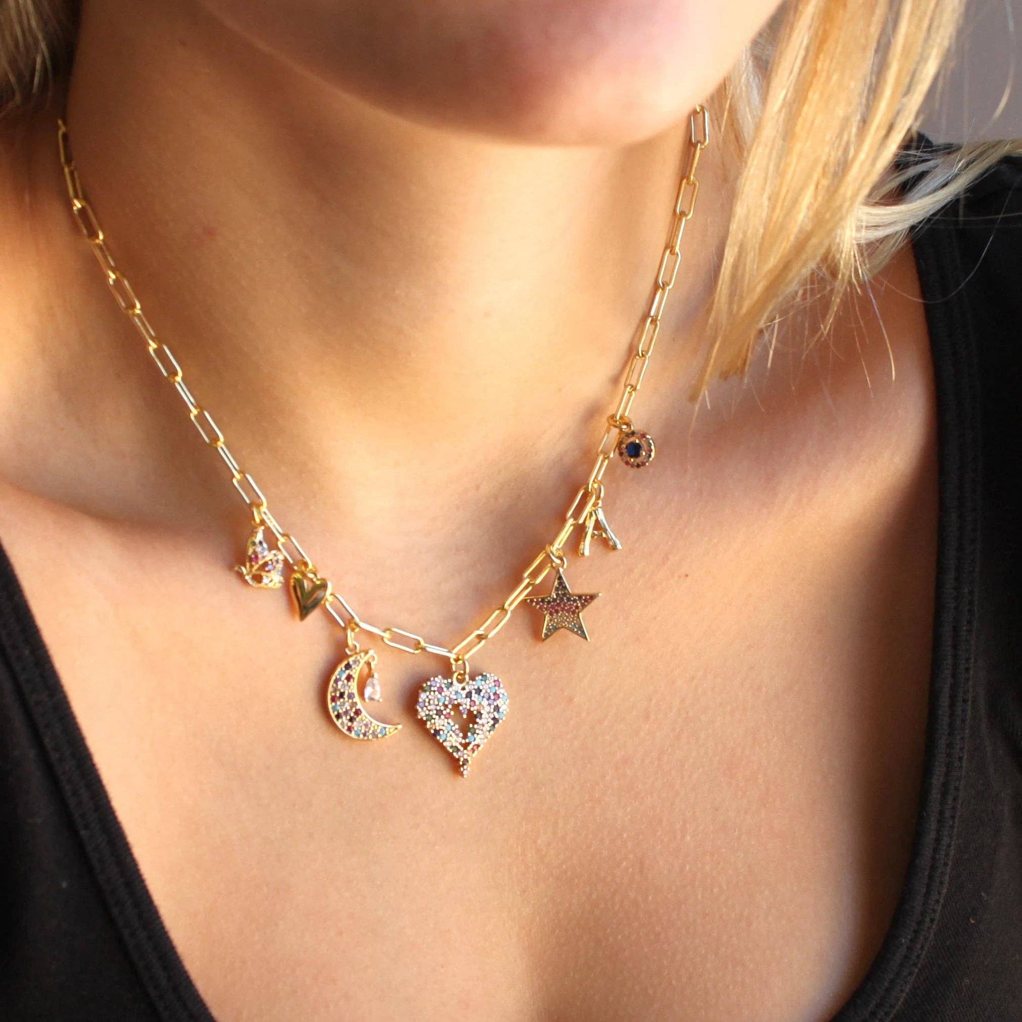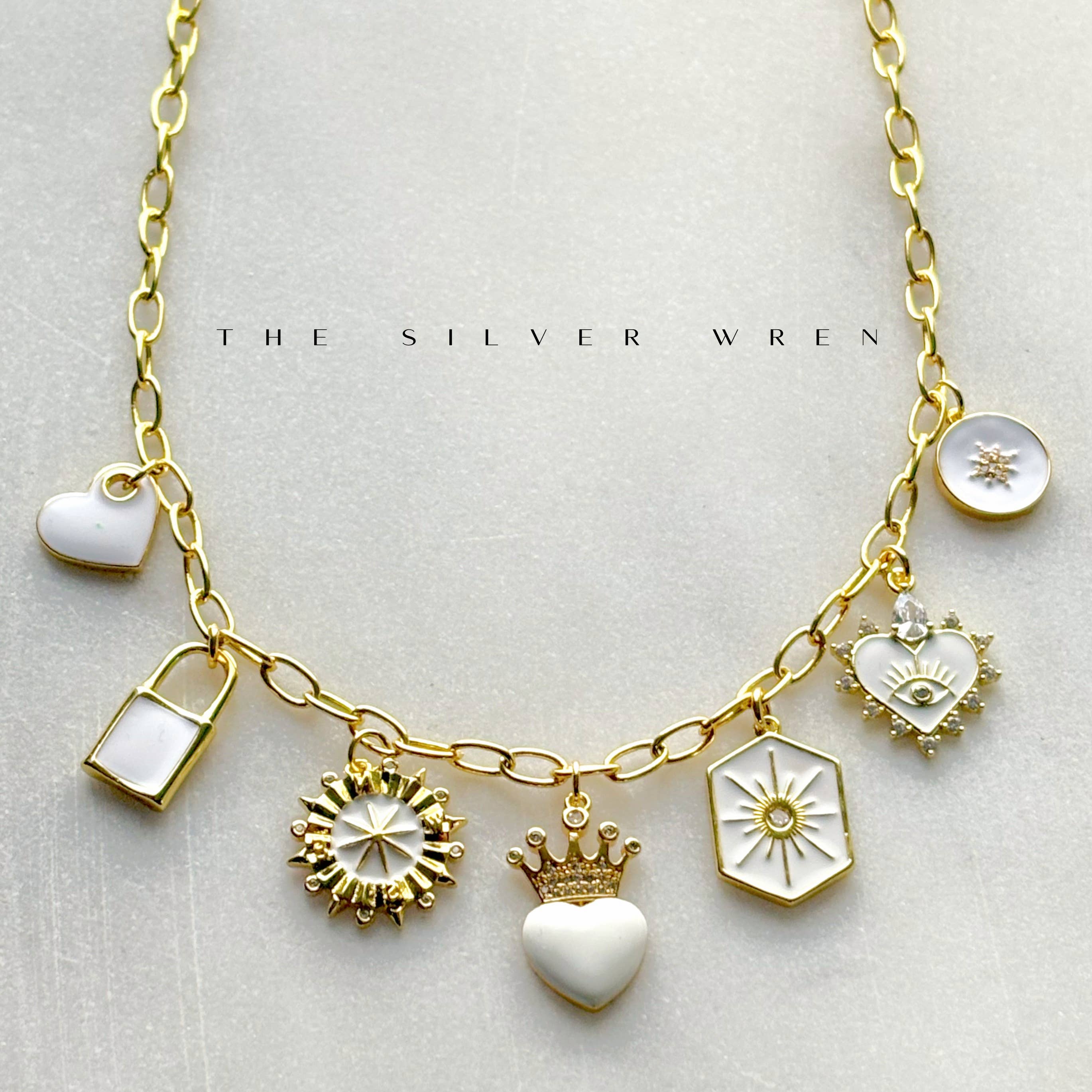 Turkooizen ketting met meerdere bedeltjes Onze ketting met meerdere bedeltjes is de perfecte manier om je sieradenstijl uit te drukken en een vleugje kleur toe te voegen! Gemaakt op een met 14kt goud gevulde mini-paperclip-ketting en een verscheidenheid aan 7 verschillende bedeltjes, zal deze ketting een statement maken! • Vergulde bedeltjes • Natuurlijke turquoise bedeltjes • 24-karaats verguld - vrij van lood, nikkel en cadmium • Zware beplating, aanslagbestendig, watervriendelijk • Met 14kt goud gevulde mini-paperclip-ketting