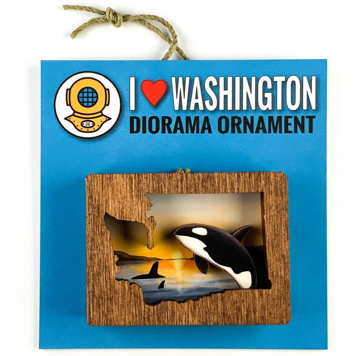Het diorama van Washington toont een iconische veerboot van de staat Washington Verkrijgbaar als ornament of magneet Washington Diorama Ornaments zijn gemaakt van gelaagd hout om een driedimensionale scène met ongelooflijke details te creëren. Ornamenten zijn gemonteerd op een opvallende vierkante blauwe kaart van 3" en hangen met een hennepkoord. Magneten zijn gemaakt met een sterke zeldzame-aardemagneet ingebed in de achterkant