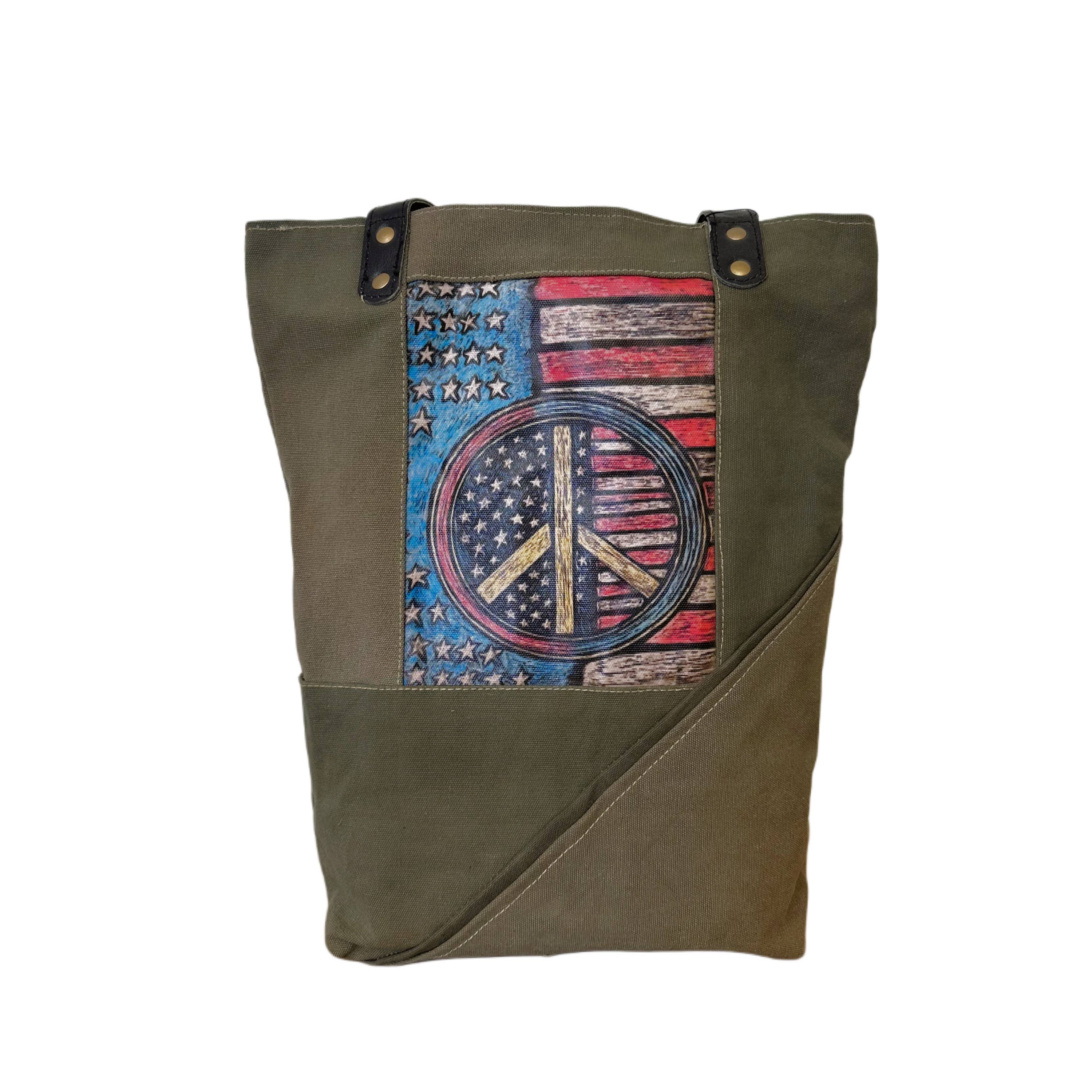 Onze tenttas is handgemaakt van gerecycled militair tentdoek in een patchworkontwerp aan de voorkant. Het heeft een ritssluiting bovenaan, een ritsvak aan de achterkant, een open binnenvak en is volledig gevoerd. DISCLAIMER: Onze gerecyclede militaire tenttassen zijn een eerbetoon aan en een herinnering aan de offers en bijdragen van militaire veteranen. Weet dat deze tassen zijn gemaakt van authentieke gebruikte militaire tenten en niet van gloednieuw canvas dat als gerecyclede tenten of zeilen is verpakt. DIT ZIJN DE ECHTE!! Als gevolg hiervan zal het tentmateriaal tekenen van versleten-achtige imperfecties vertonen die bijdragen aan zijn karakter. Elke tas heeft verschillen in echte imperfecties, vlekken en kleuren. Jouw tas zal net zo uniek zijn als de ervaring van elke soldaat die onderdak zocht in deze tenten, of het nu op het oefenterrein was of in een gevechtszone. Alle verkopen zijn definitief. Deze tas meet 14"W x 13"H x 4"D. Deze tas heeft leren handvatten met een royale drop van 12".