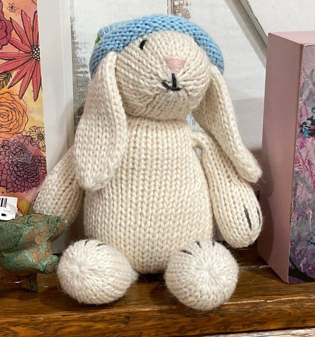 Handgemaakte Gebreide Witte Konijn met Blauwe Zonnehoed Speelgoed