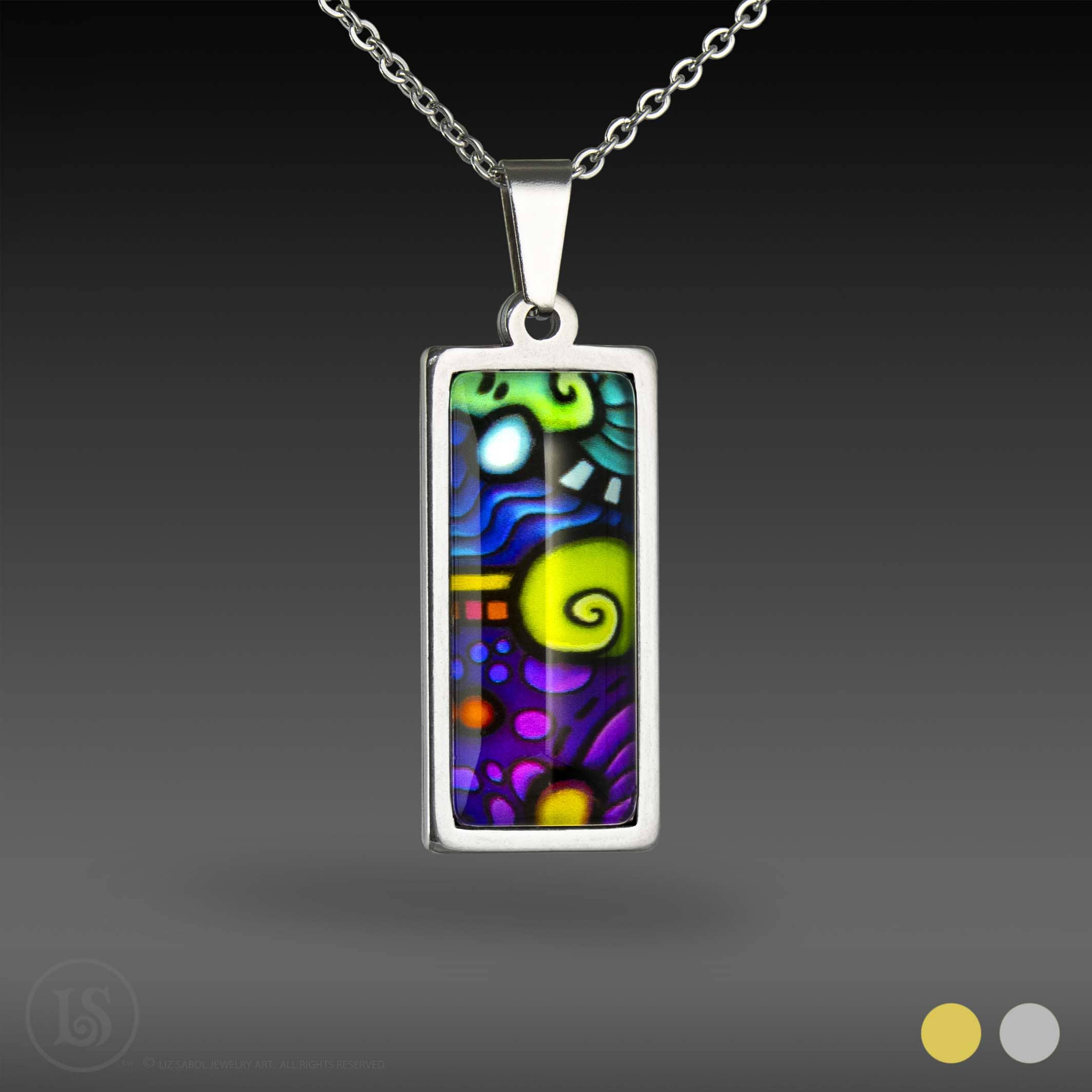 Dit is een hoogwaardige reproductie in Giclee, kunstdruk uit het archief, met levendige kleuren en een parelmoerachtige glans, van mijn kleurrijke abstracte illustratie #2. Zilverkleurig of goudkleurig. Wordt geleverd met een verstelbare roestvrijstalen ketting van 16" tot 20". Giclee archiefdruk op parelmoerpapier, gemonteerd op roestvrij staal en bedekt met massief glas. Rechthoekige hanger (38 mm x 13 mm x 6 mm) 1,5 mm kabelketting