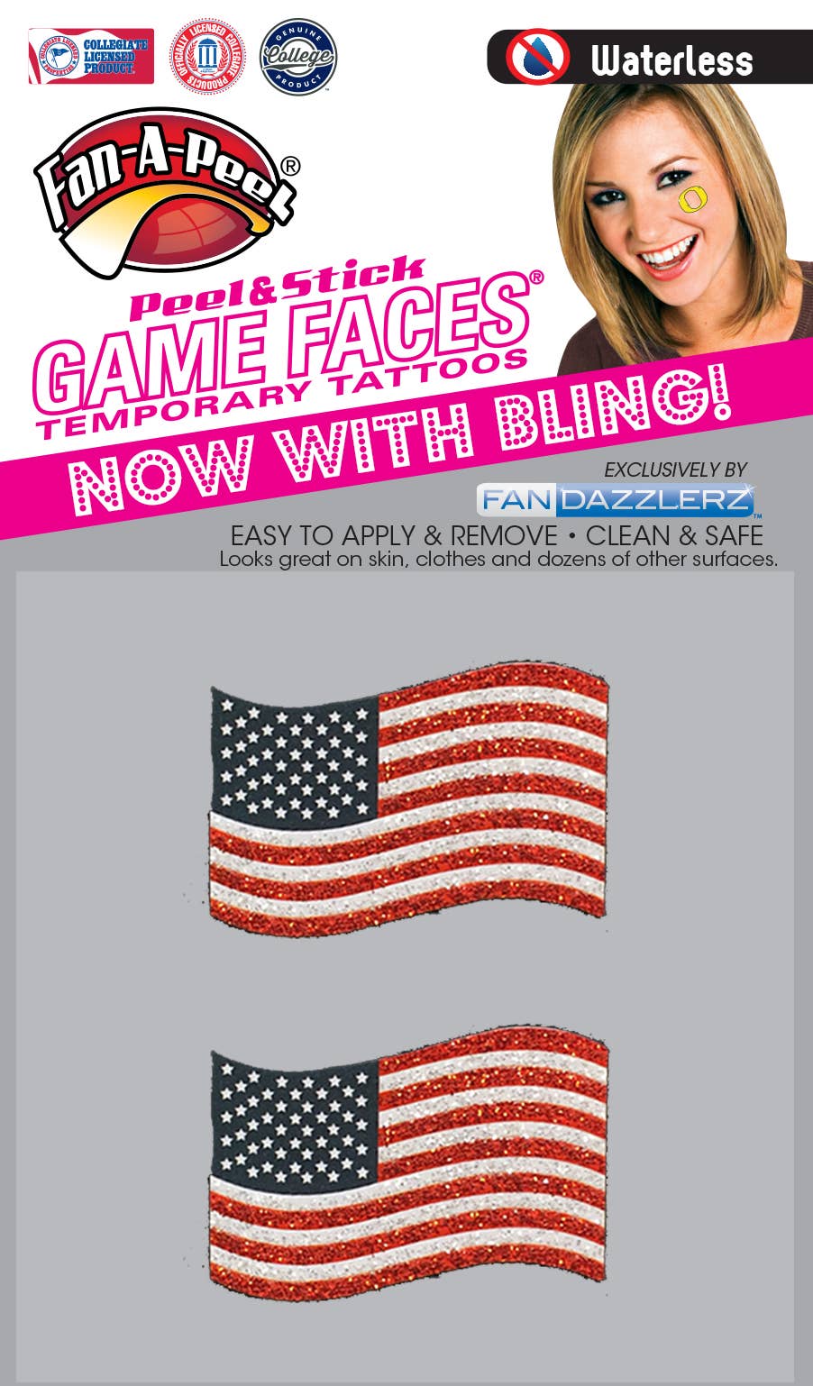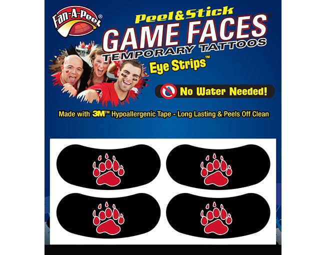 Zet je glitterspelgezicht aan! Voeg wat sprankeling toe aan je glittertattoos van je supportgame Faces®. Elke verpakking bevat 4 tatoeages, elk ongeveer 1,25" x 1,25". Ze zijn gedrukt op huidveilige tape en kunnen eenvoudig worden geplakt en losgemaakt.