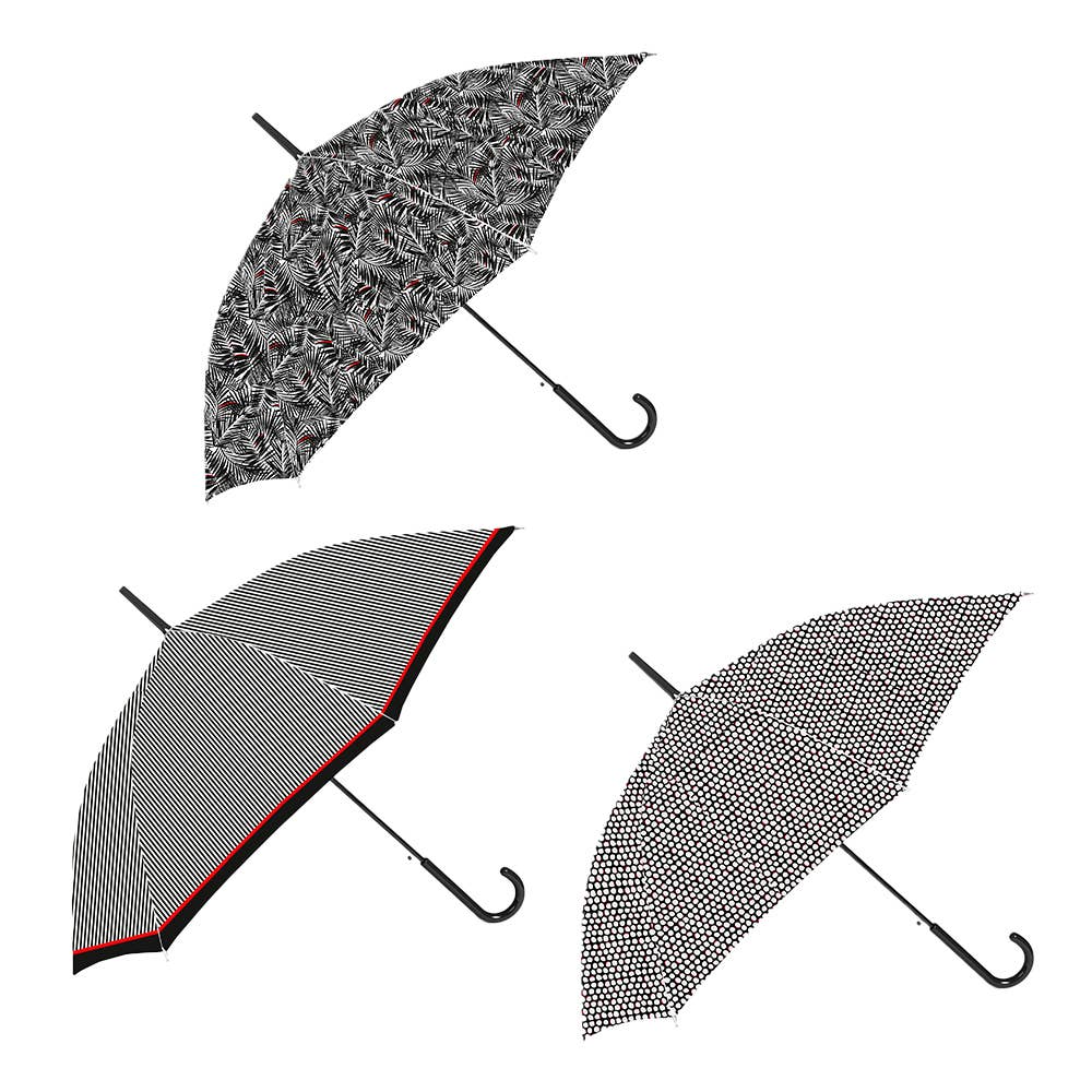 Onze paraplu uit de Cute-collectie heeft een automatisch open- en sluitsysteem voor gemak en snelheid, wat de gebruikservaring aanzienlijk verbetert. Met één druk op de knop open of dicht, ideaal bij onverwachte regenbuien of wanneer je beide handen nodig hebt. Het frame combineert aluminium en metalen onderdelen met flexibele glasvezelstangen, wat zorgt voor sterkte en duurzaamheid. Daardoor weerstaat de paraplu sterke wind zonder te breken of vervormen. Verkrijgbaar in drie unieke zwart-wit prints met rode accenten. • Automatisch openen en sluiten • Windbestendig • 3 secties • Diameter: 96 cm • Gewicht: 275 g • Stokken: 8 van 54 cm • Gesloten lengte: 26 cm